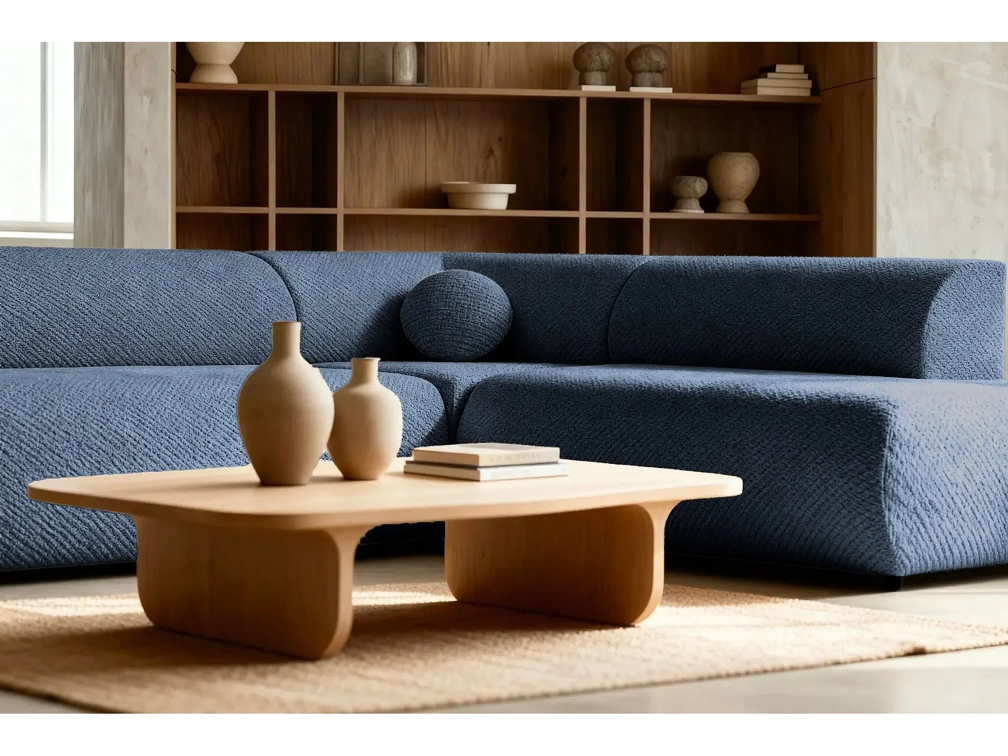 LEVI - Canapé panoramique convertible tissu lisse 5 places - Bleu - Gauche