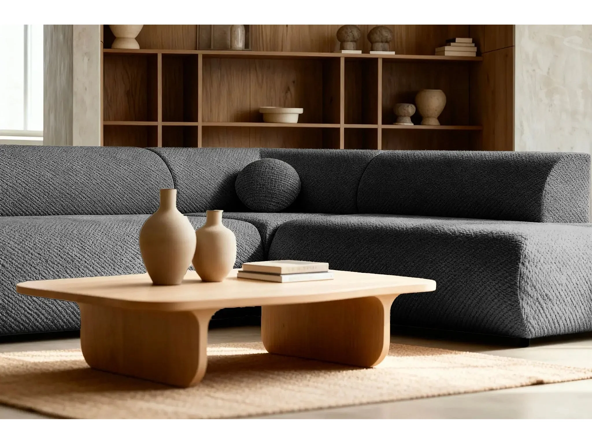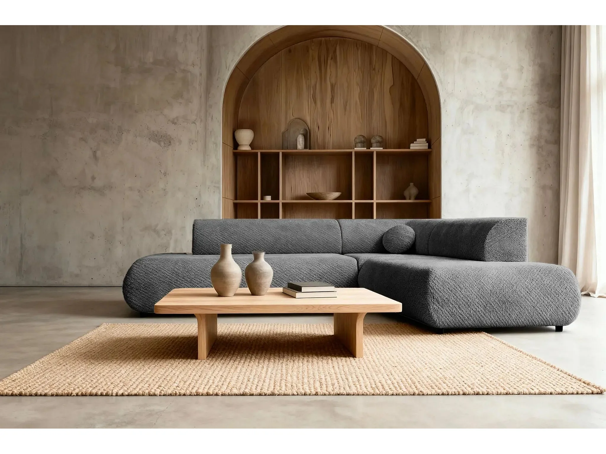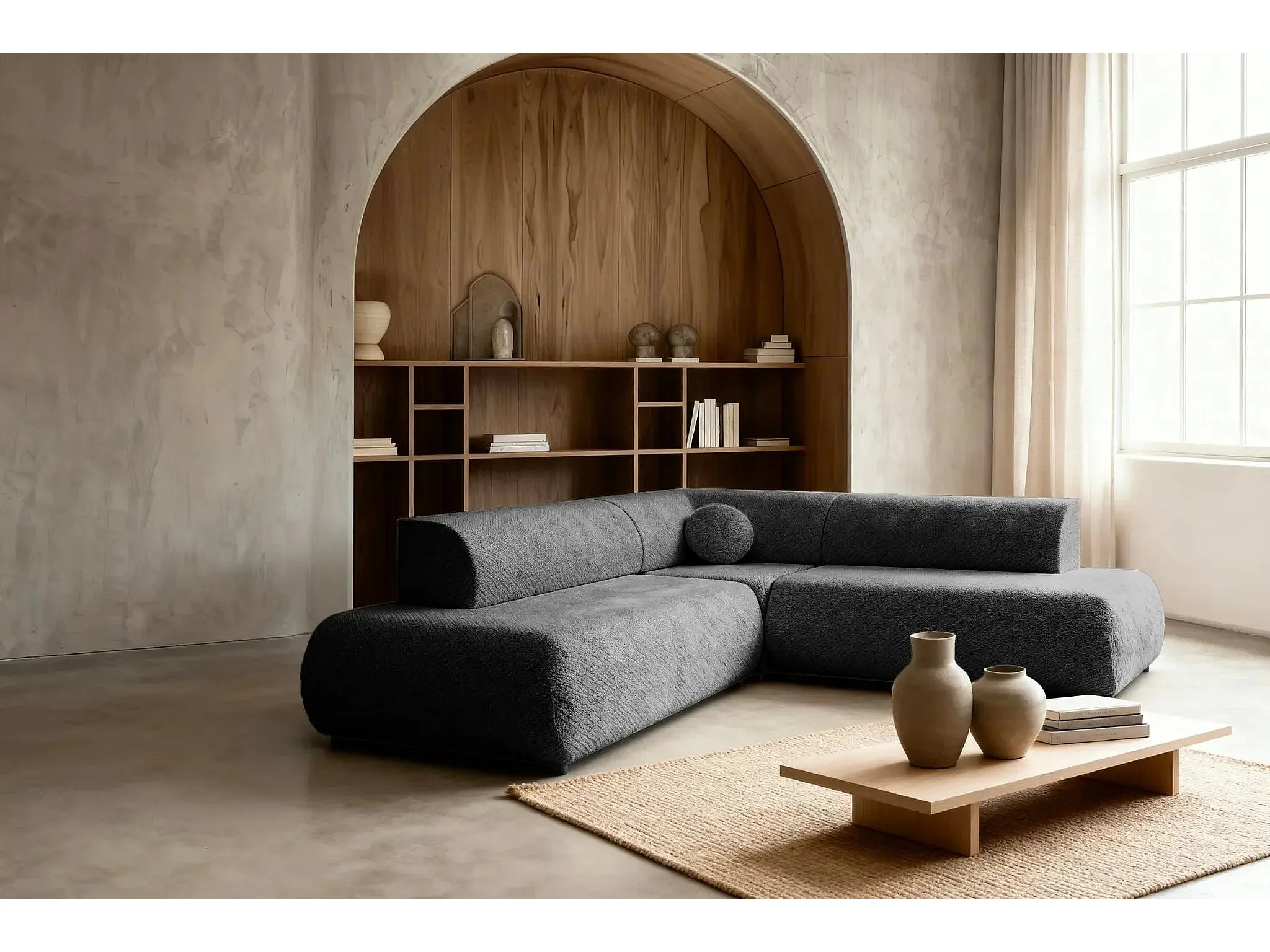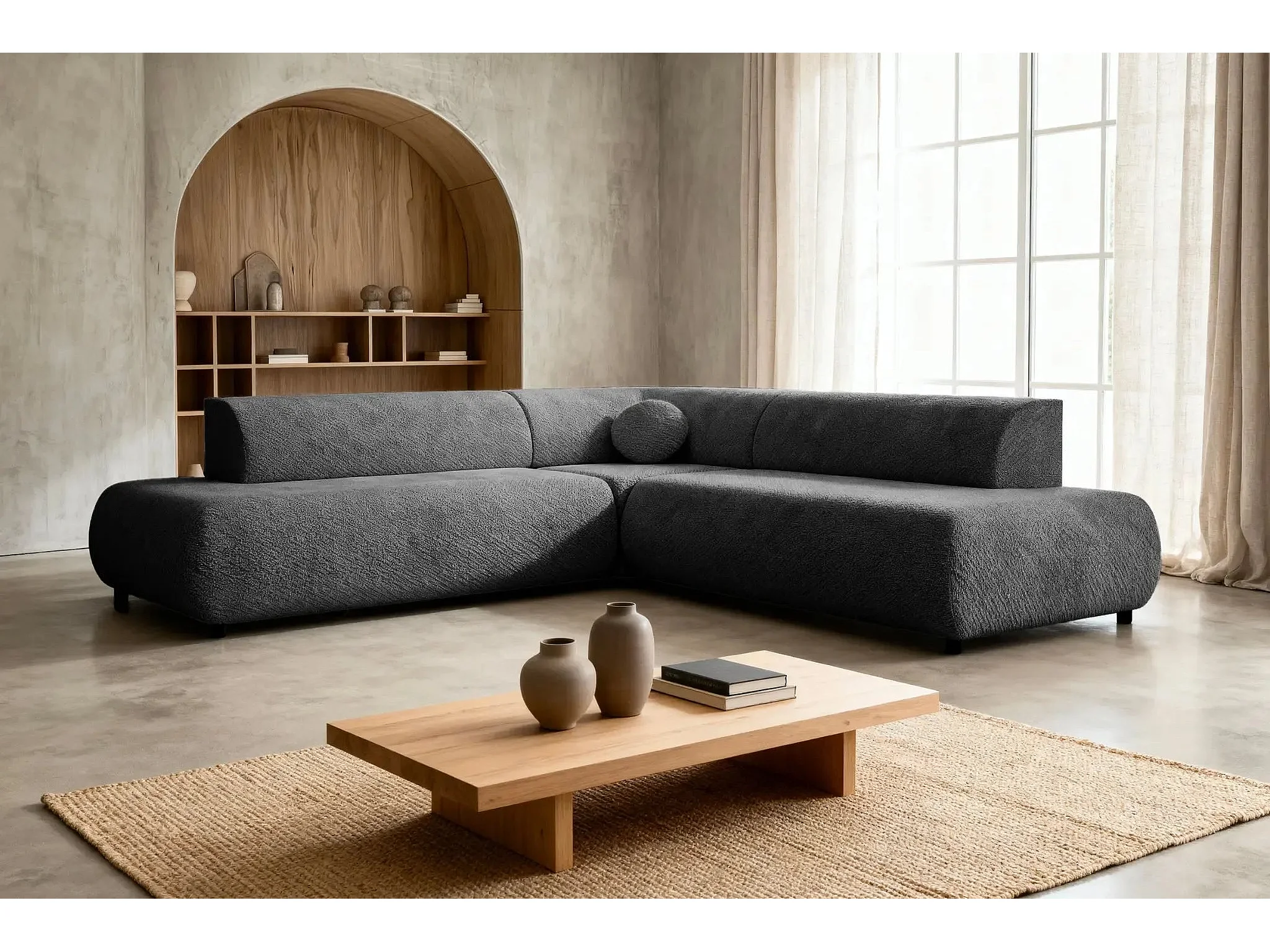 LEVI - Canapé panoramique convertible tissu lisse 5 places - Gris foncé - Gauche