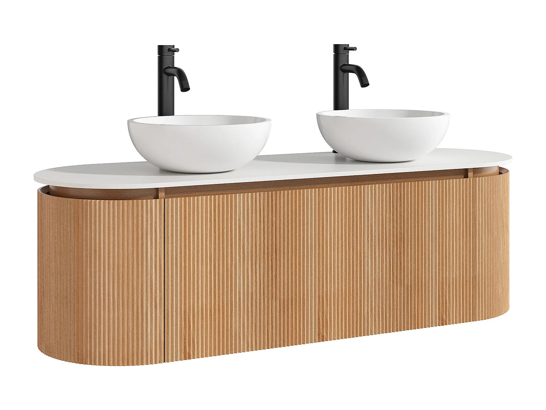 Meuble de salle de bain suspendu strié avec double vasque à poser ronde en solid surface et robinet – Naturel clair - L150 cm - LILIKO