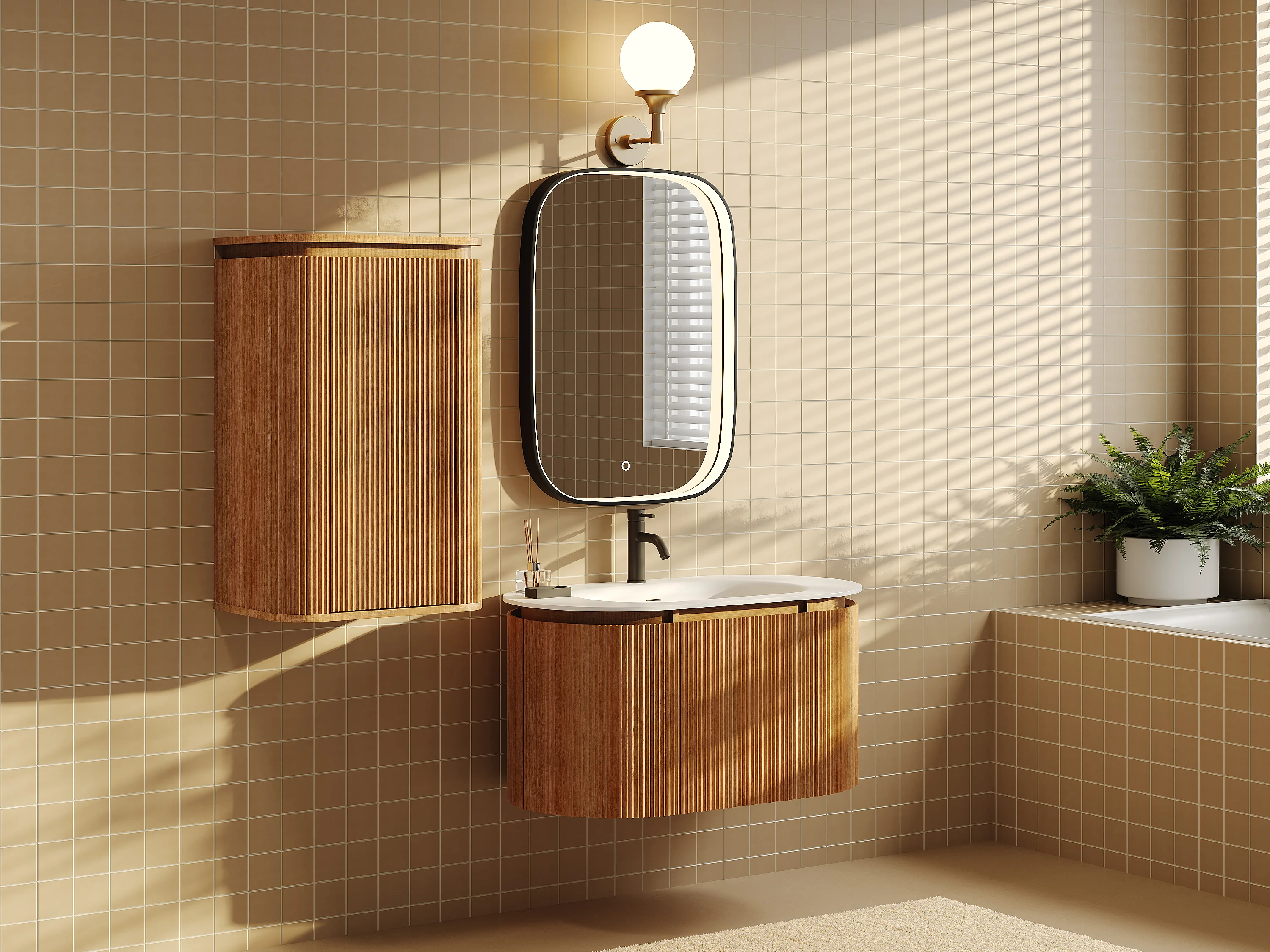 Meuble de salle de bain suspendu strié en bois de frêne avec vasque à encastrer et colonne – Naturel clair - 90 cm - LILIKO
