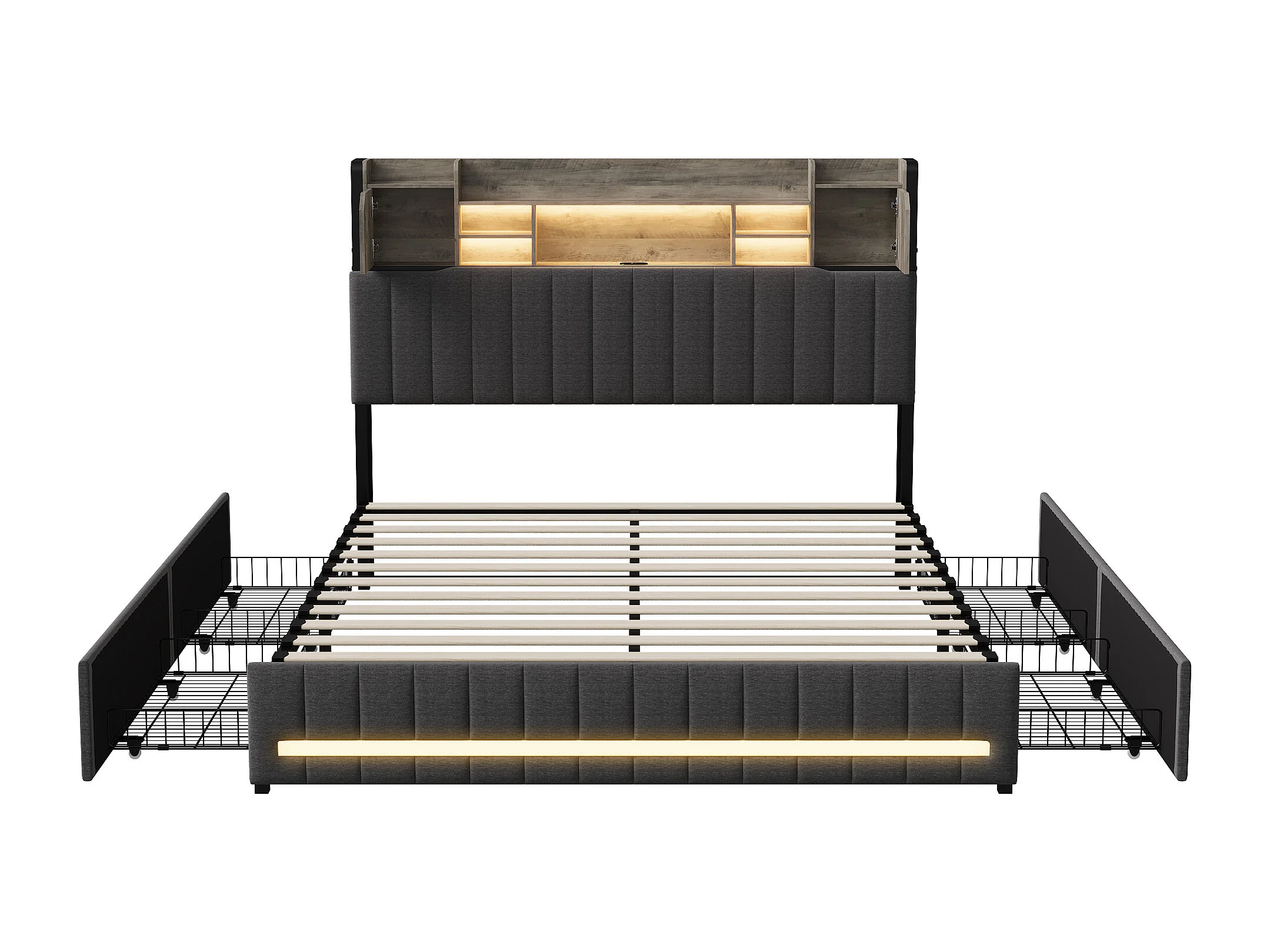 Linge Tissu Cap de lit Compartiments de stockage multiples - Cadre de lit rembourré avec 4 tiroirs et éclairage LED et USB - gris - 140x200cm