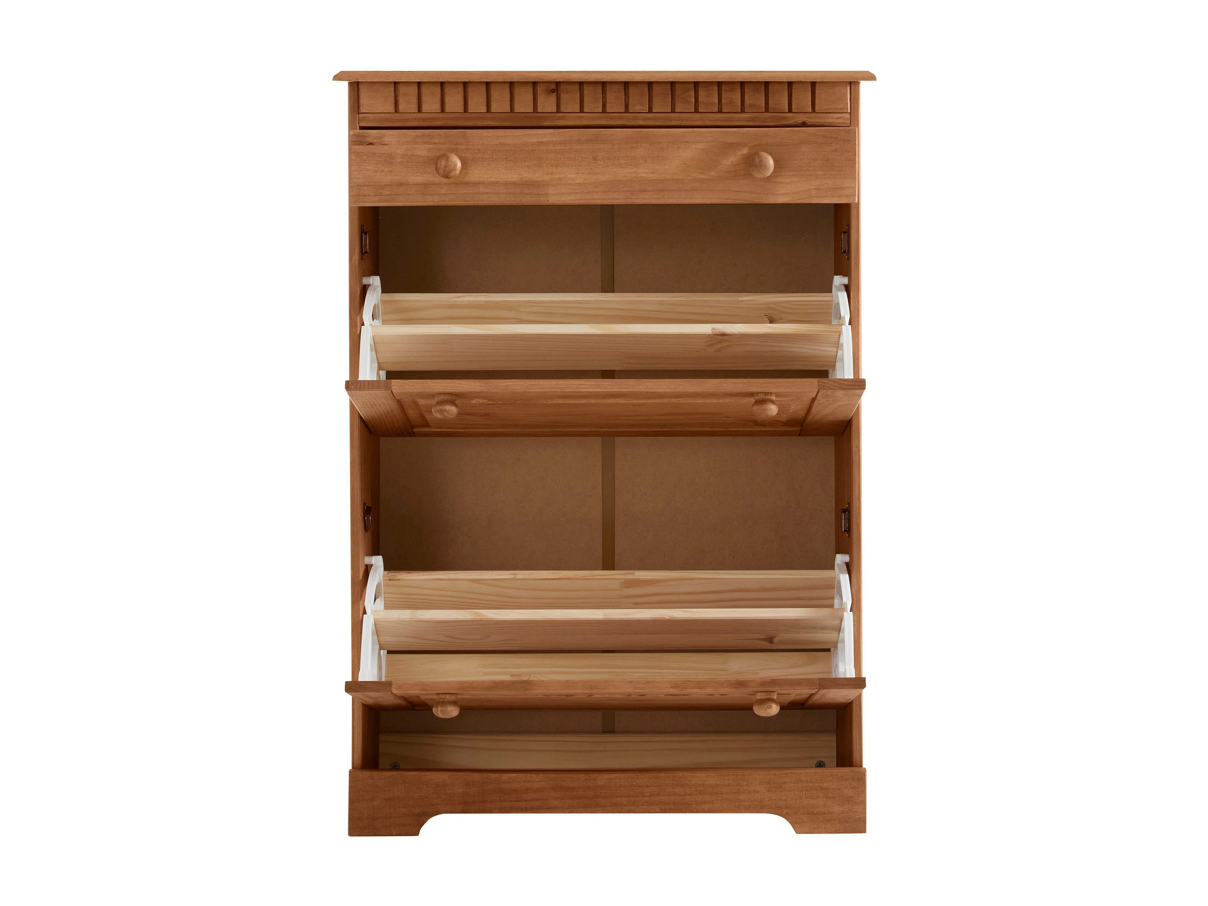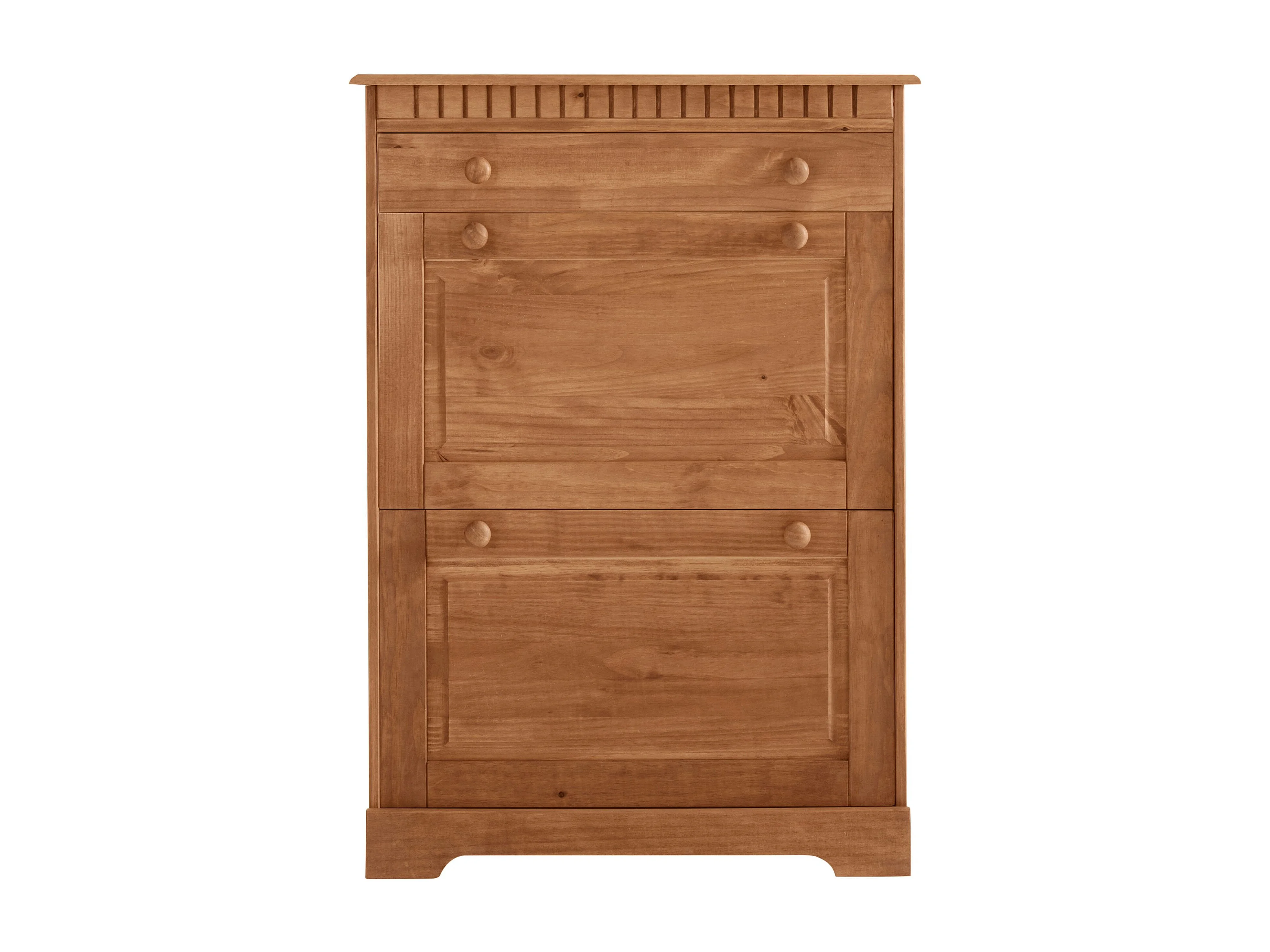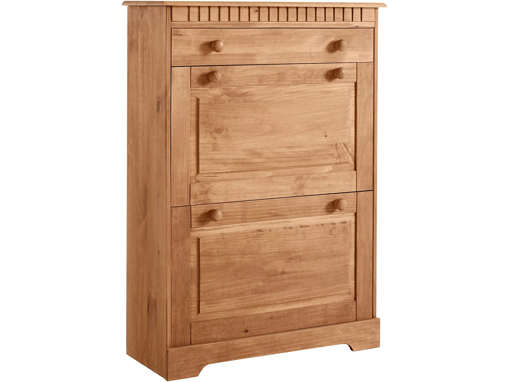 Lisa | Coffre à chaussures avec 2 portes battantes et 1 tiroir en pin naturelCoffre à chaussures avec 2 rabats et 1 tiroir en brun pin