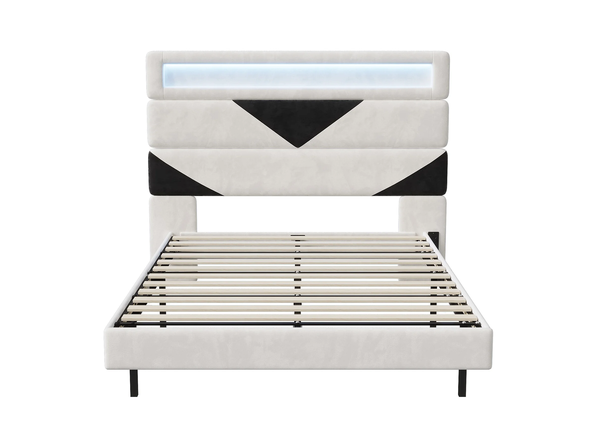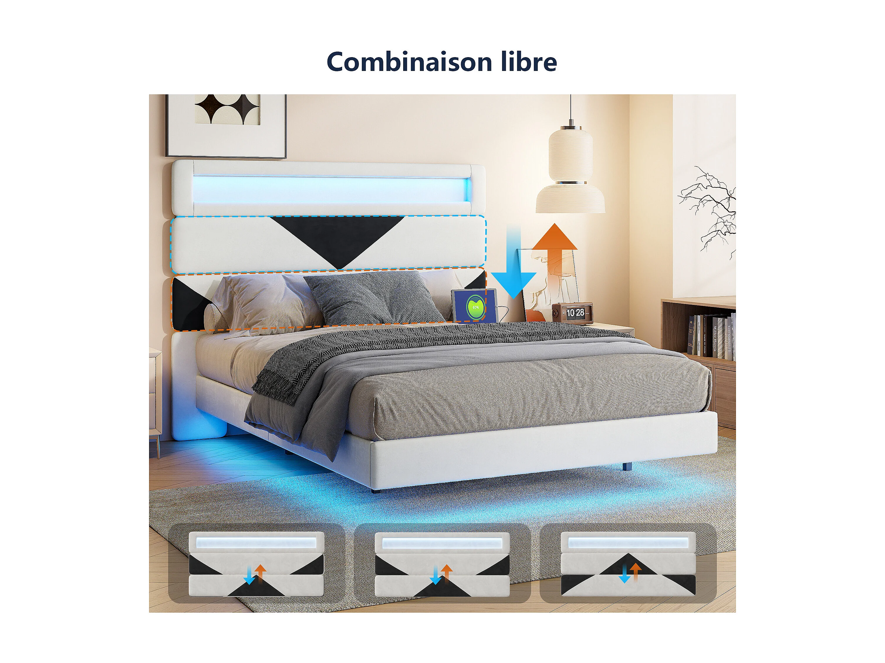 Lit 140 x 190 cm avec LED, Lit double avec sommier à lattes en bois massif, velours, blanc