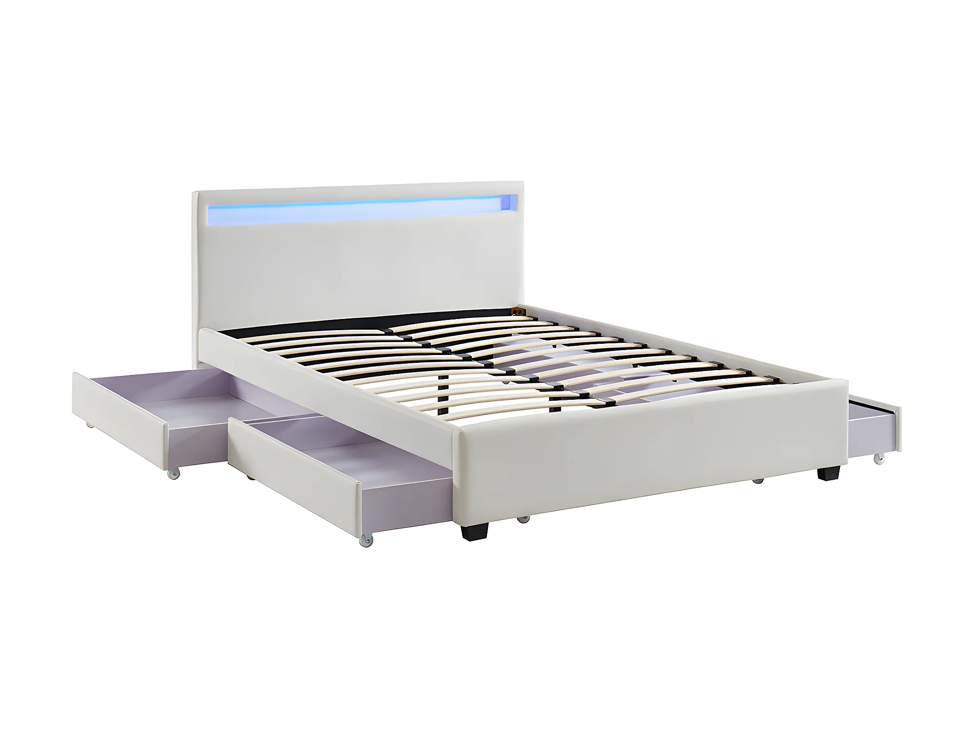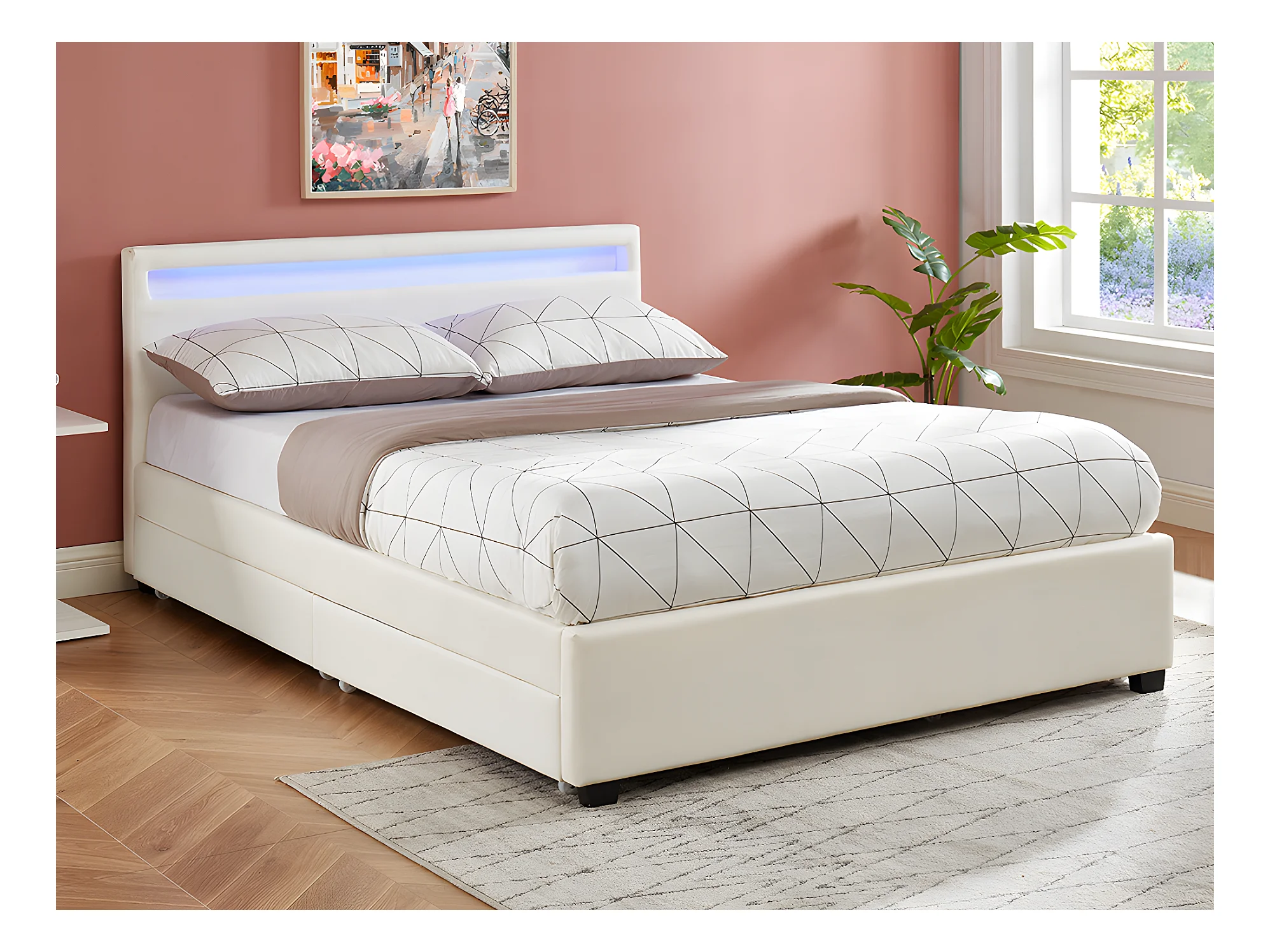 Lit 140 x 190 cm avec rangements - Simili blanc avec LEDs + Matelas - ALOIS II