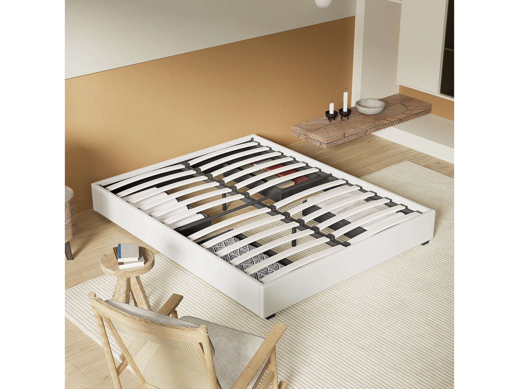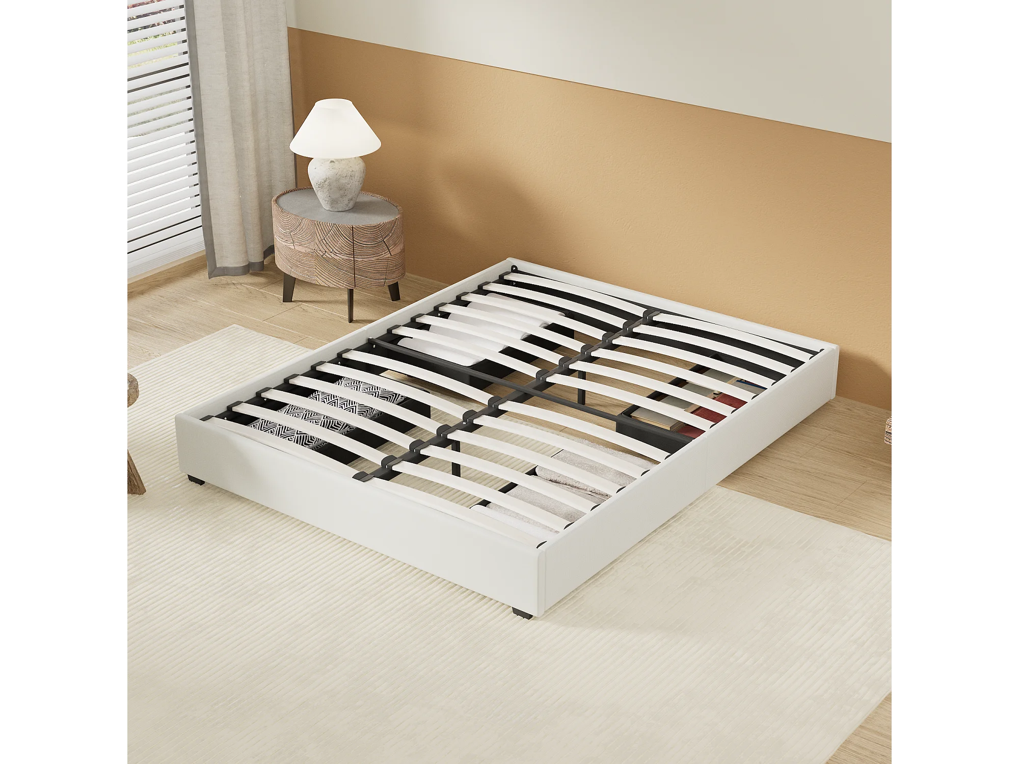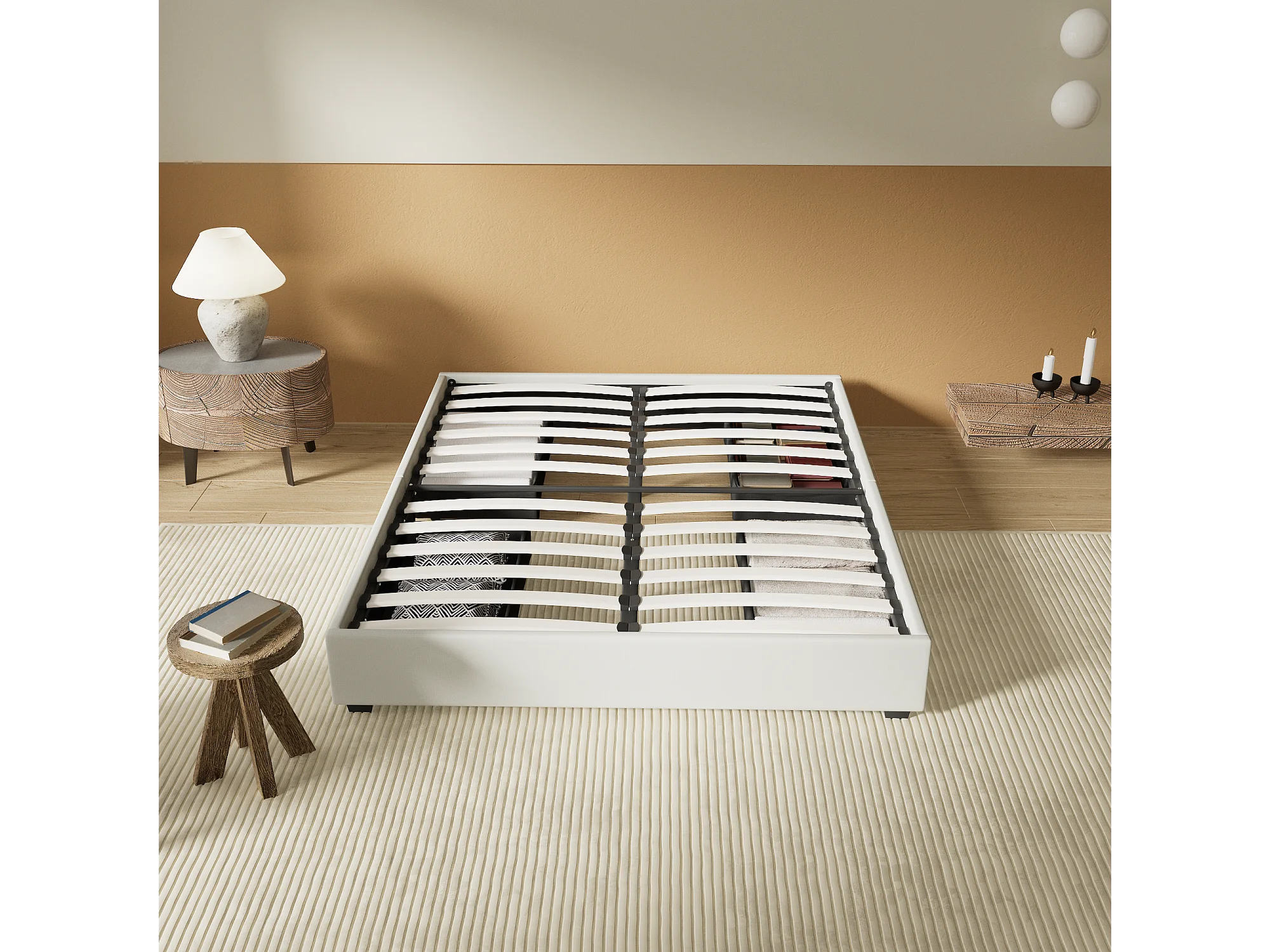 Lit 140 x 190 cm avec tiroirs, sommier à lattes en bois, cadre en tissu blanc