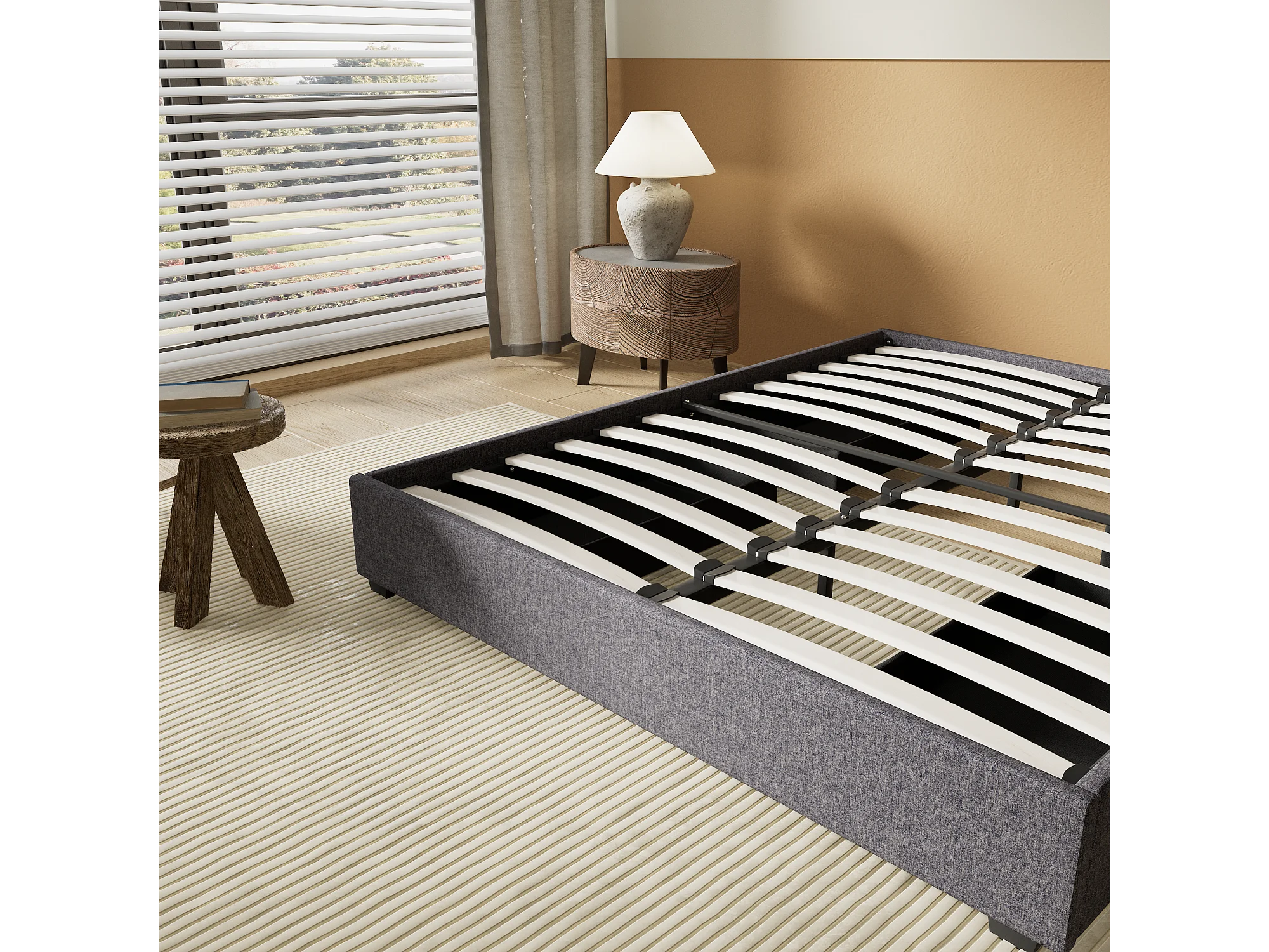 Lit 140 x 190 cm avec tiroirs, sommier à lattes en bois, cadre en tissu gris