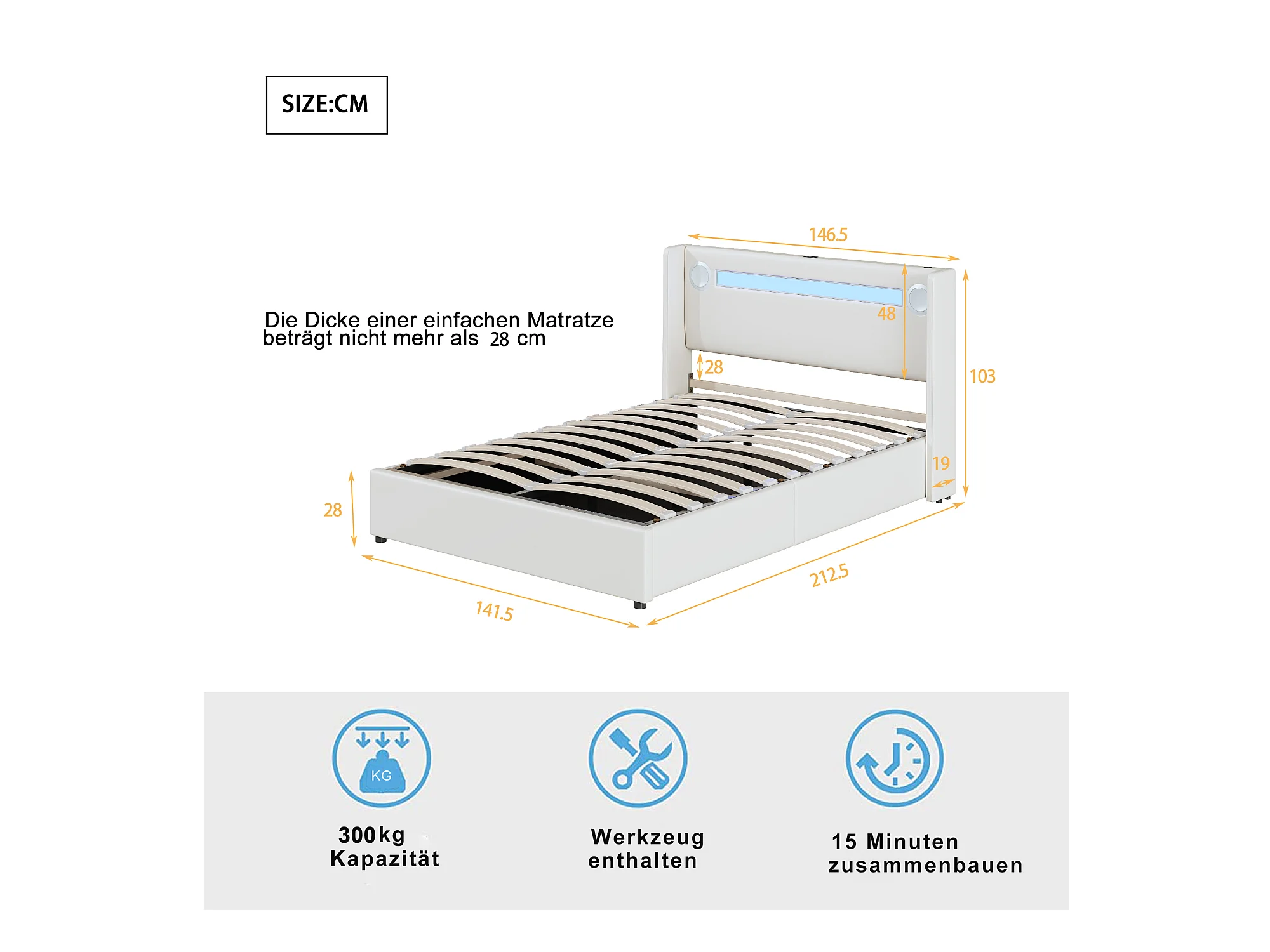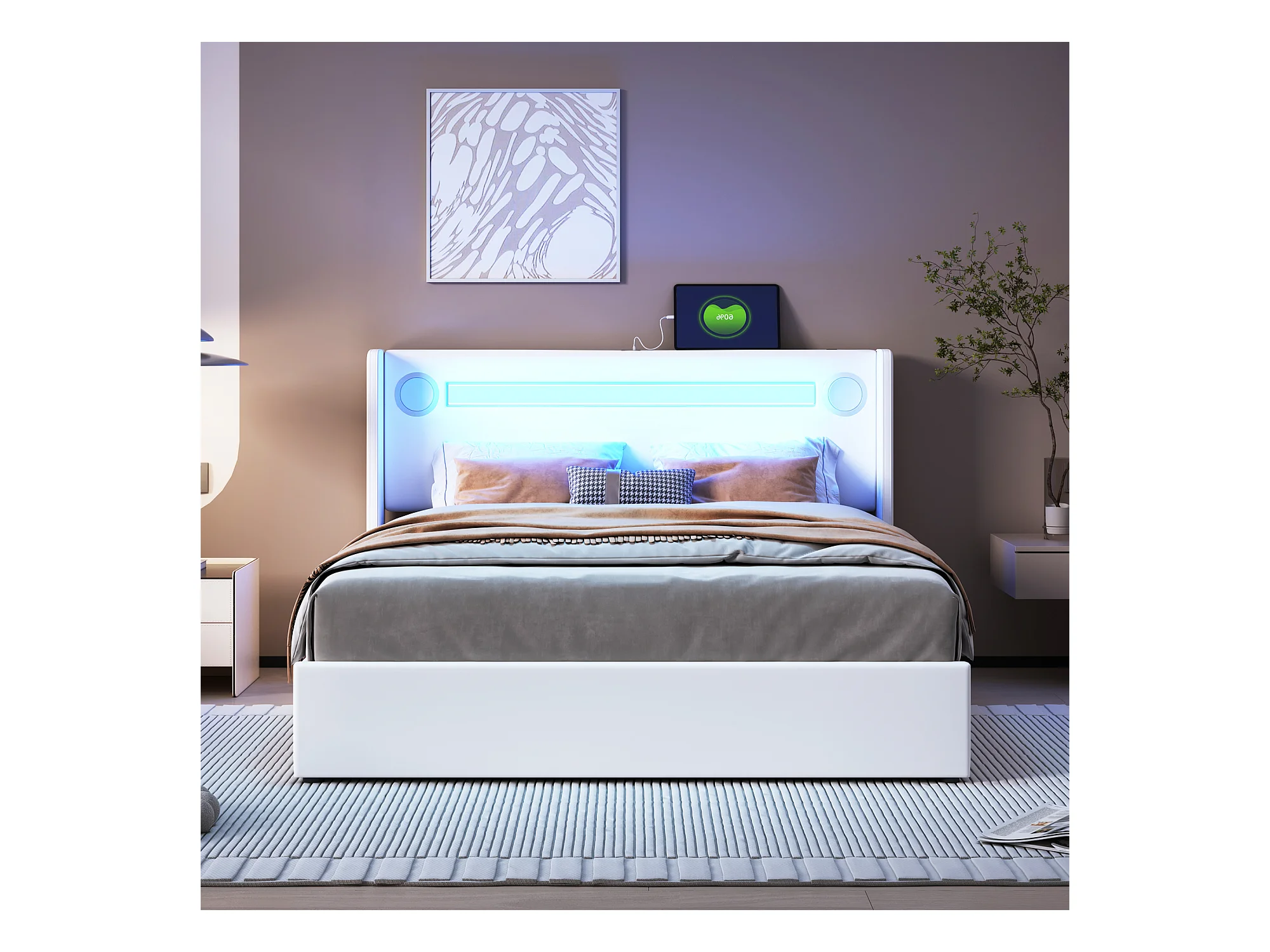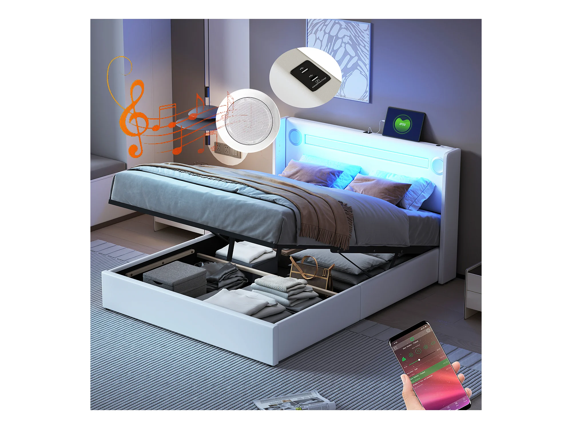 Lit 140 x 200 cm avec LED, Bluetooth et USB, en Cuir PU avec Rangement et Sommier, Blanc