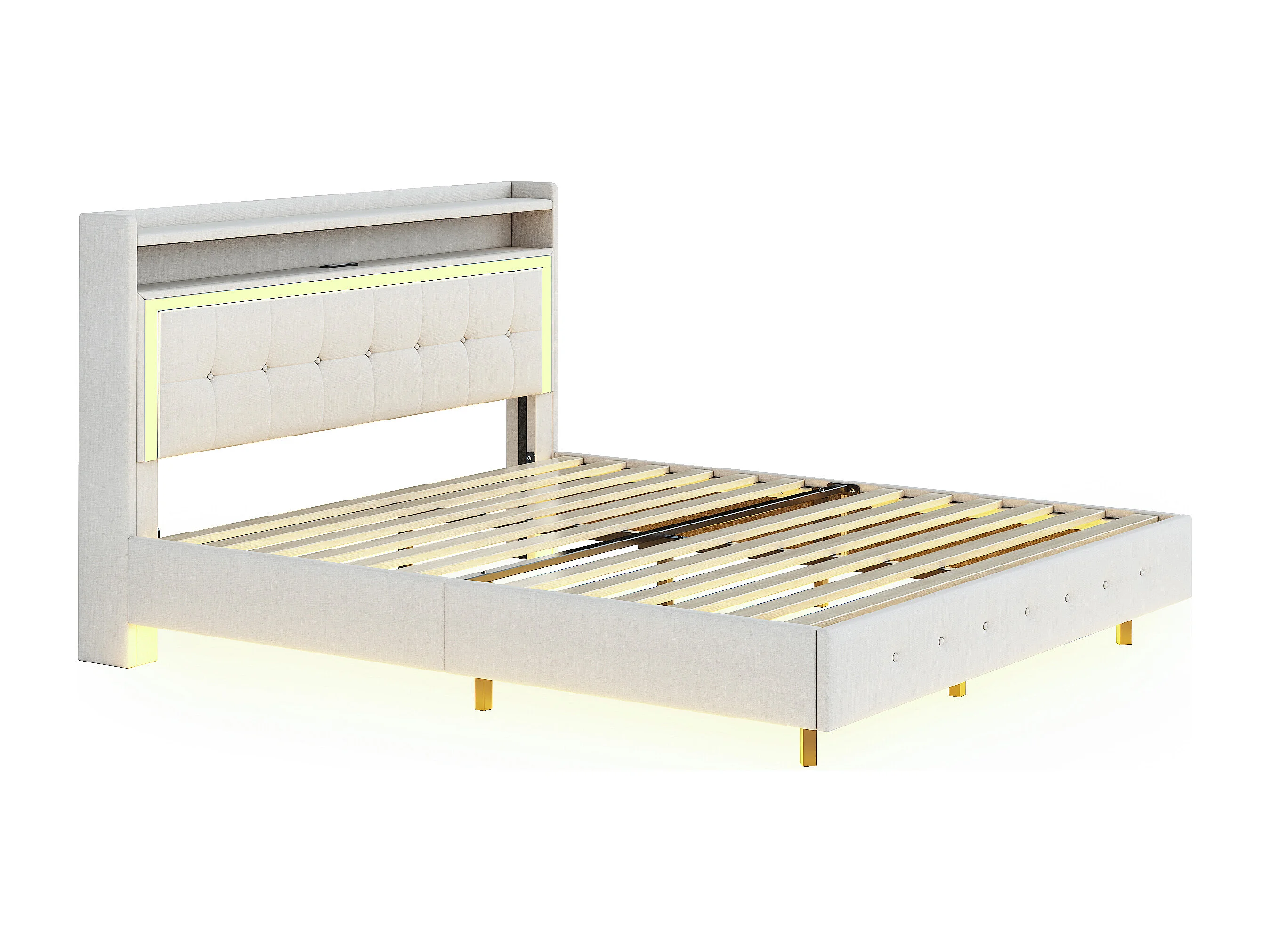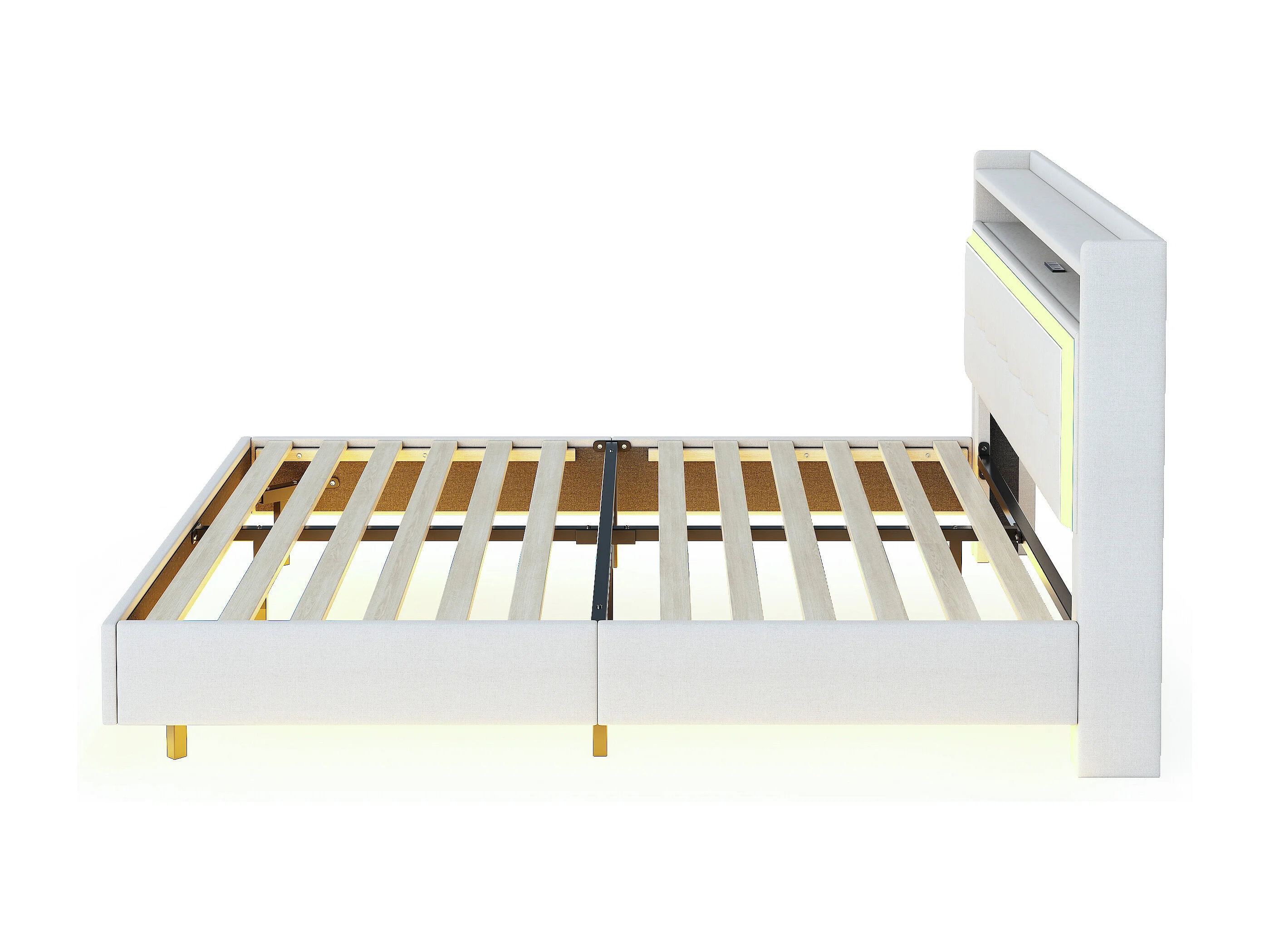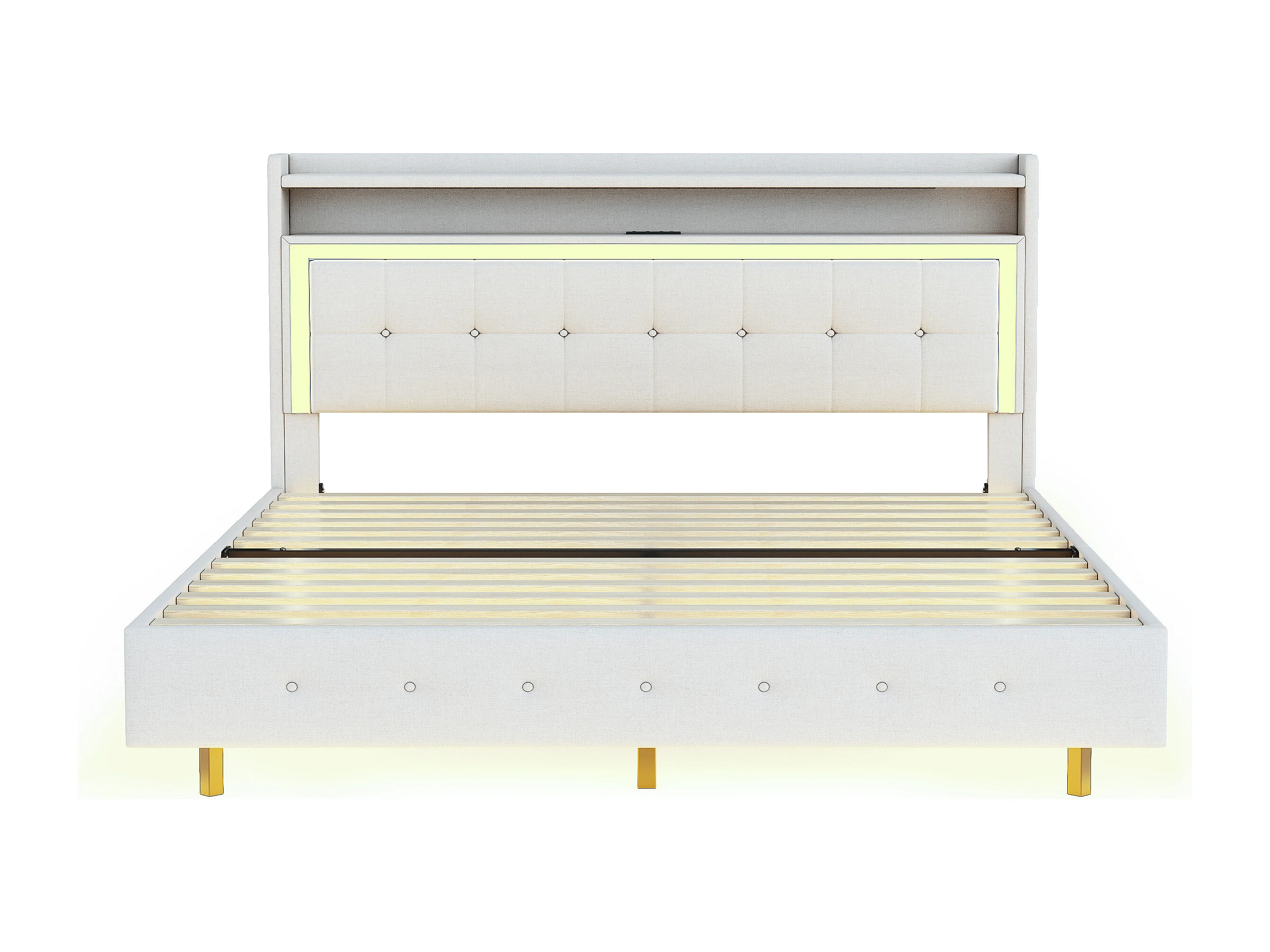 Lit 140 x 200 cm avec Port USB, LED et Design Caché, en Tissu Lin Beige
