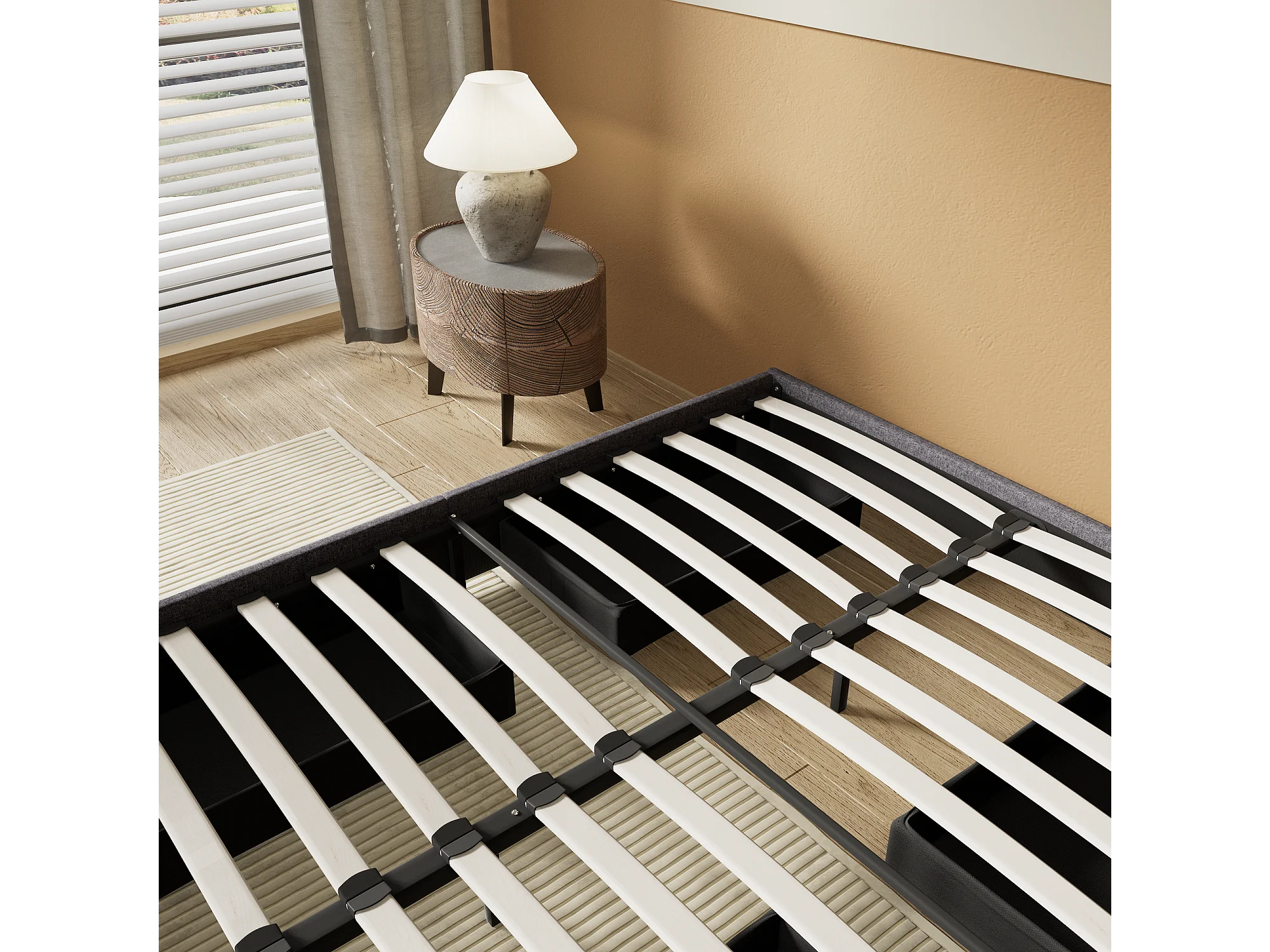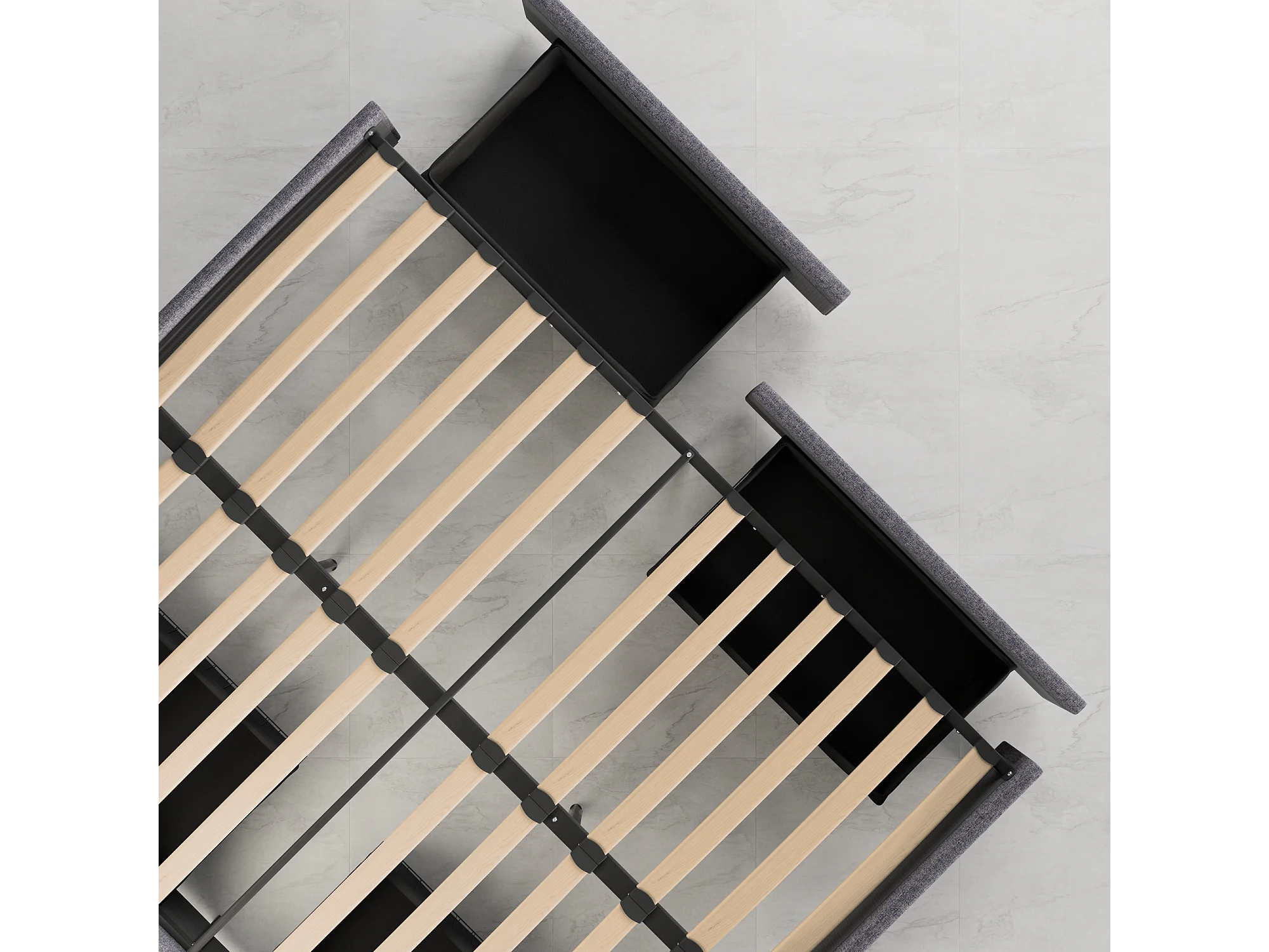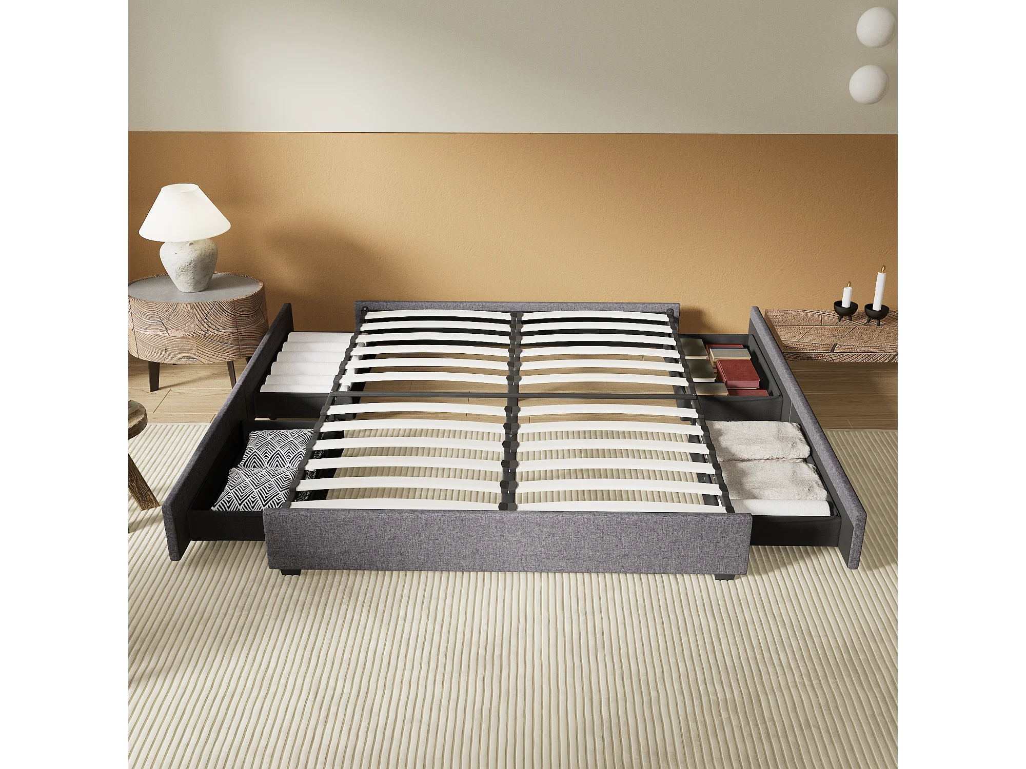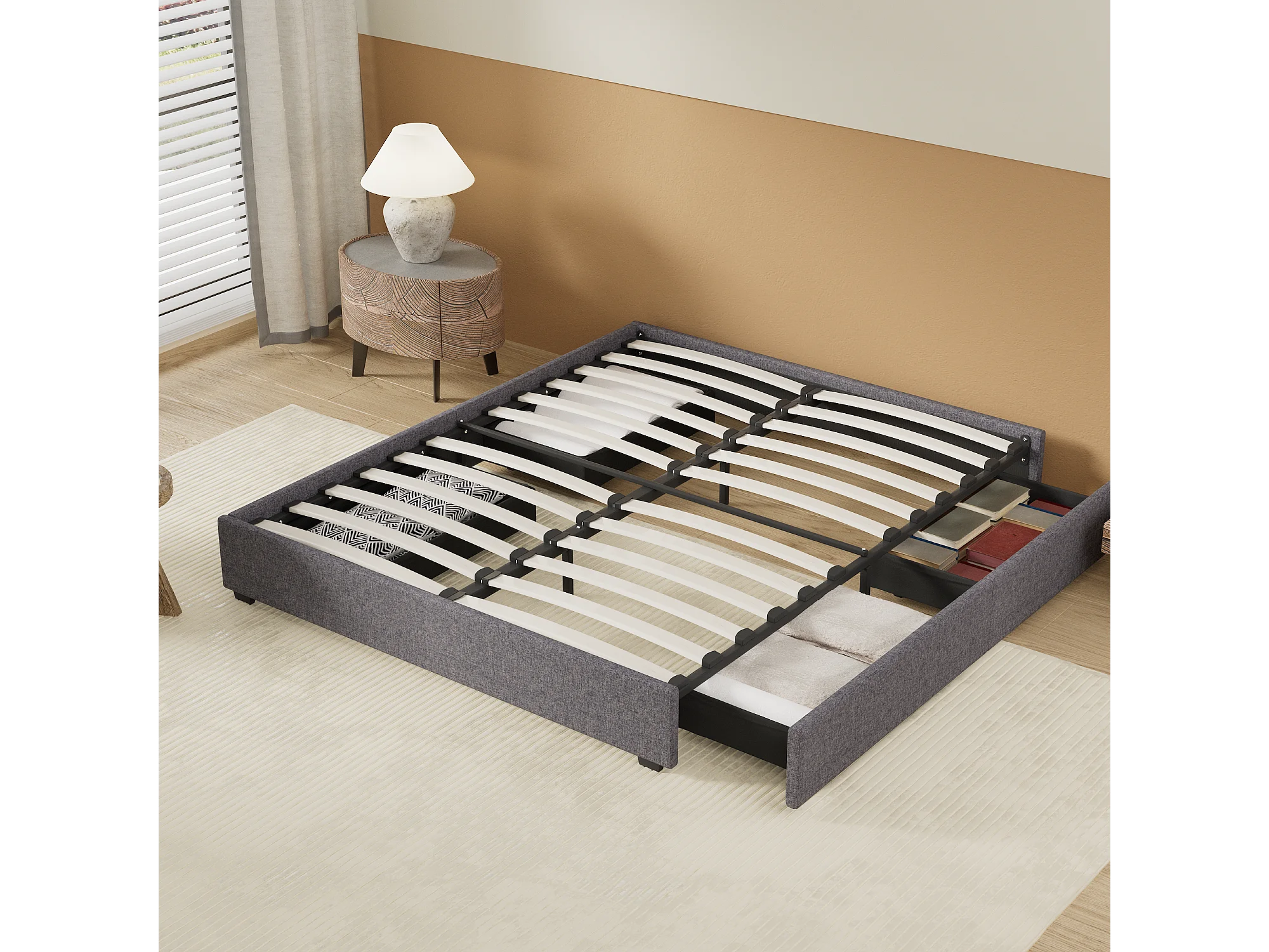 Lit 140 x 200 cm avec tiroirs, sommier à lattes en bois, cadre en tissu gris