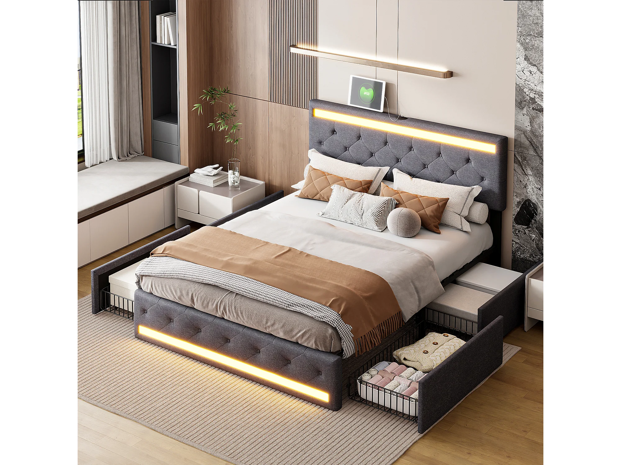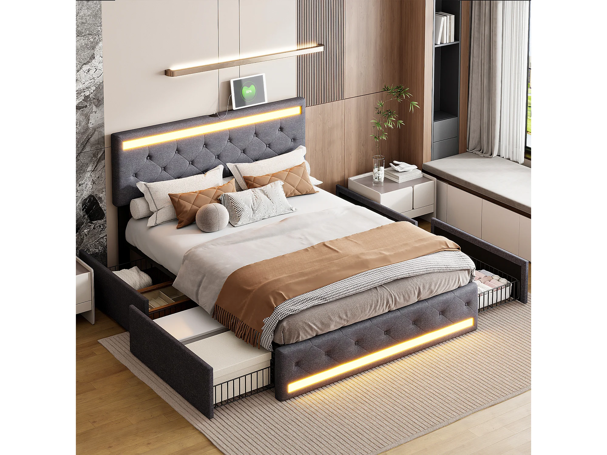 Cadre De Lit capitonné - Éclairage LED RGB - Tiroirs De Rangement - Style Moderne Luxueux - Tissu de lin - 140x190