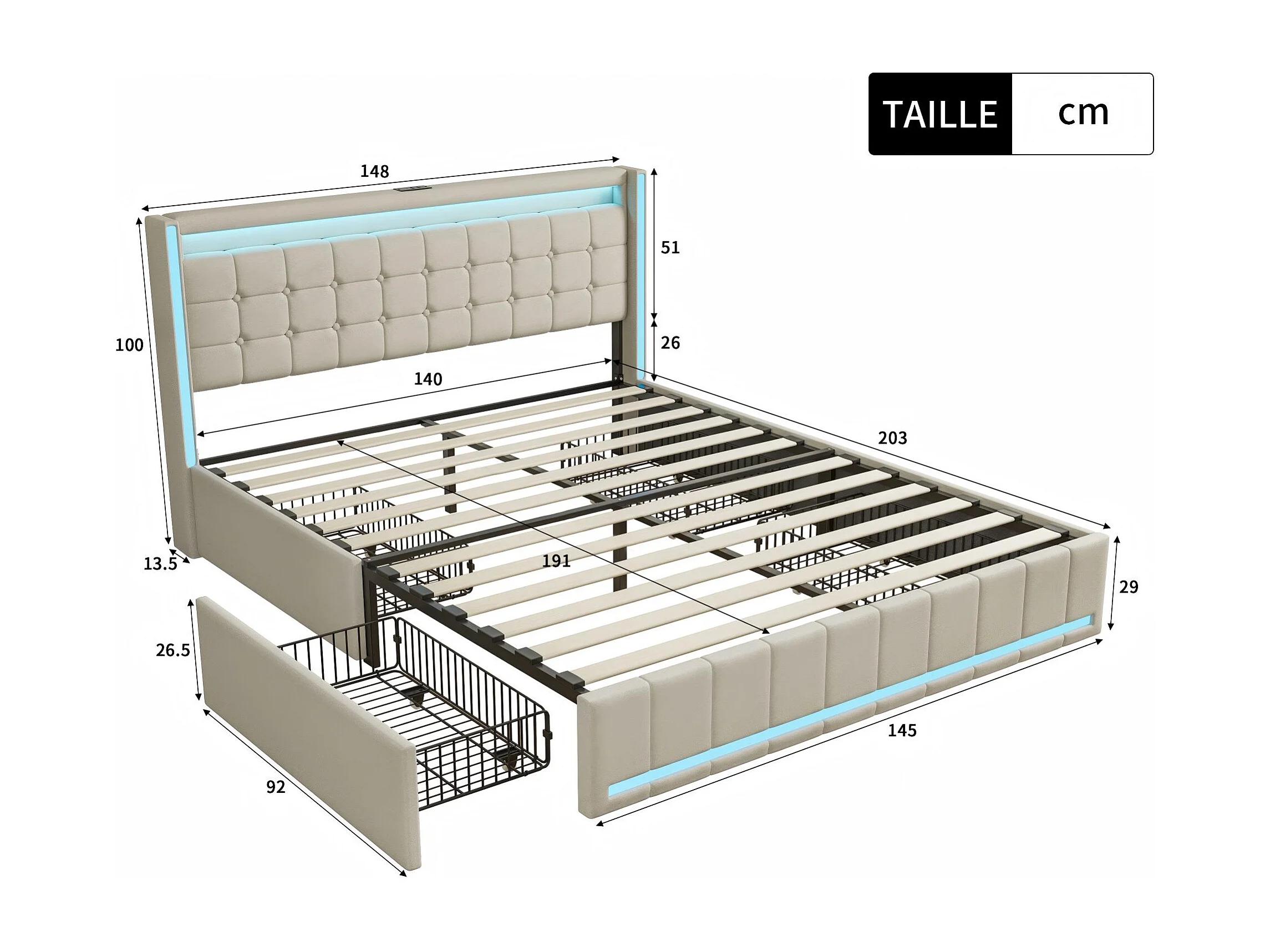 Lit 140x190 avec tiroirs, LED, USB Type-C, lit rangement avec roulettes, cadre de lit en tissu lin