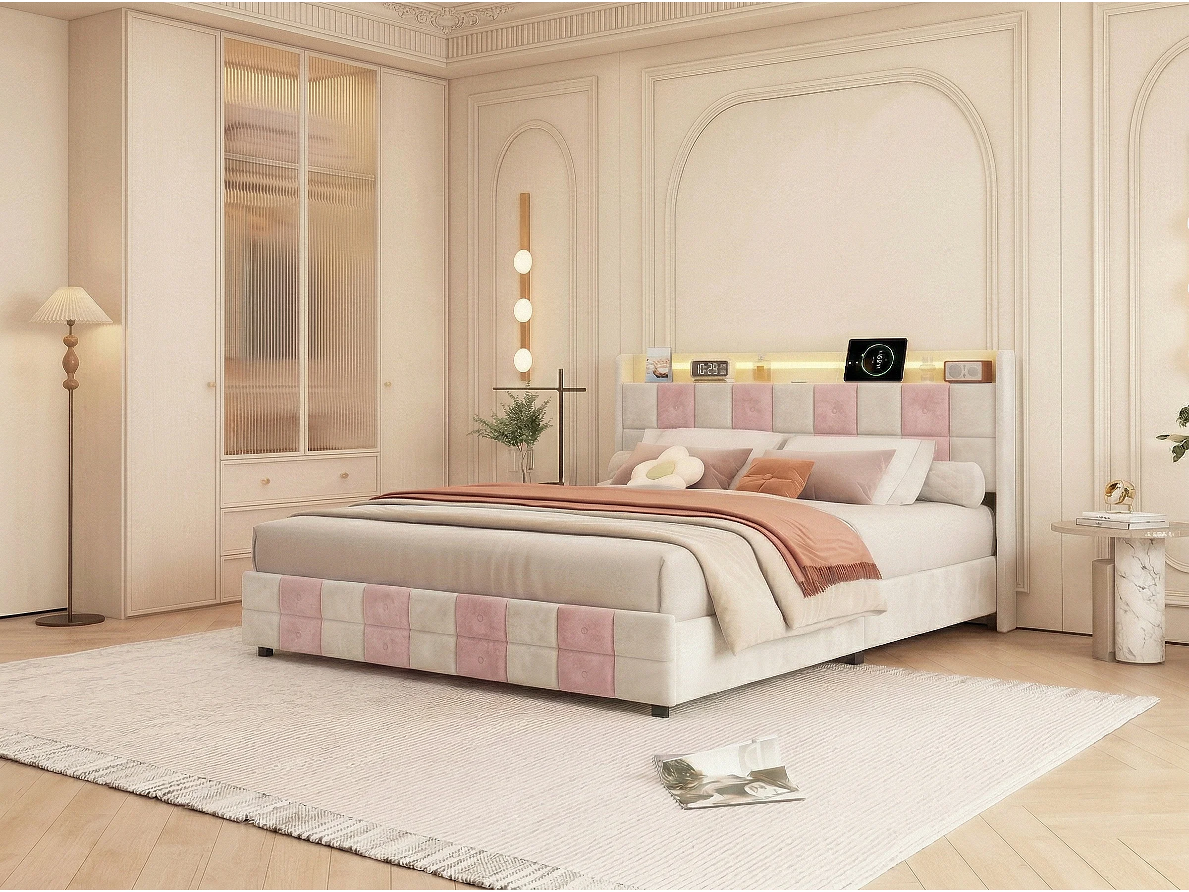 Lit 140x190 avec tiroirs, lit LED avec USB, lit double en velours, sommier à lattes, tête de lit capitonnée