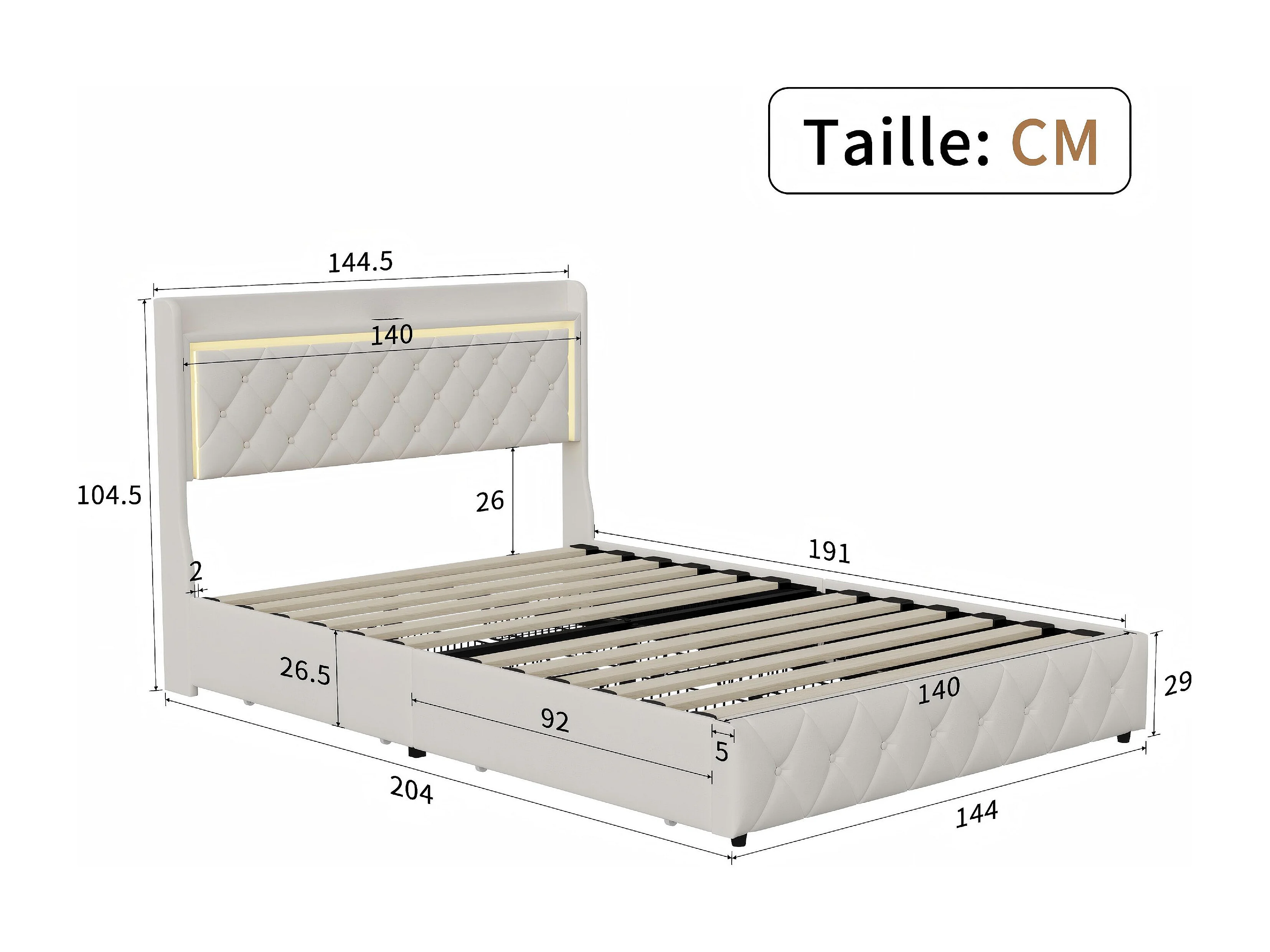 Lit 140x190 cm avec coffre et rangement, LED, USB et Type-C, lit capitonné velours, sommier inclus