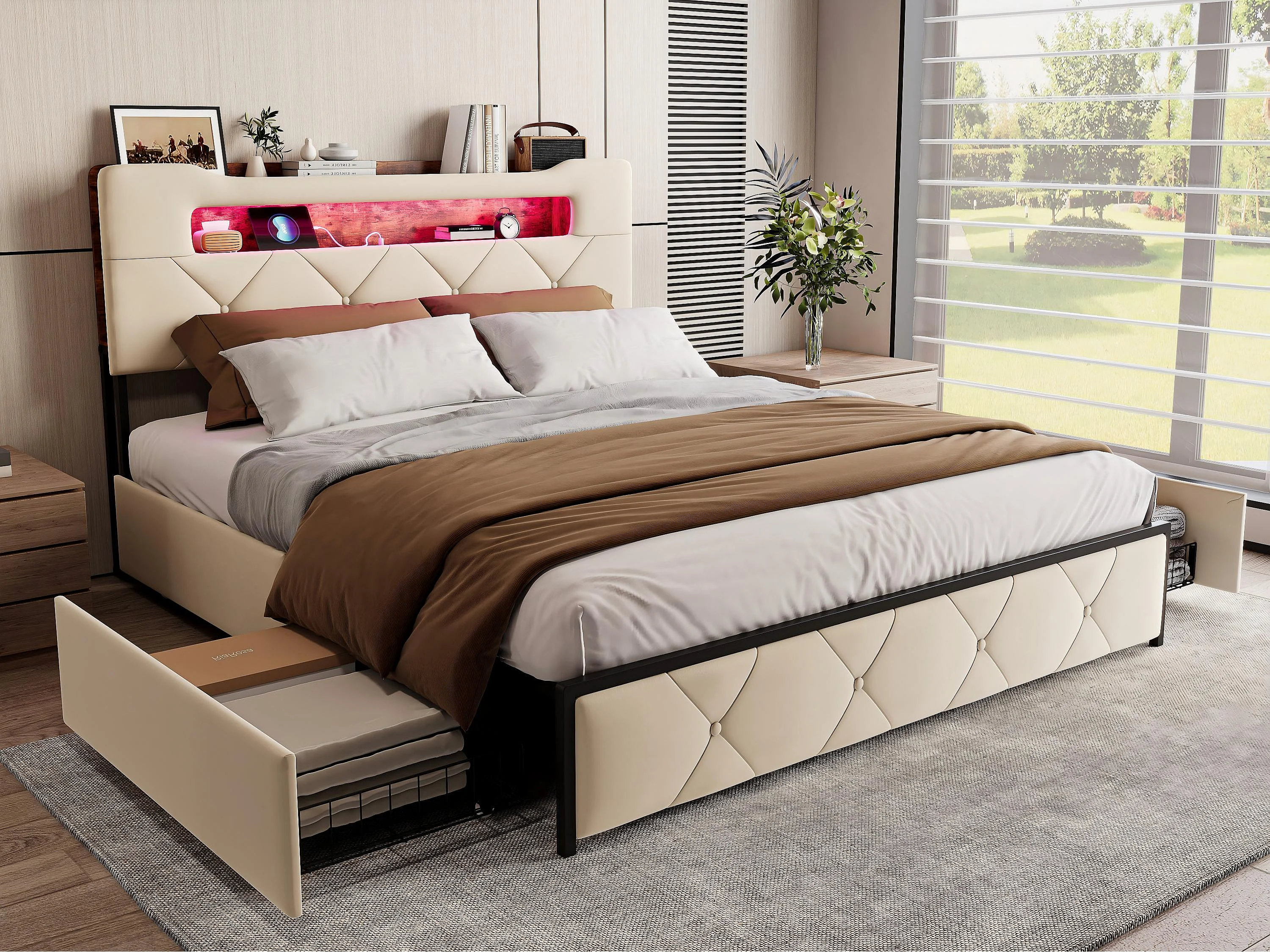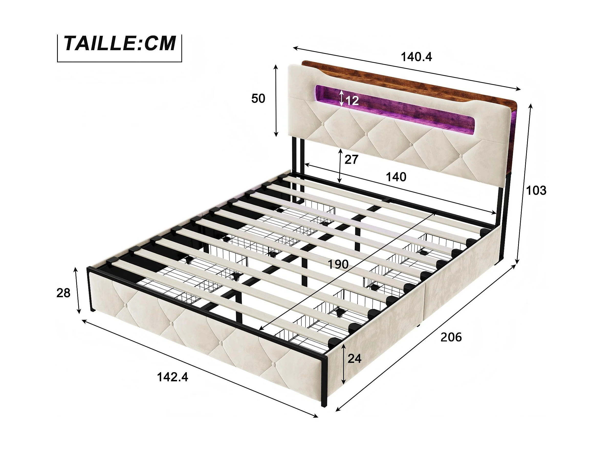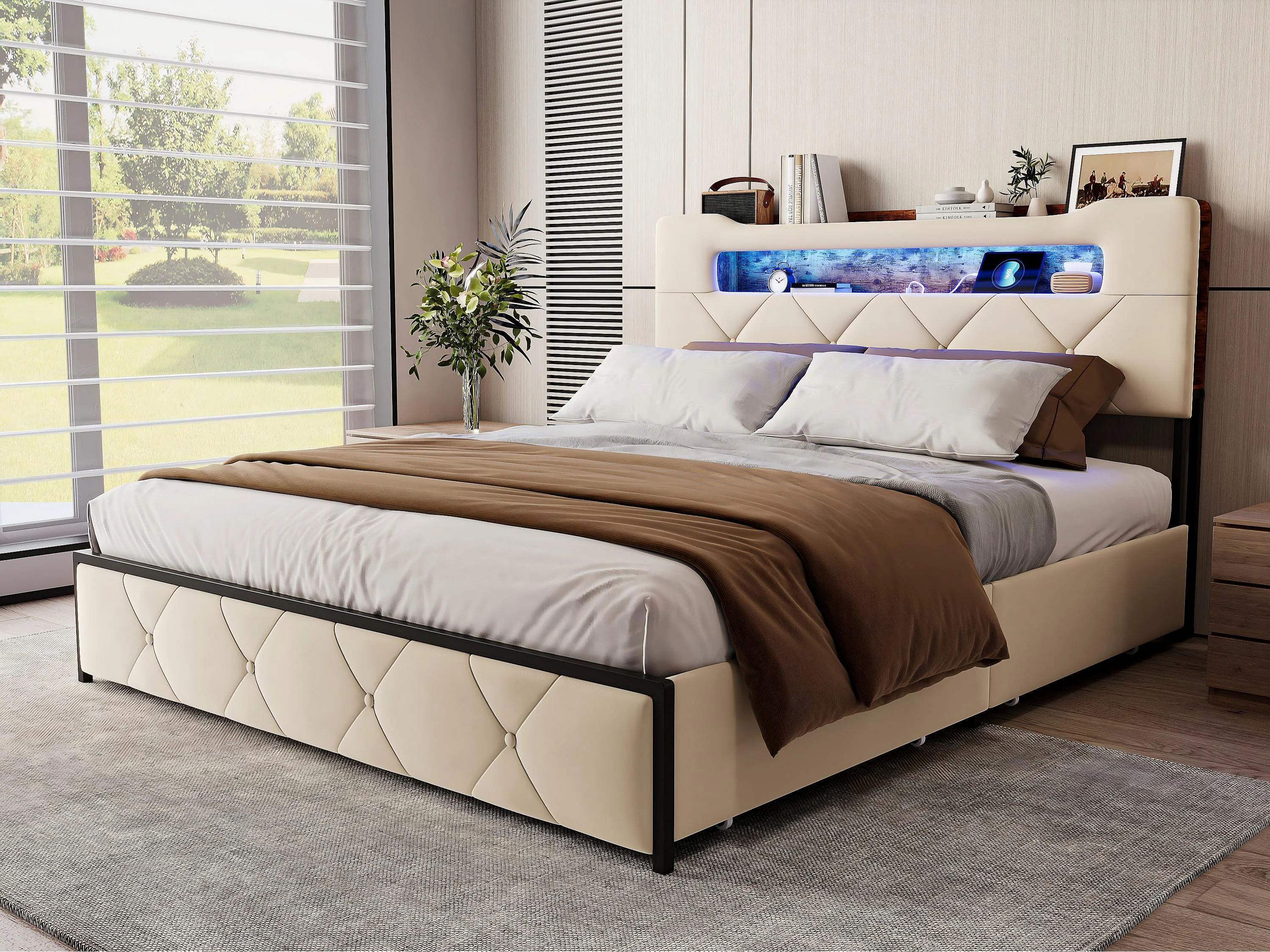 Lit 140x190 cm avec LED et USB, Lit avec 4 Tiroirs, Tête de Lit avec Rangement, Cadre Métal et Bois,Beige