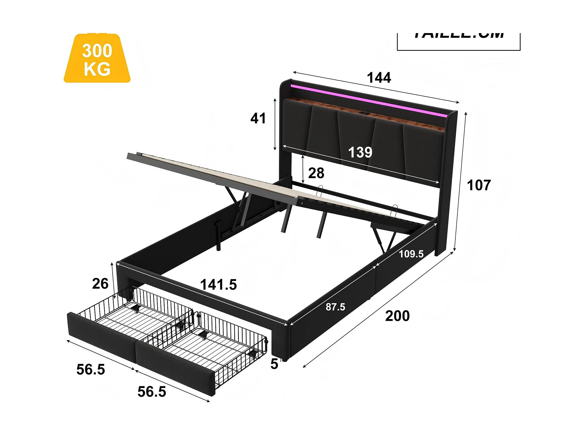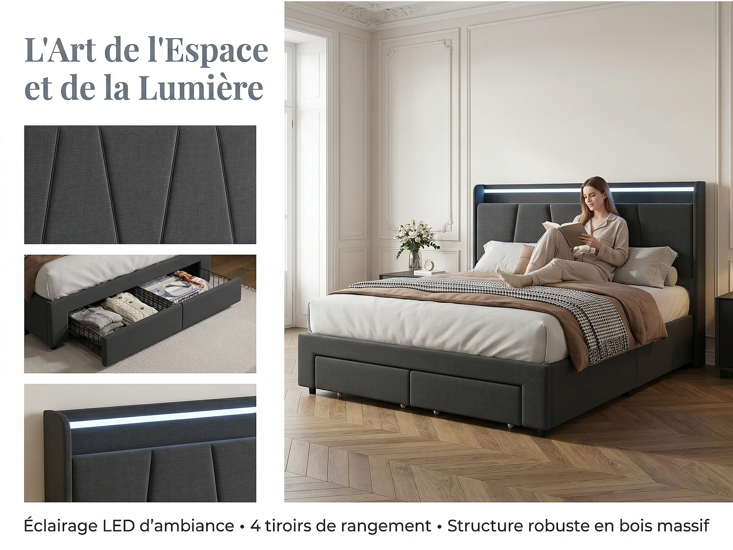 Lit 140x190 cm avec LED et USB, Tête de Lit avec Rangement, Lit avec 2 Tiroirs, Cadre Métal et Bois avec Sommier à Lattes, Gris