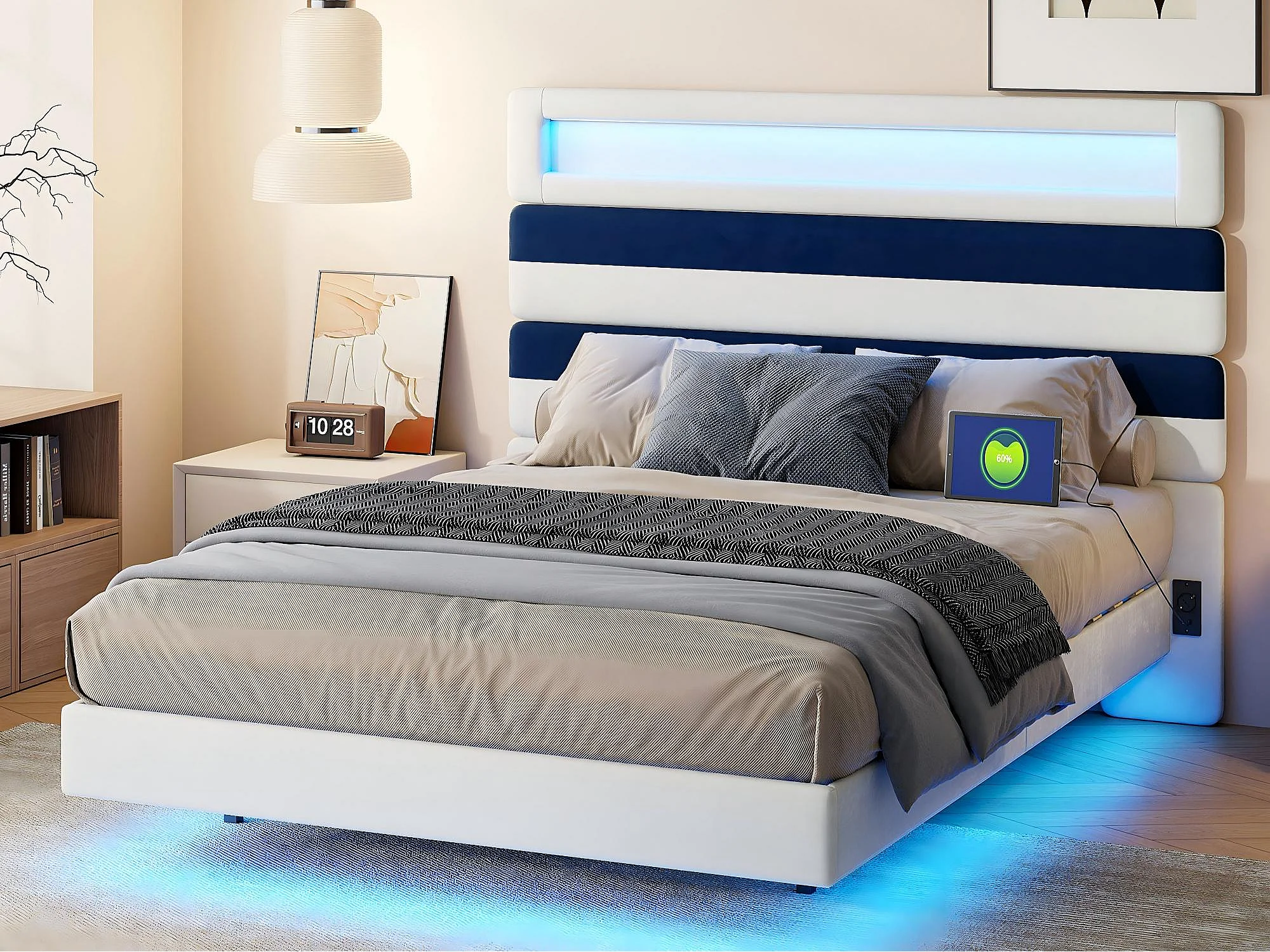 Lit 140x190 cm LED, lit moderne avec tête de lit modulable et double éclairage, cadre de lit avec sommier à lattes