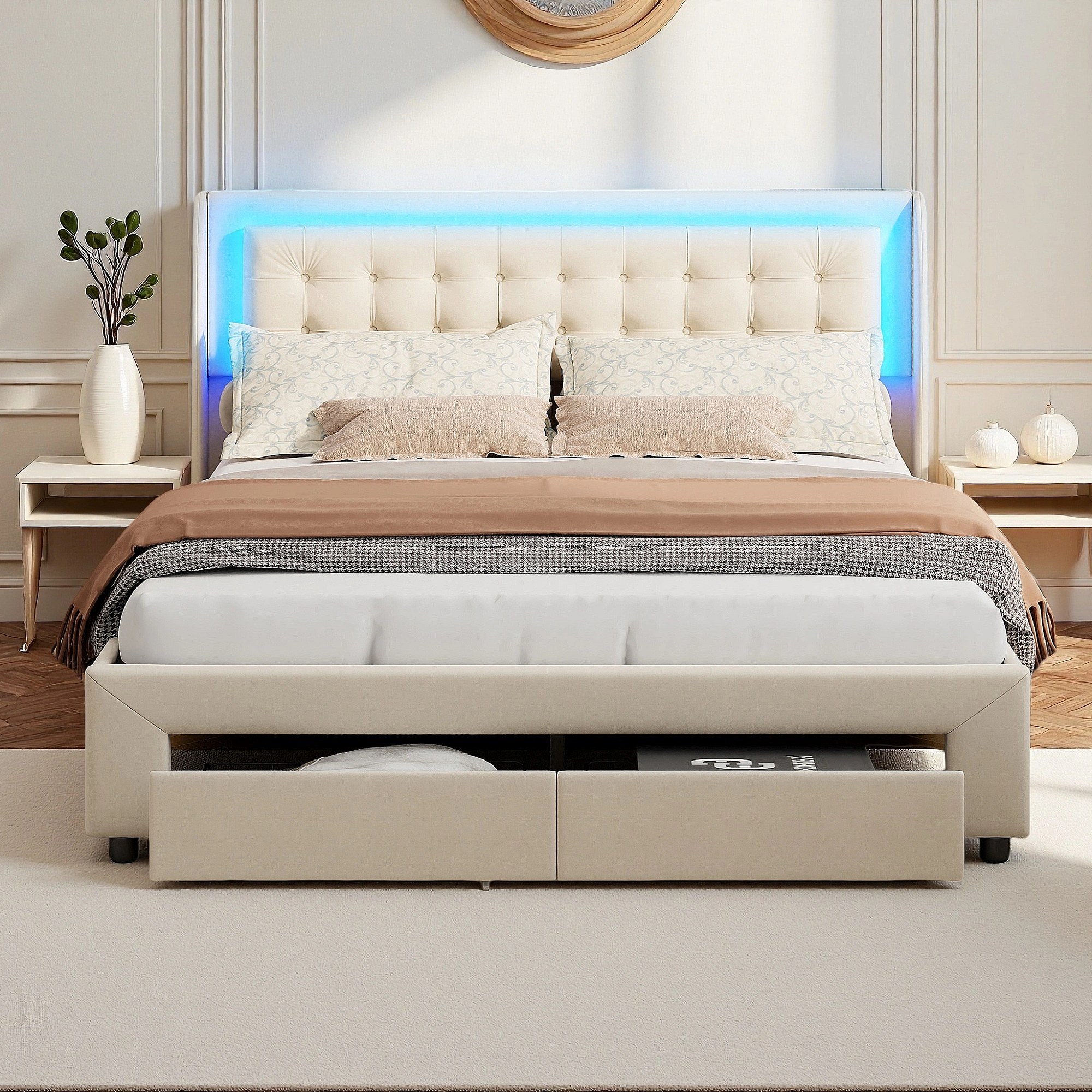 Lit 140x190 cm - NEXU - LED - lit 140x190 cm Capitonné avec tiroir et coffre - lit 140x190 cm tissu en Velours - beige