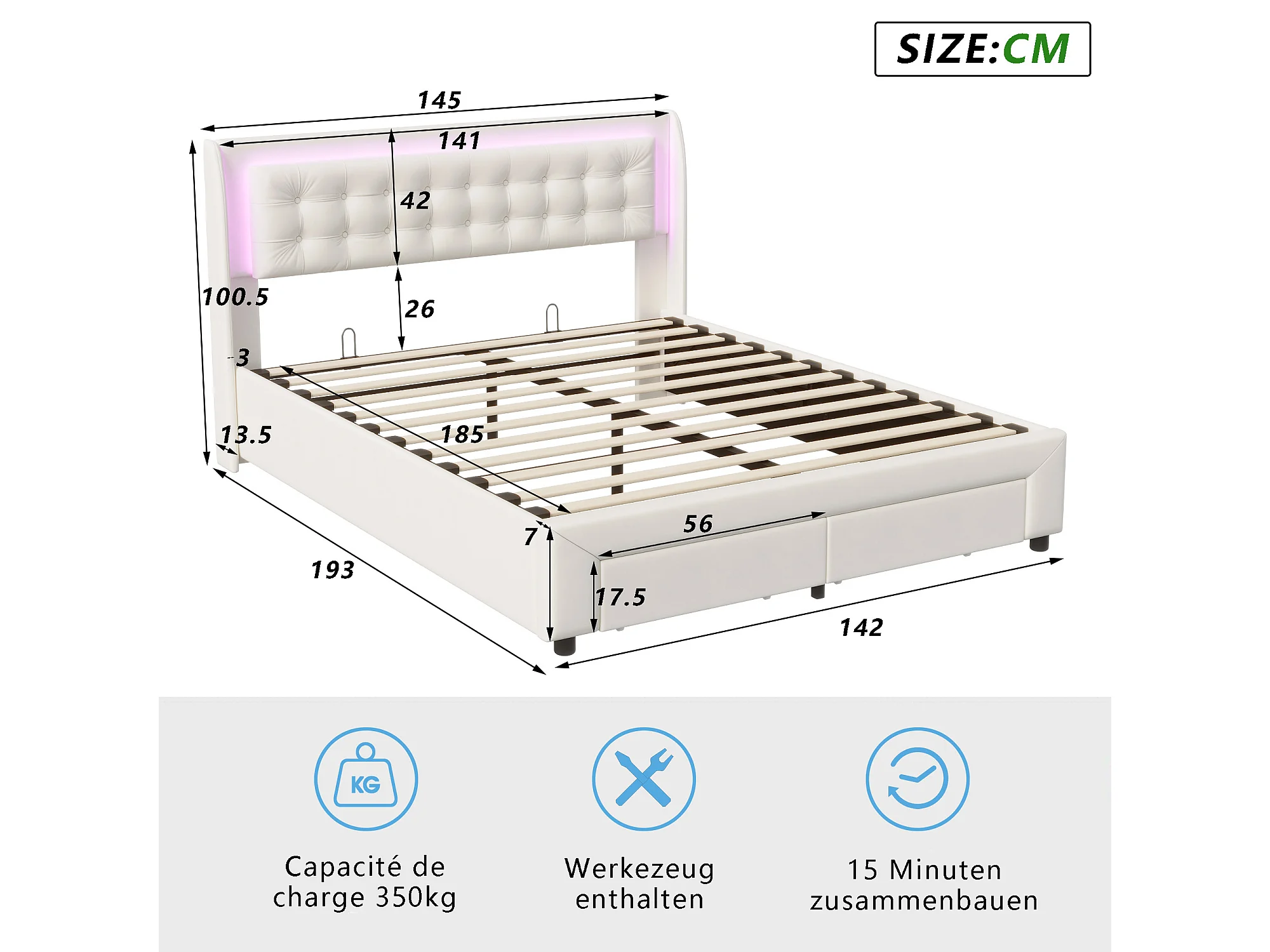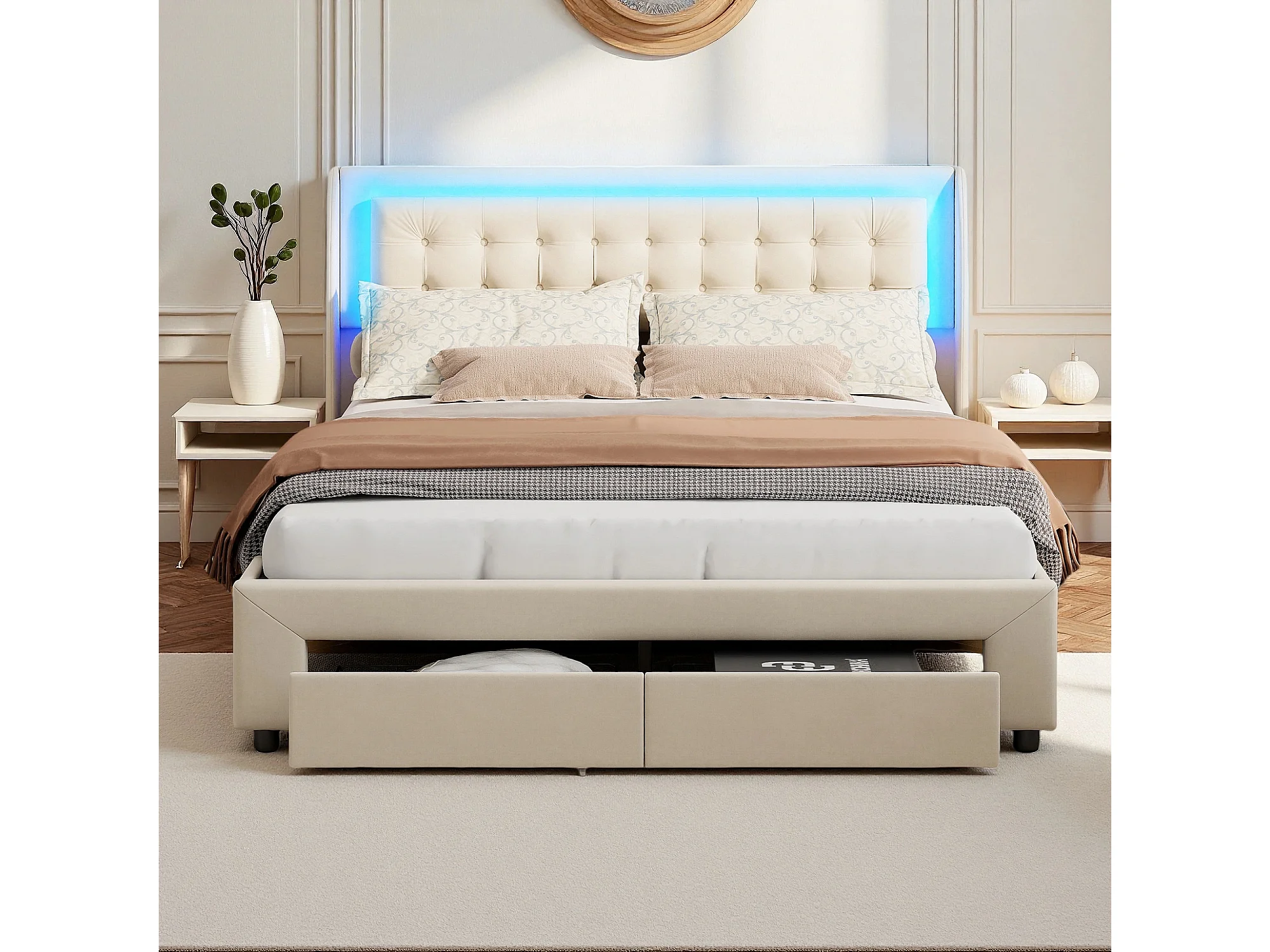 Lit 140x190 cm avec sommier à lattes - NEXU - LED - lit 140x190 cm Capitonné avec tiroir et coffre - lit adulte 140x190 cm tissu en Velours - beige