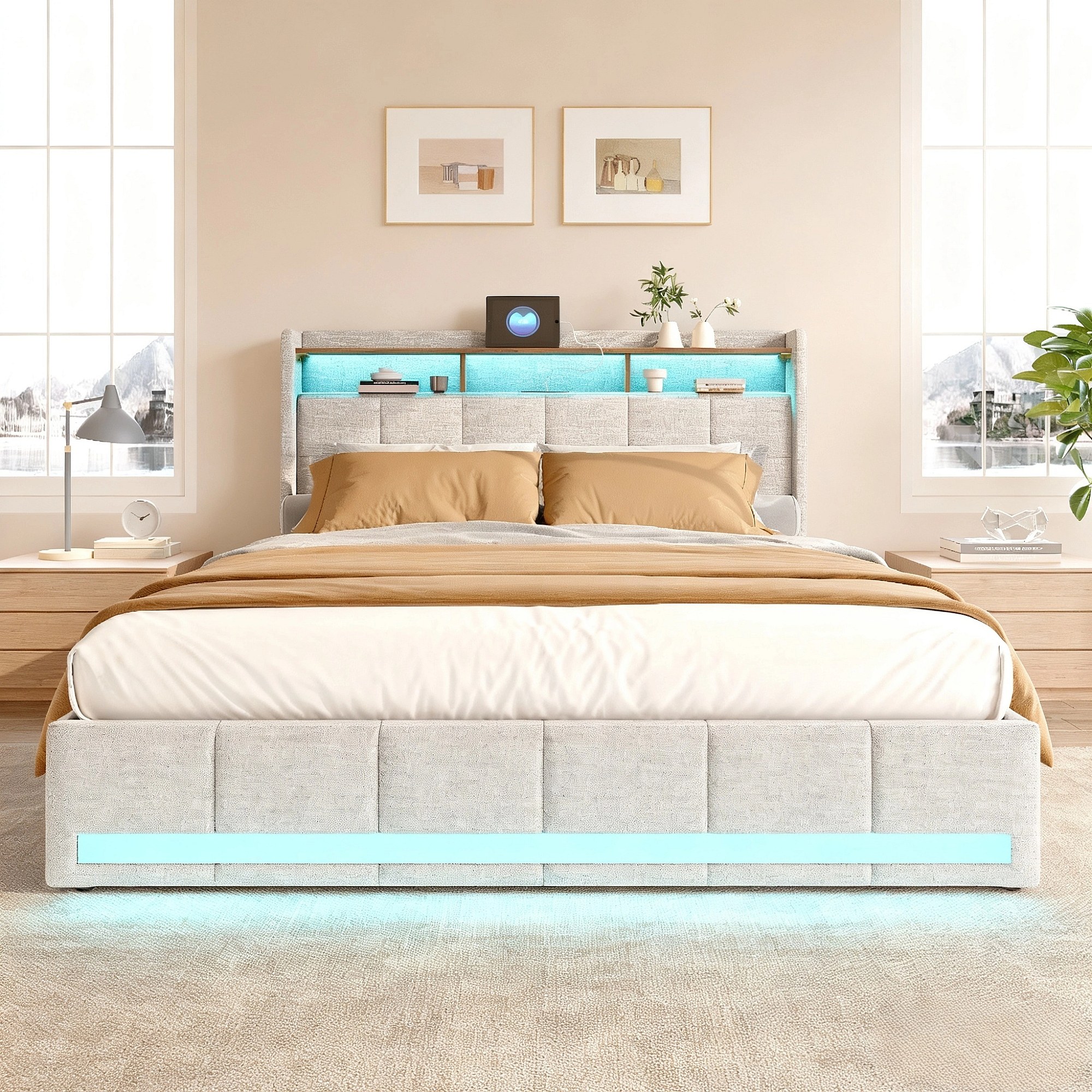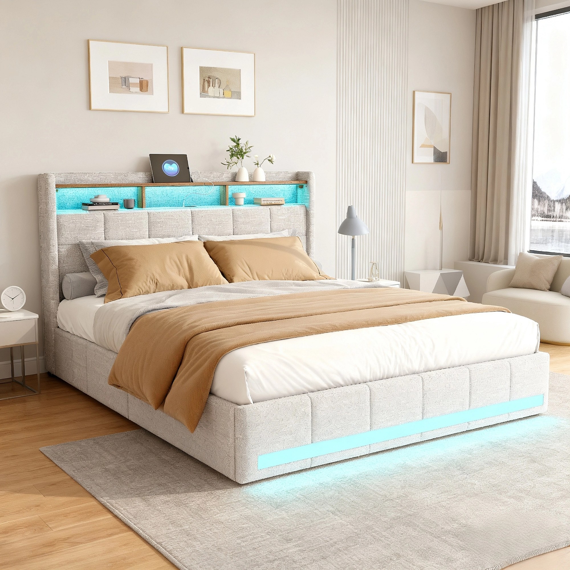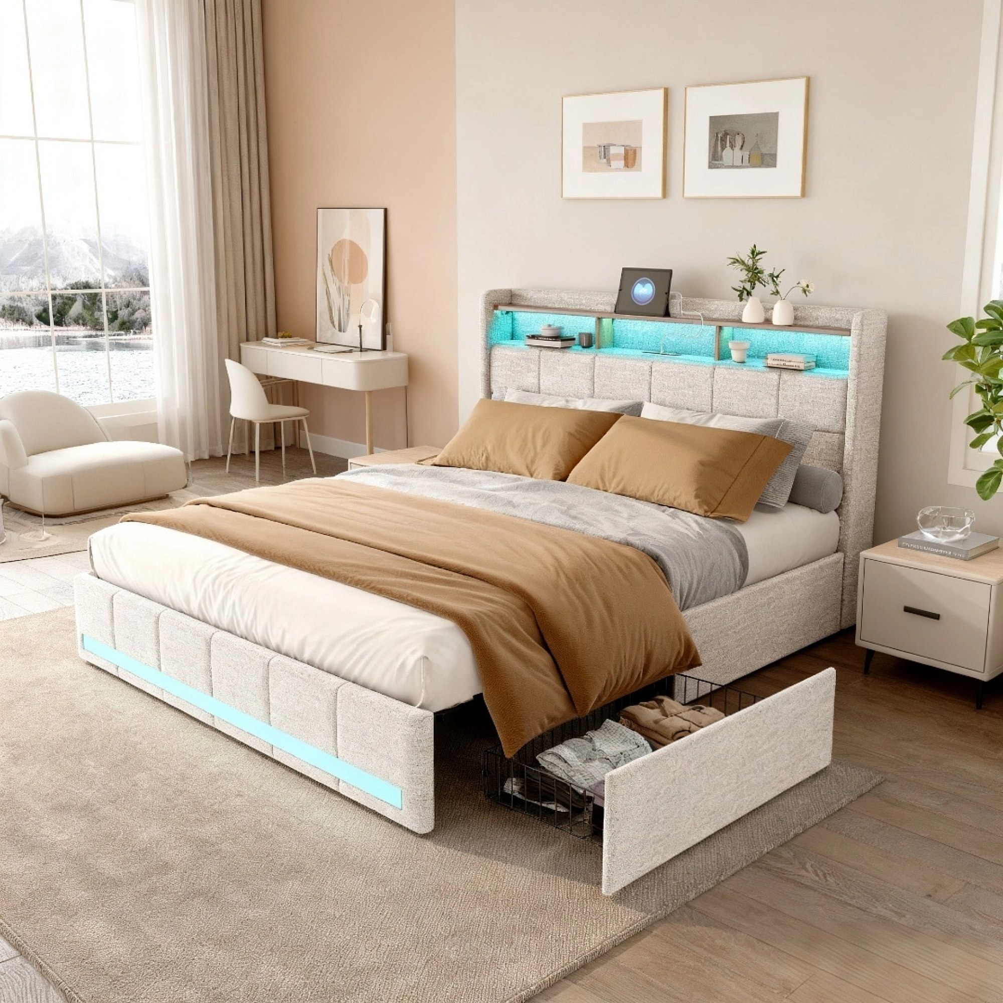 Lit 140x190 cm - NEXU - LED - sommier à lattes - tissu en lin - cadre de lit tiroir 140x200 cm - beige