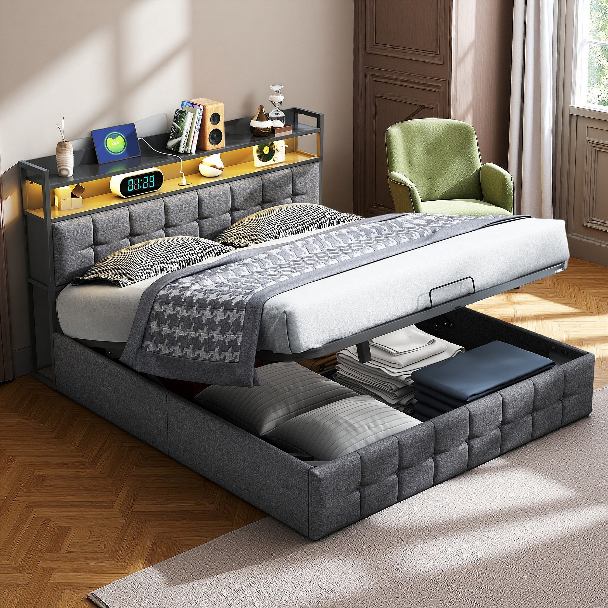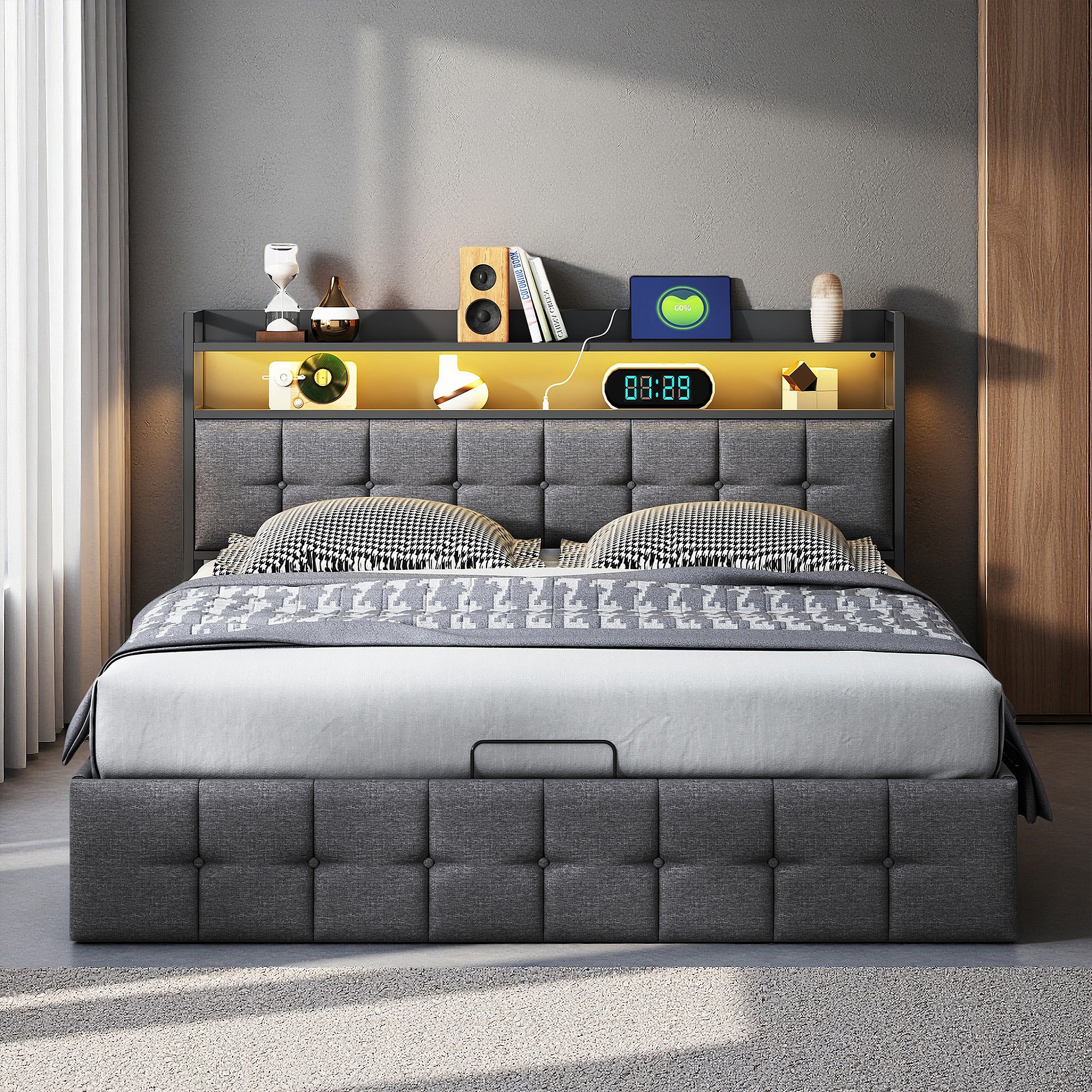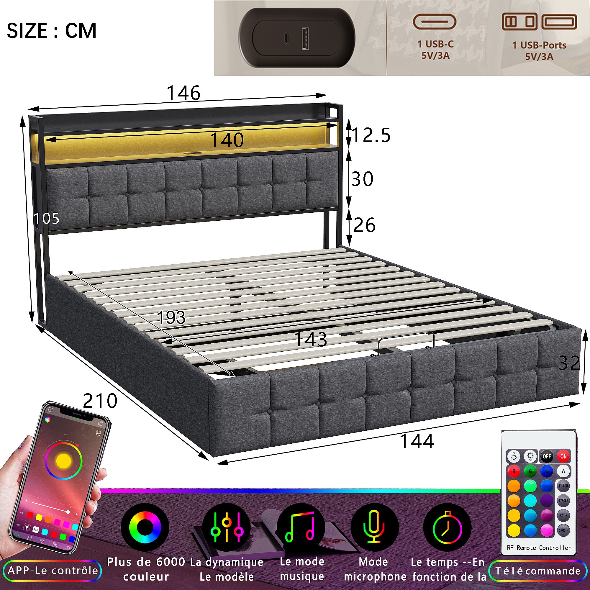 Lit 140x190 cm - NEXU - LED - tissu en lin - lit adulte 140x190 cm avec sommier à lattes - cadre de lit coffre 140x190 cm - gris