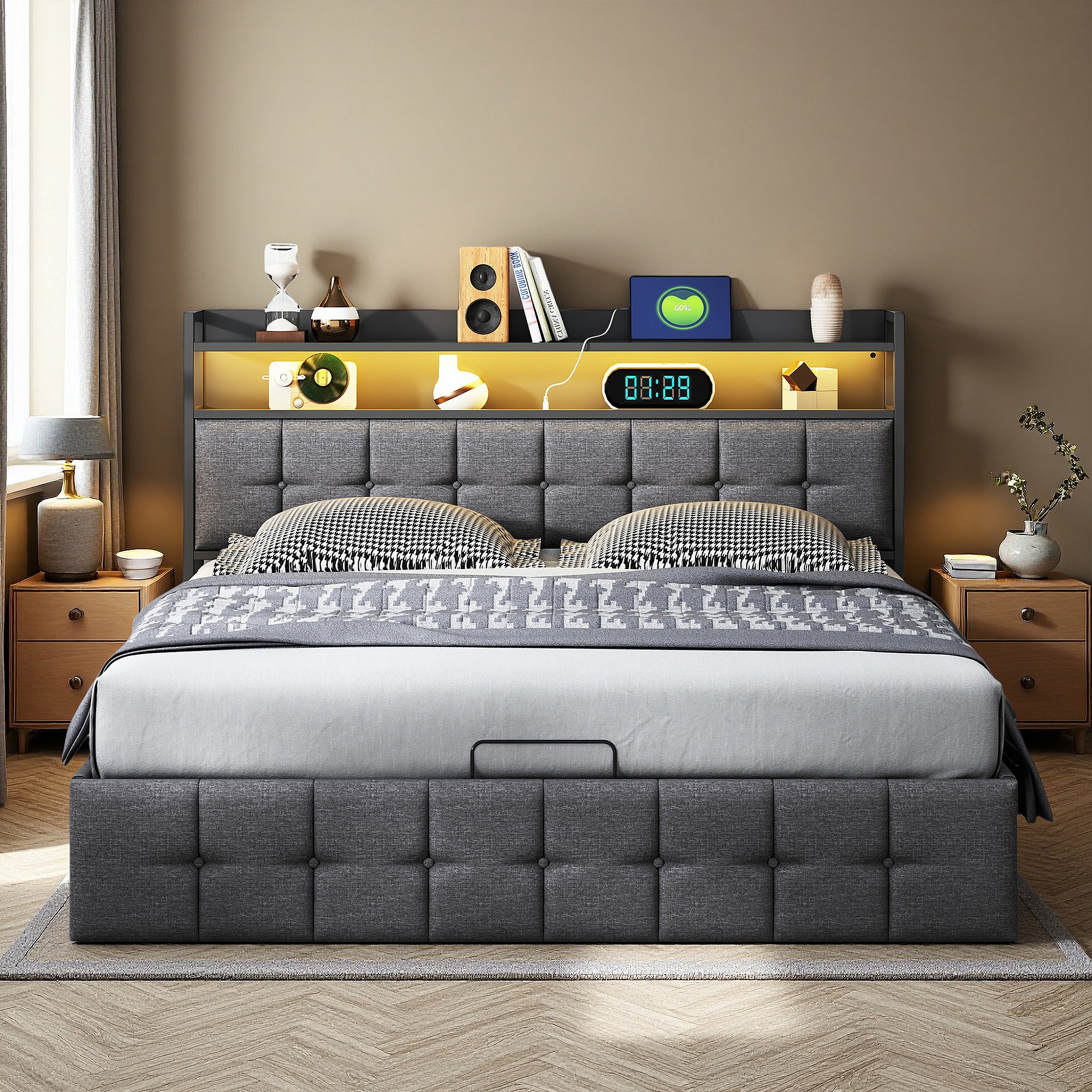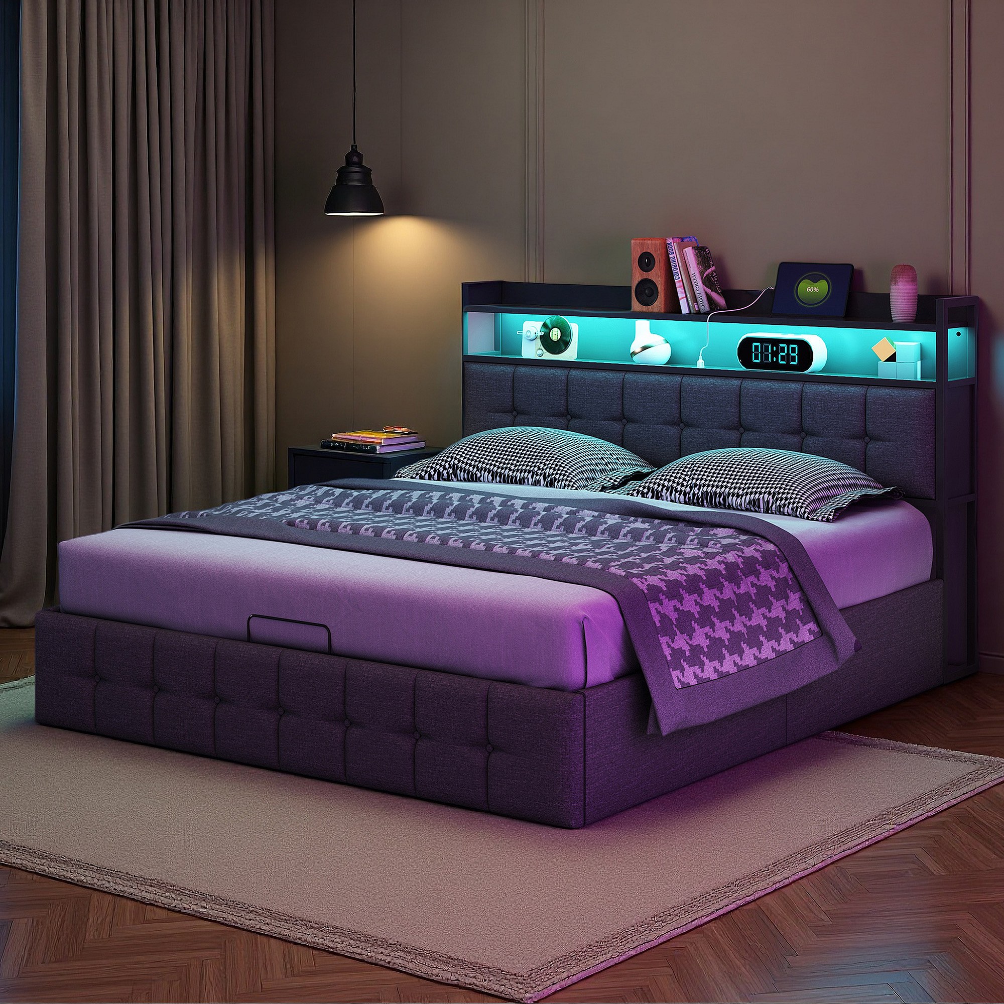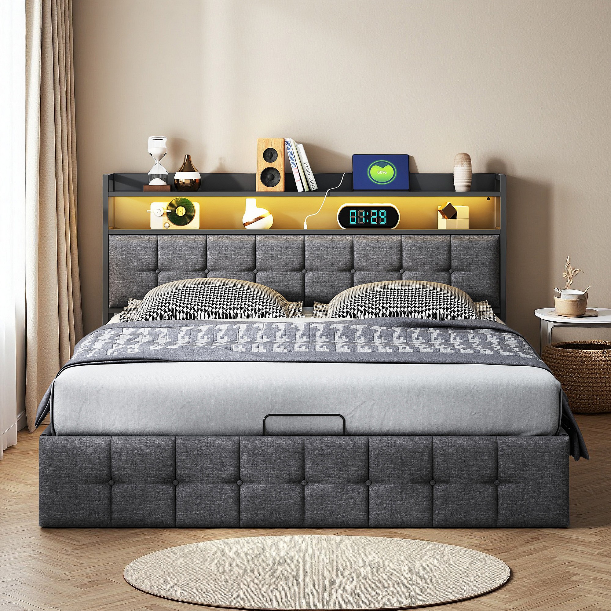 Lit 140x190 cm - NEXU - LED - tissu en lin - lit adulte 140x190 cm avec sommier à lattes - cadre de lit coffre 140x190 cm - gris