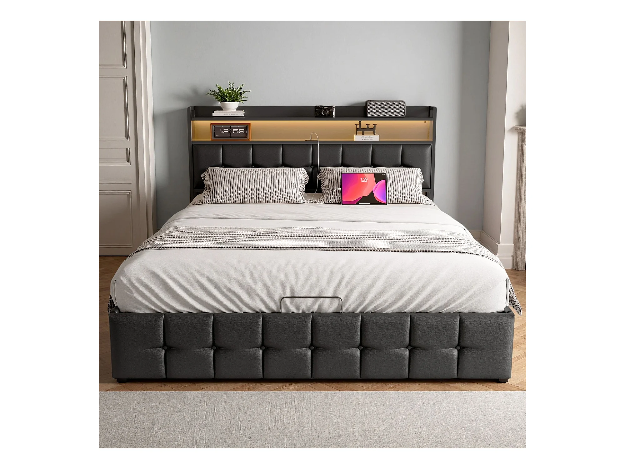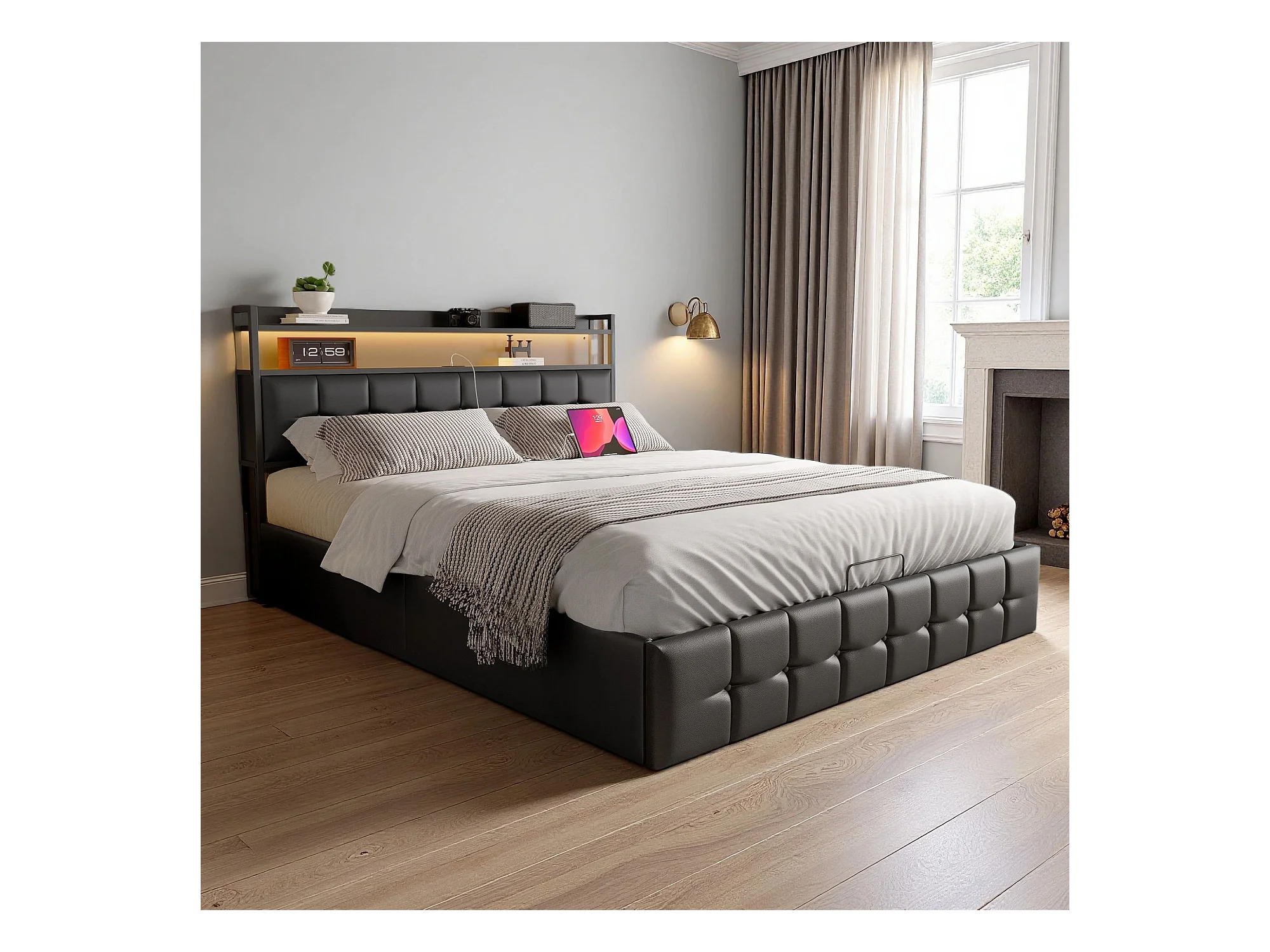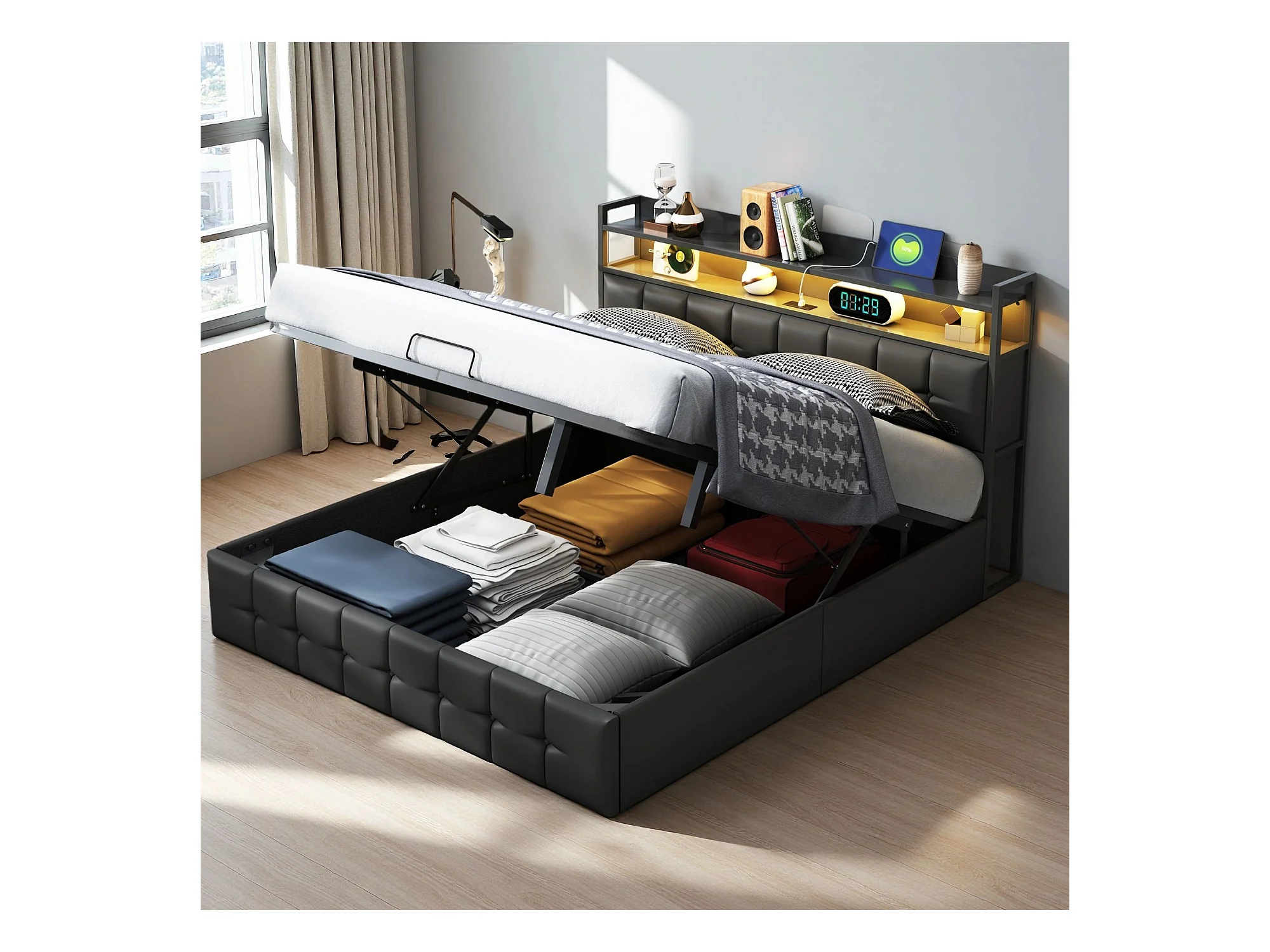 Lit coffre 140x190 cm - NEXU - LED - USB - lit adulte 140x190 cm avec sommier à lattes - lit double 140x190cm tissu en PU - noir