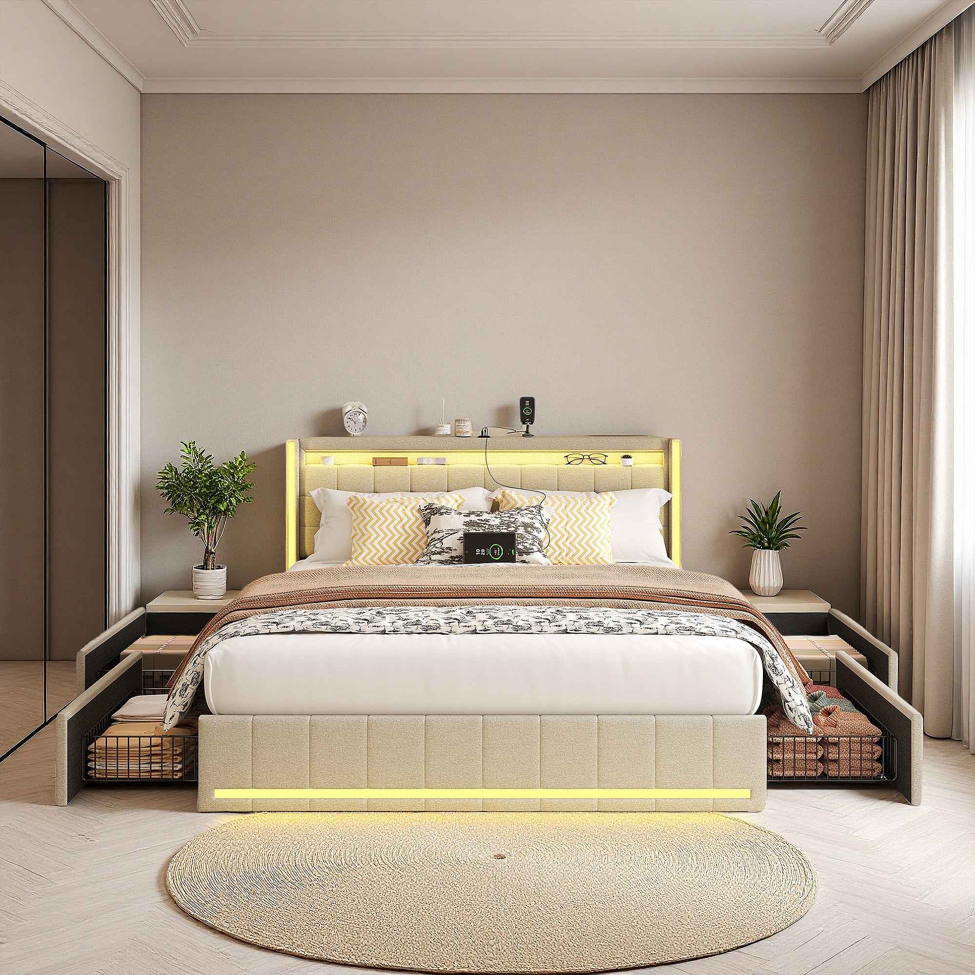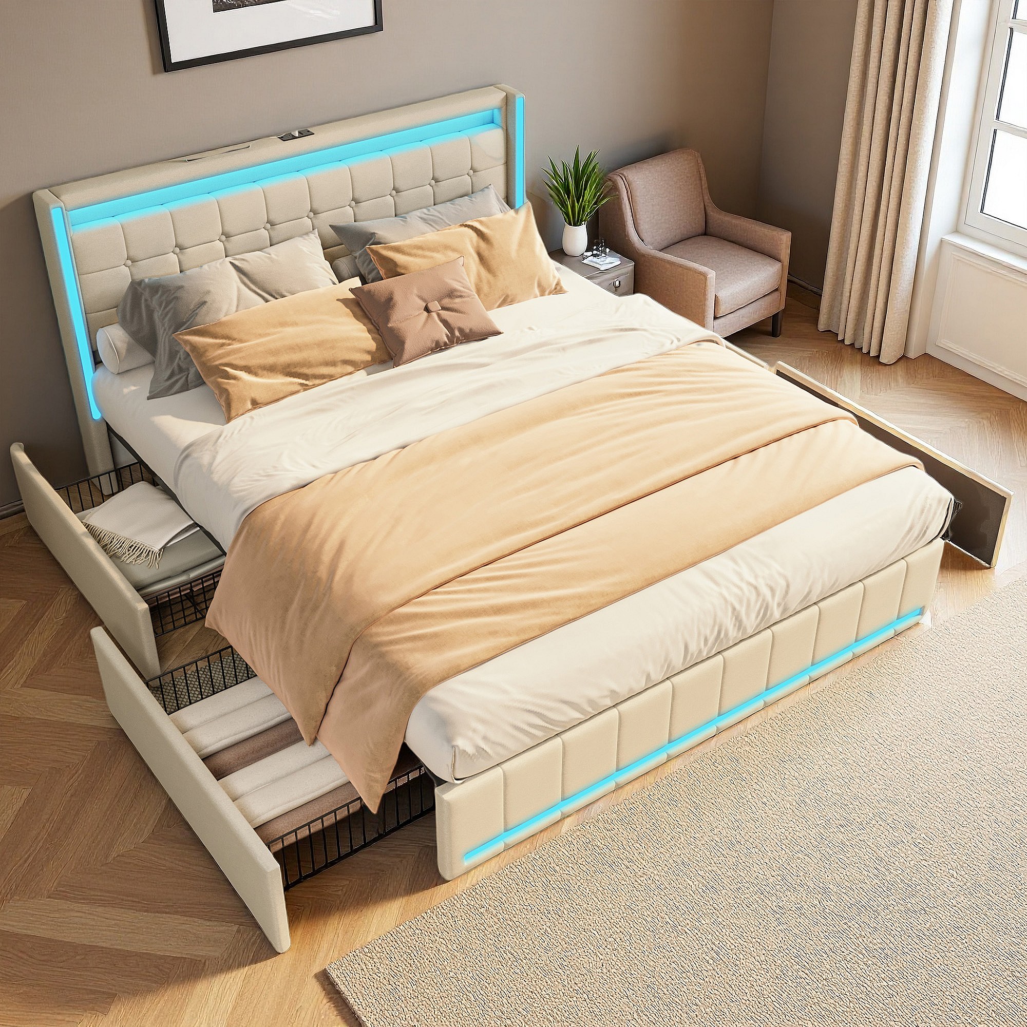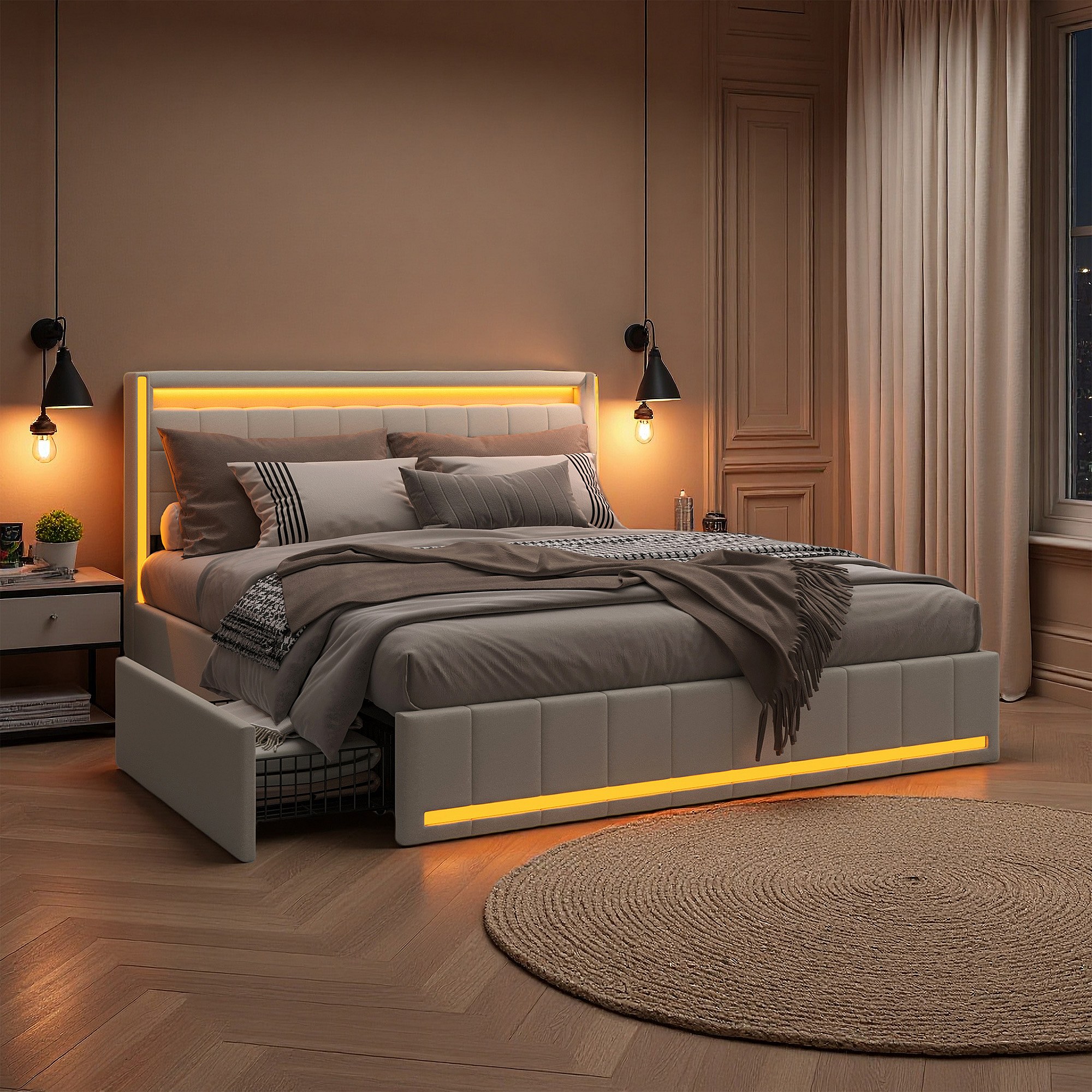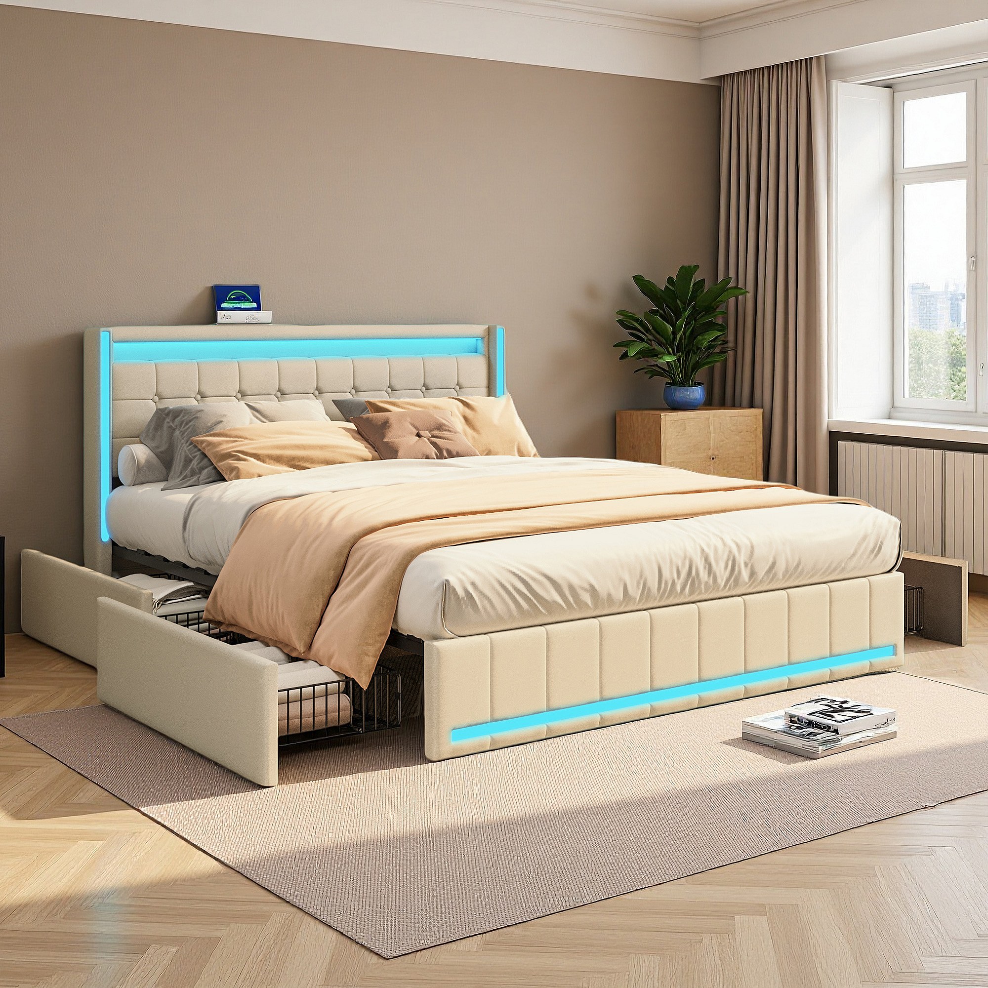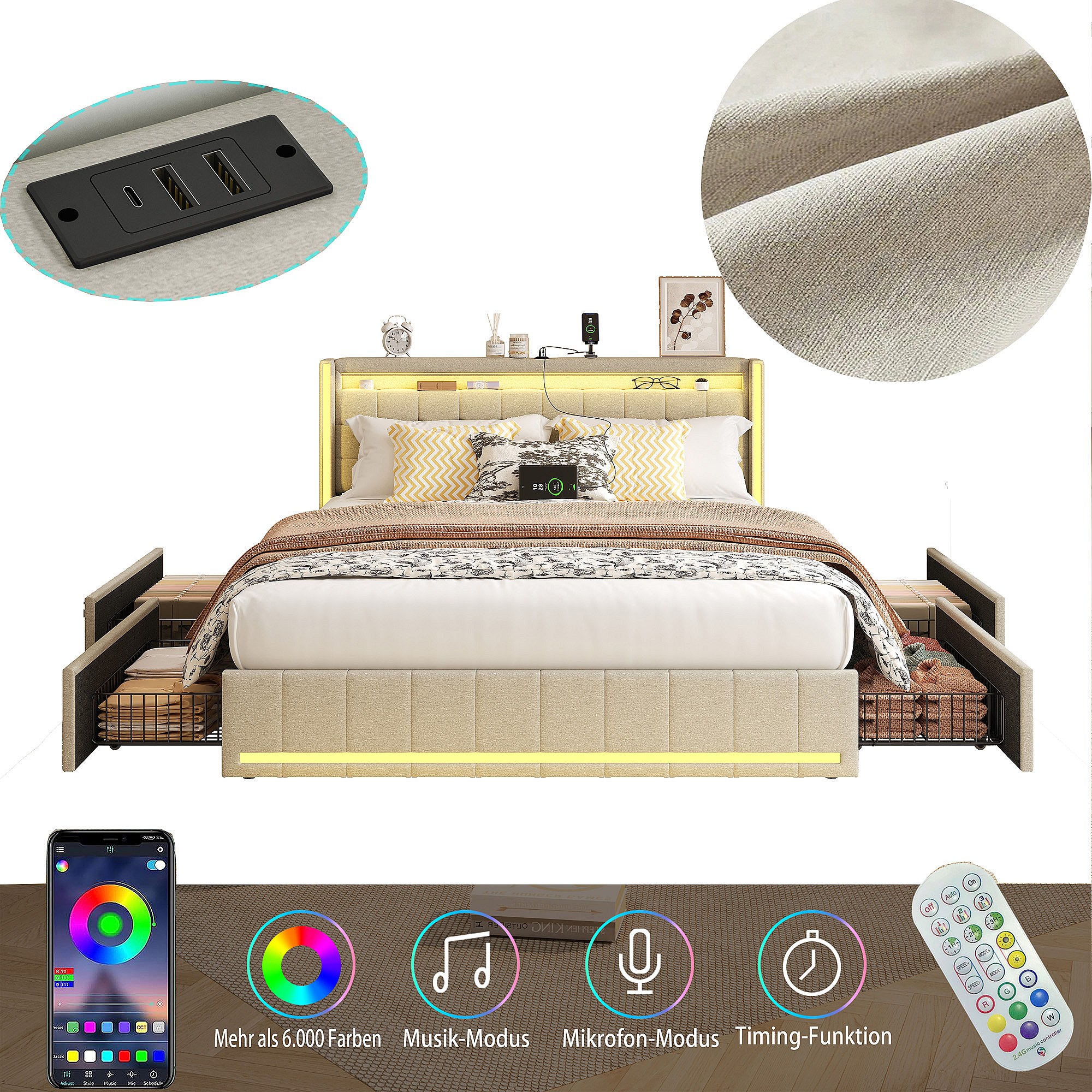 Lit 140x190 cm - NEXU - lit double 140x190 cm tiroir avec LED et USB - cadre de lit adulte 140x190 cm avec sommier à lattes - tissu en lin - beige
