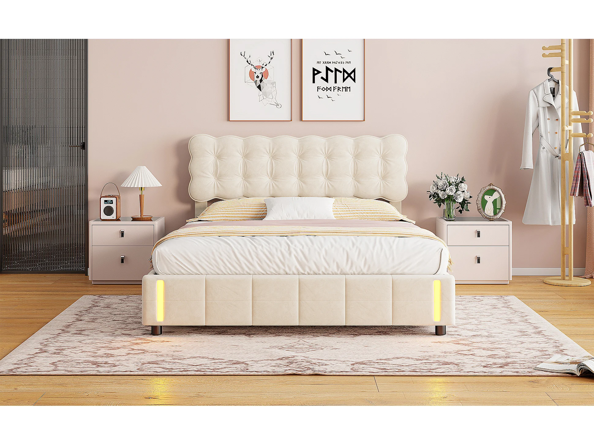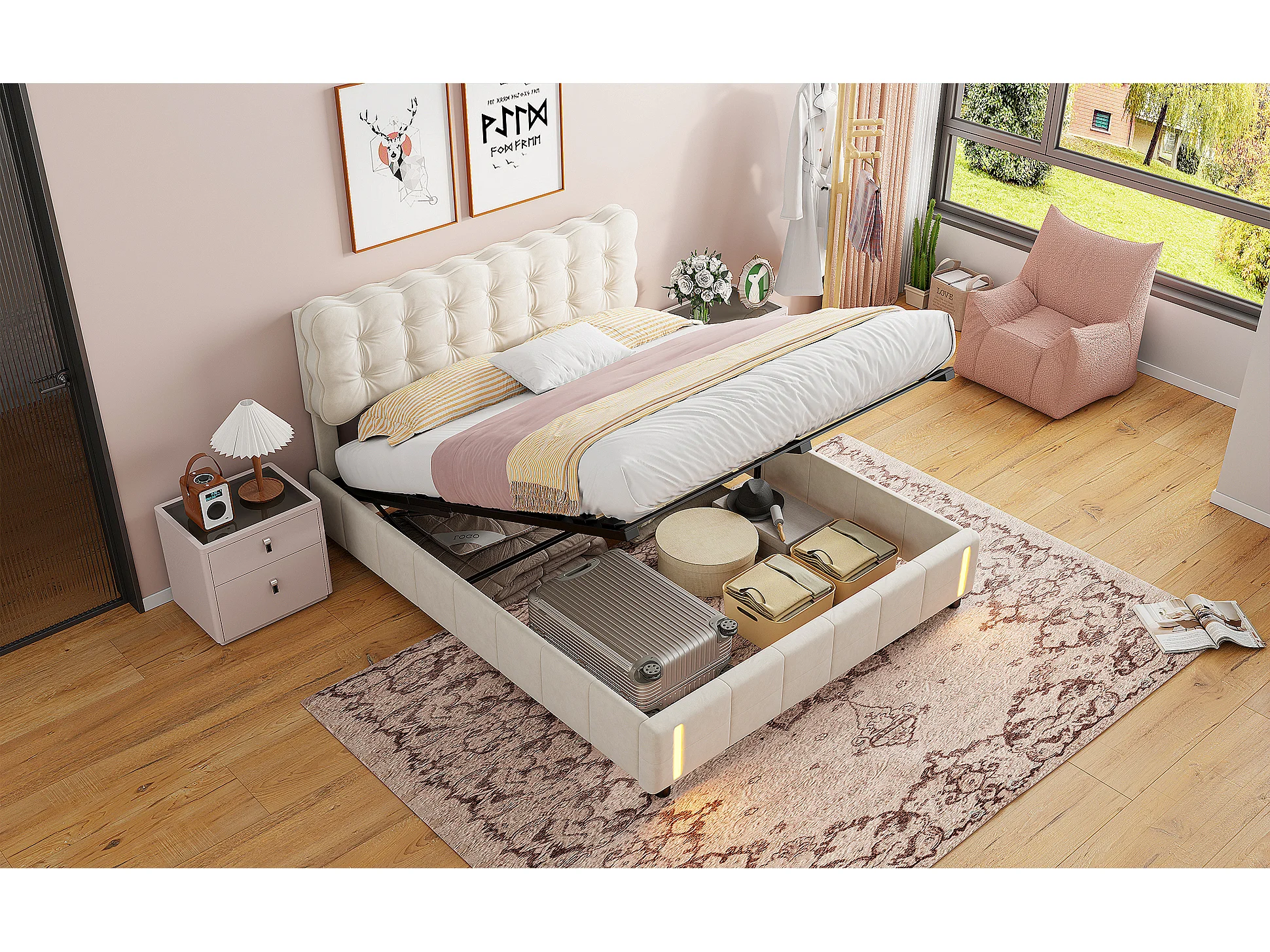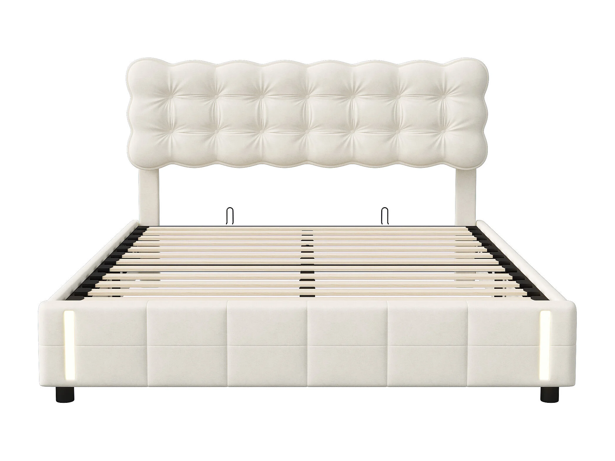 Lit coffre - 140 x 190 cm - Avec mécanisme de levage hydraulique et éclairage LED - Velours - Blanc crème