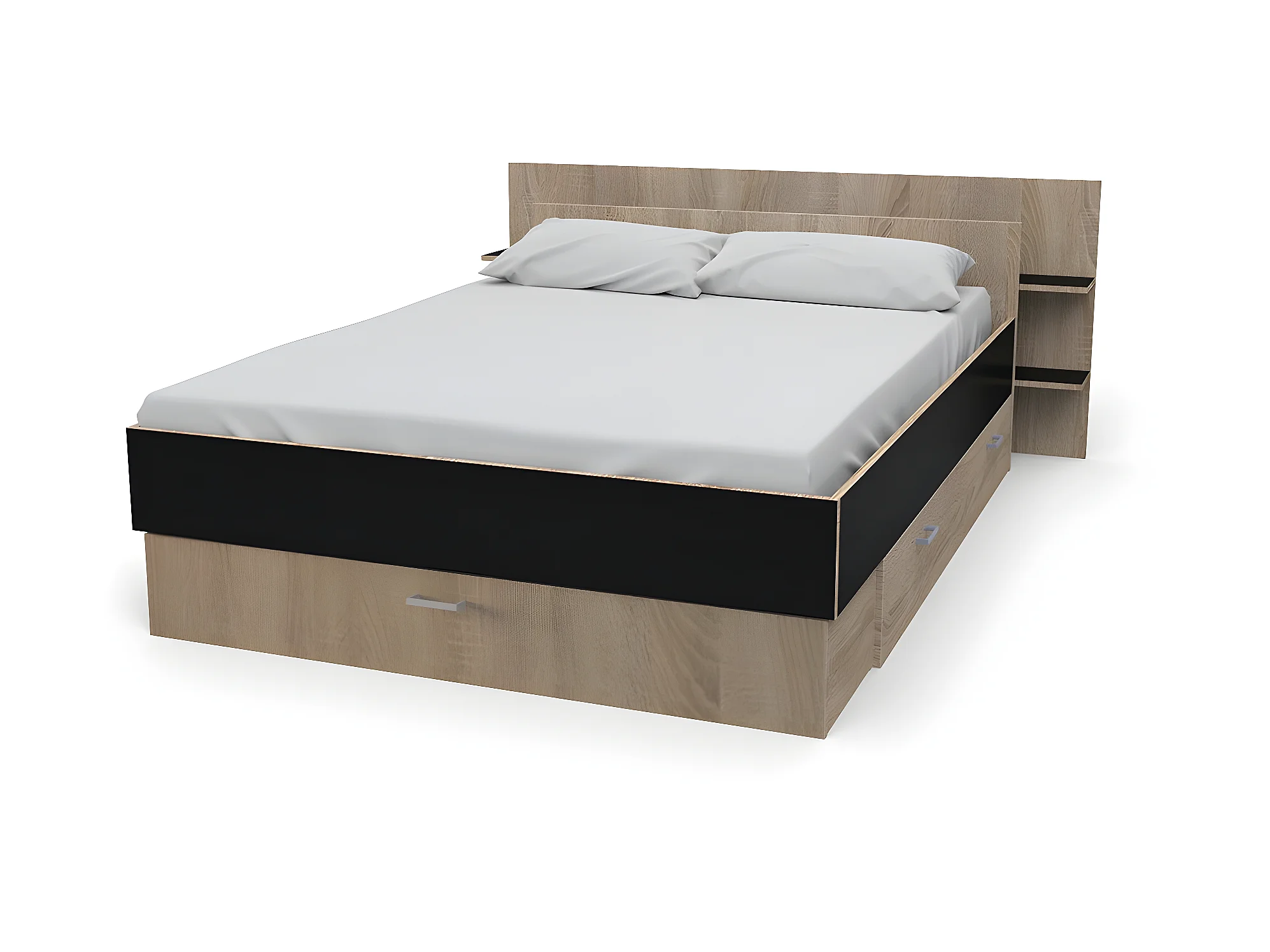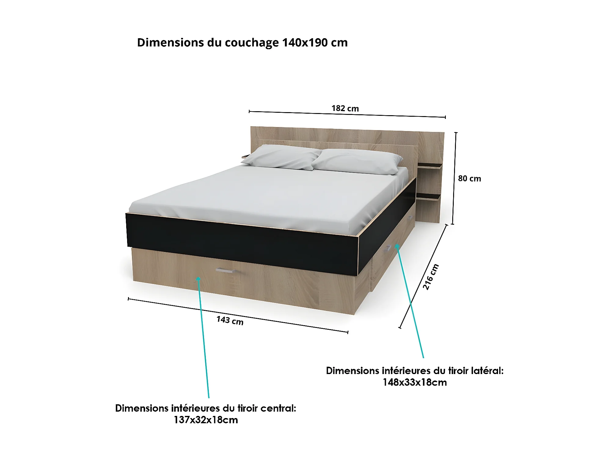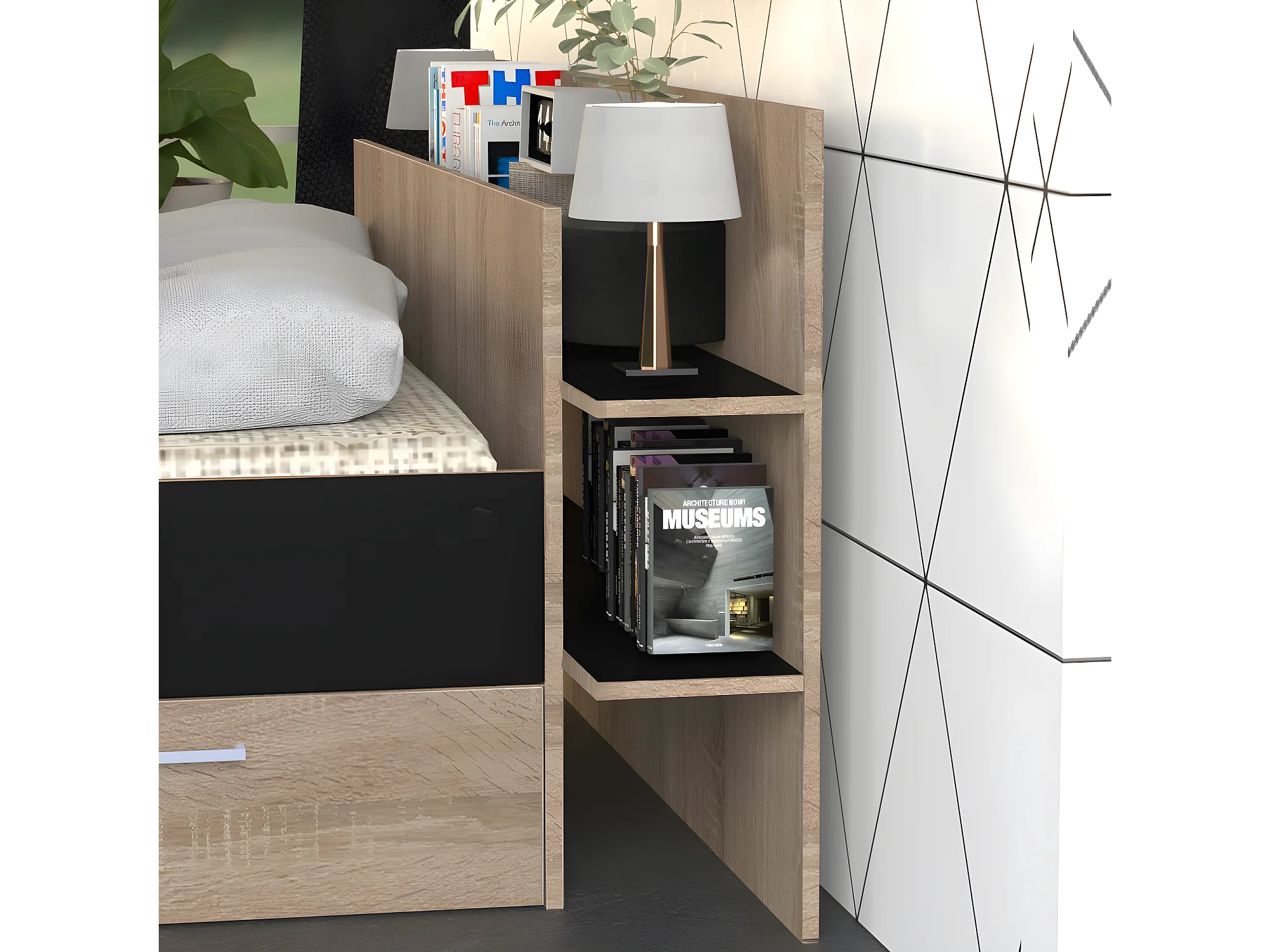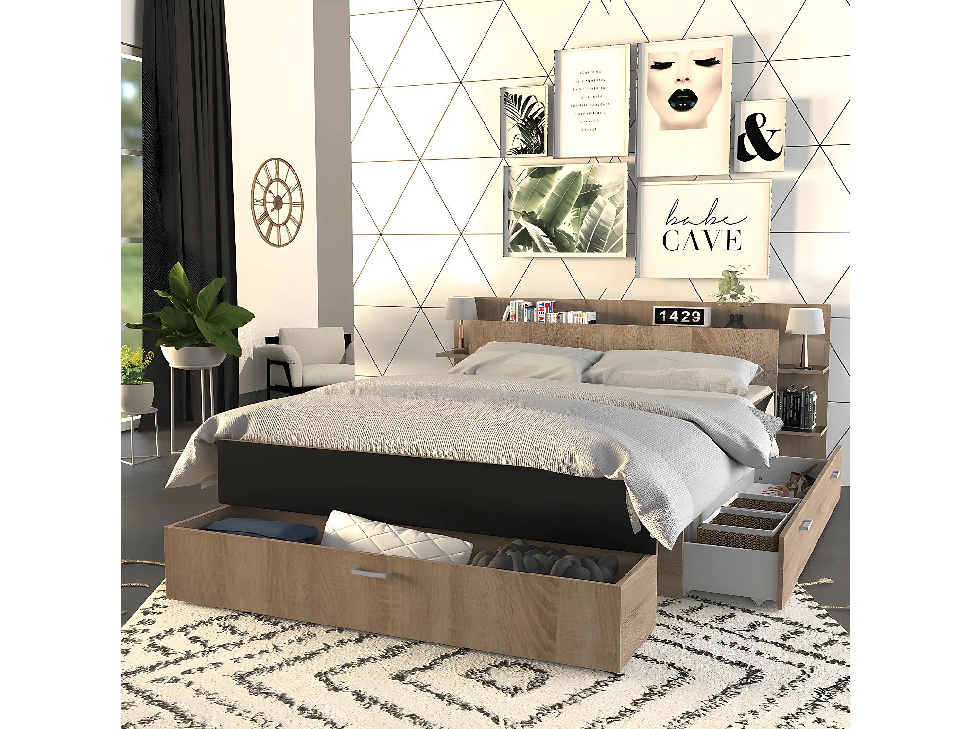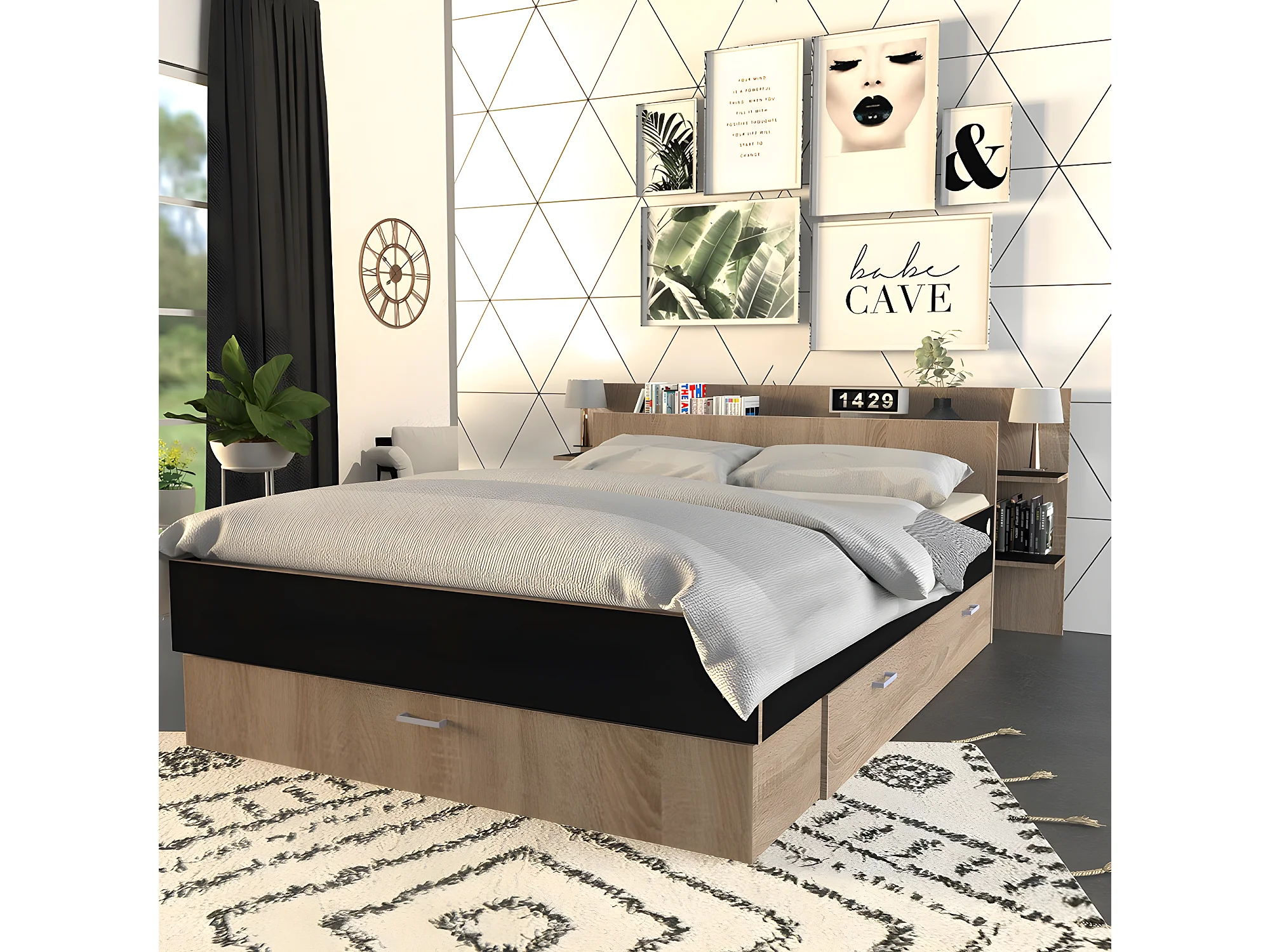 Lit SAMBA 140x190cm + tête de lit + 2 tiroirs / Décor Noir & chêne blanchi