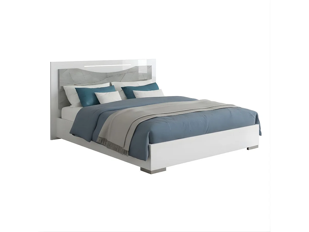 Lit 140x190cm avec ruban led sur tête de lit laqué blanc et imitation marbre - GENESIS