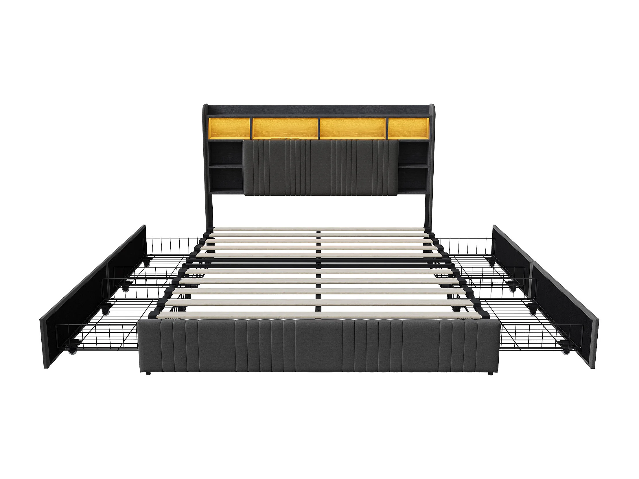 Lit 140x200 cm - avec 4 tiroirs - chargement USB et Type-C - éclairage LED - tables de chevet avec rangement - cloisons ouvertes - sommier à lattes - Gris