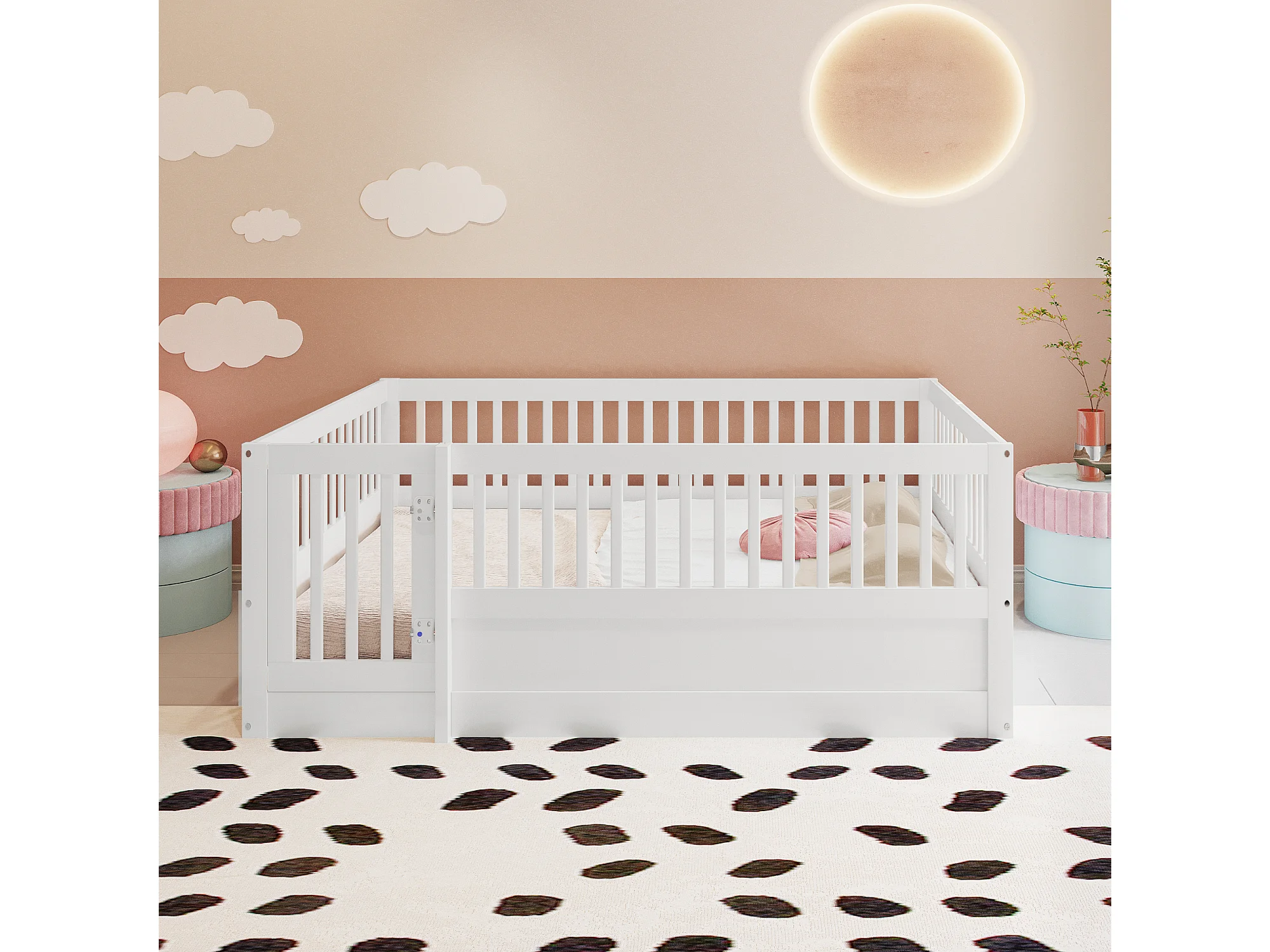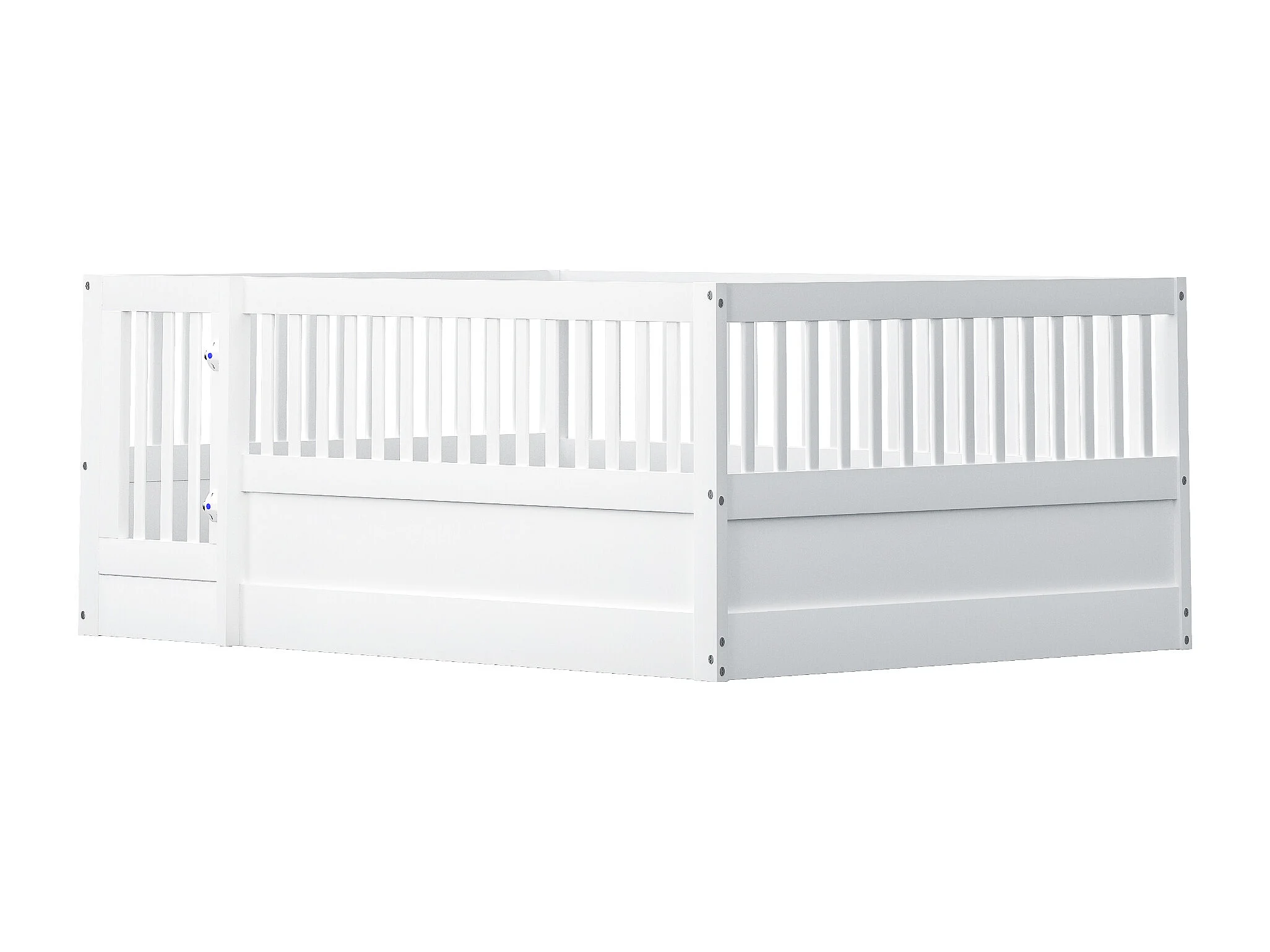 Lit 140x200 cm avec cadre en bois, grille de protection et porte, blanc (205x145x60 cm)