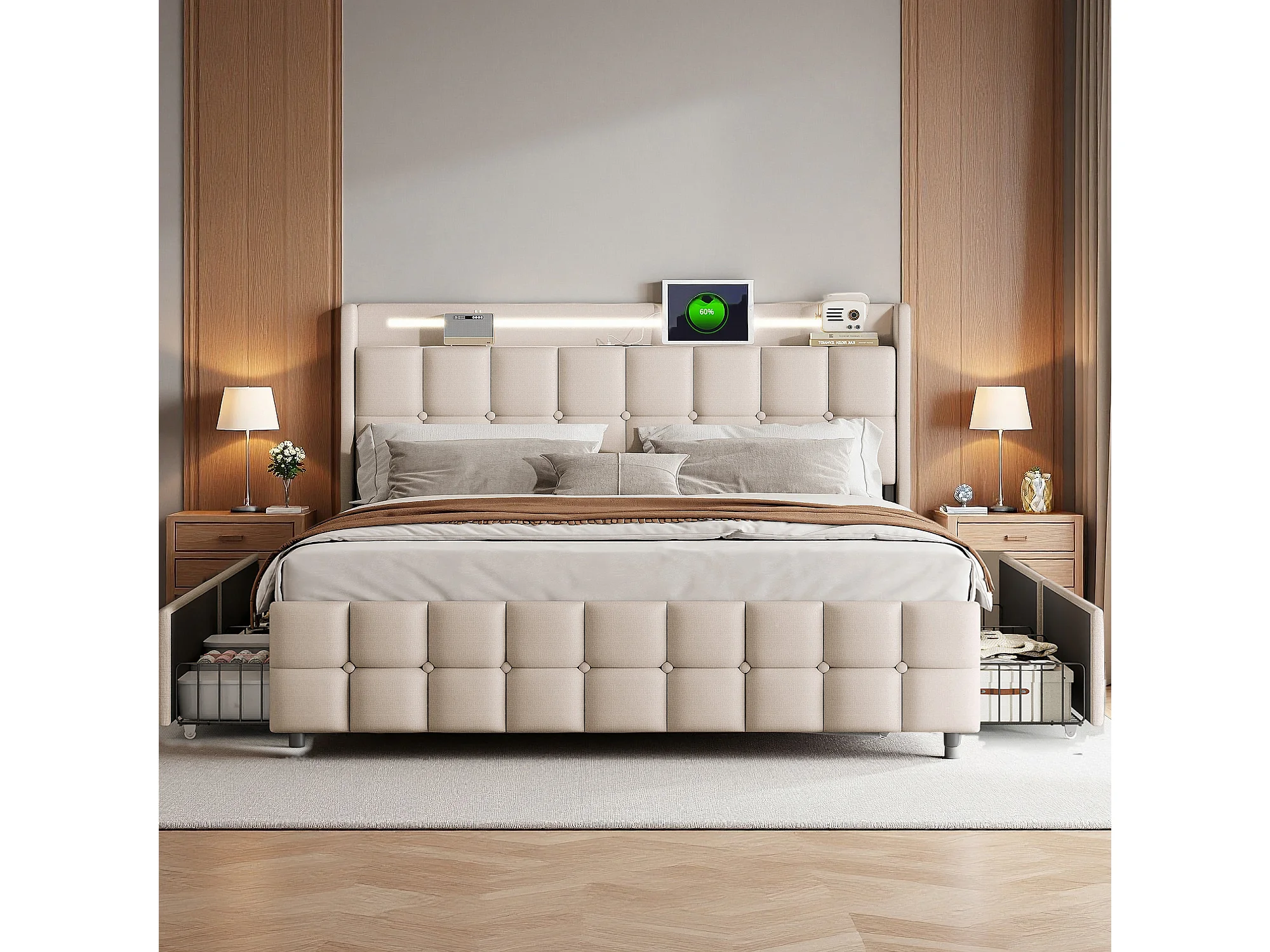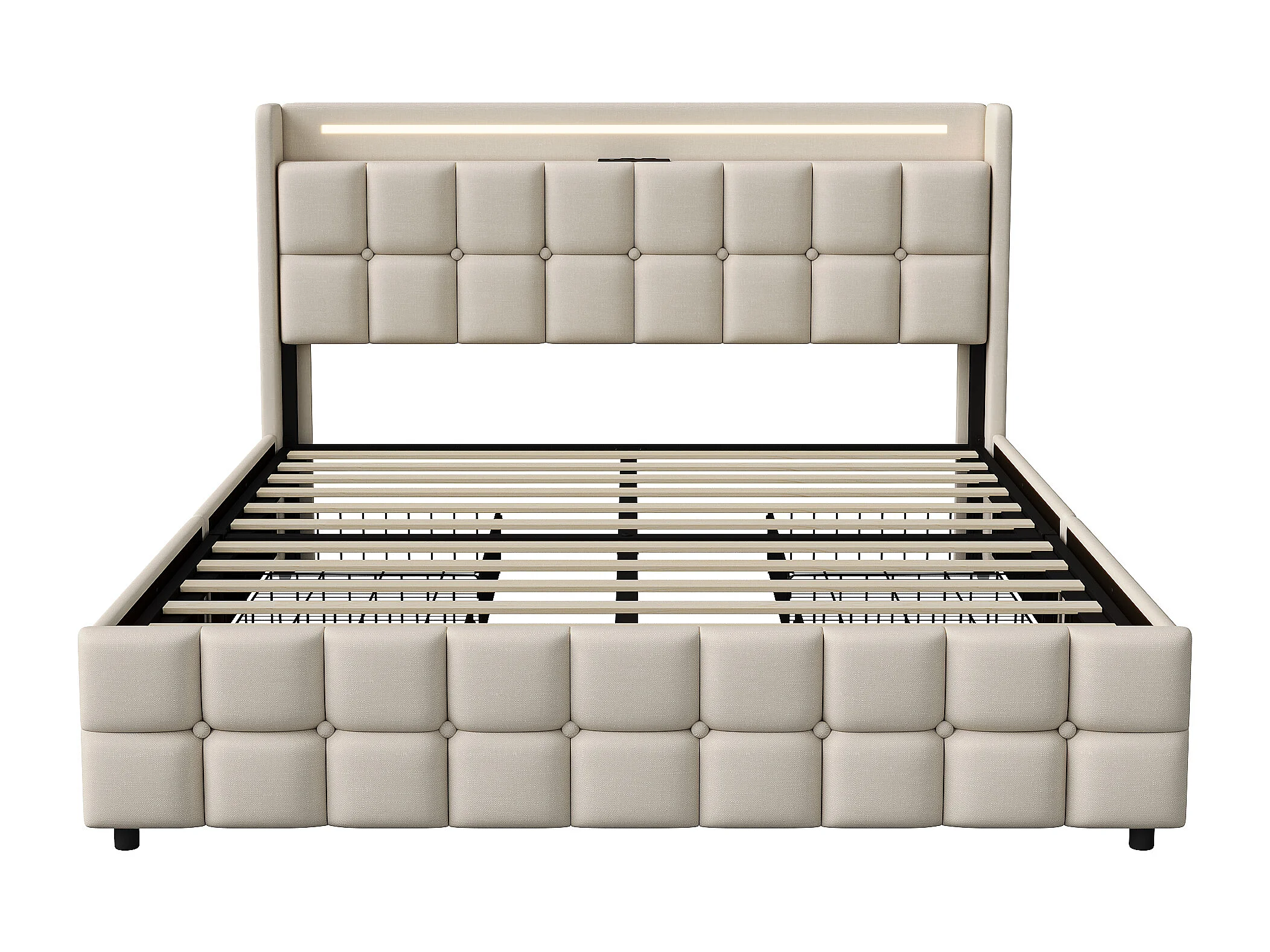 Lit capitonné 140x200 cm avec sommier à lattes - cadre de lit adulte 140x200 avec tiroirs - LED et USB - tissu en lin - beige