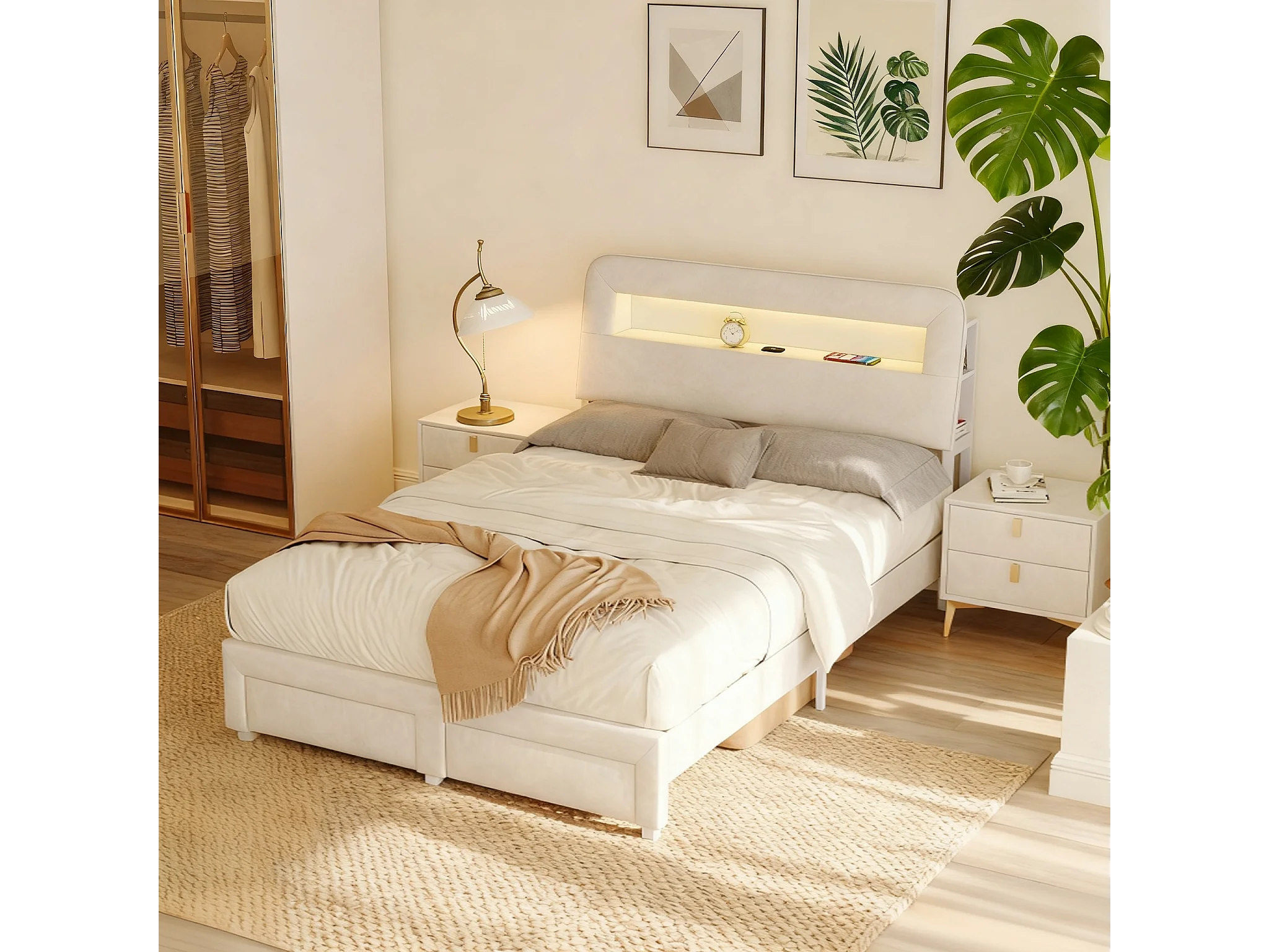 Lit adulte 140x200 cm tissu en velours avec sommier à lattes, lit tiroir 140x200 cm avec LED et USB , style scandinave, rangement soldes, blanc casse