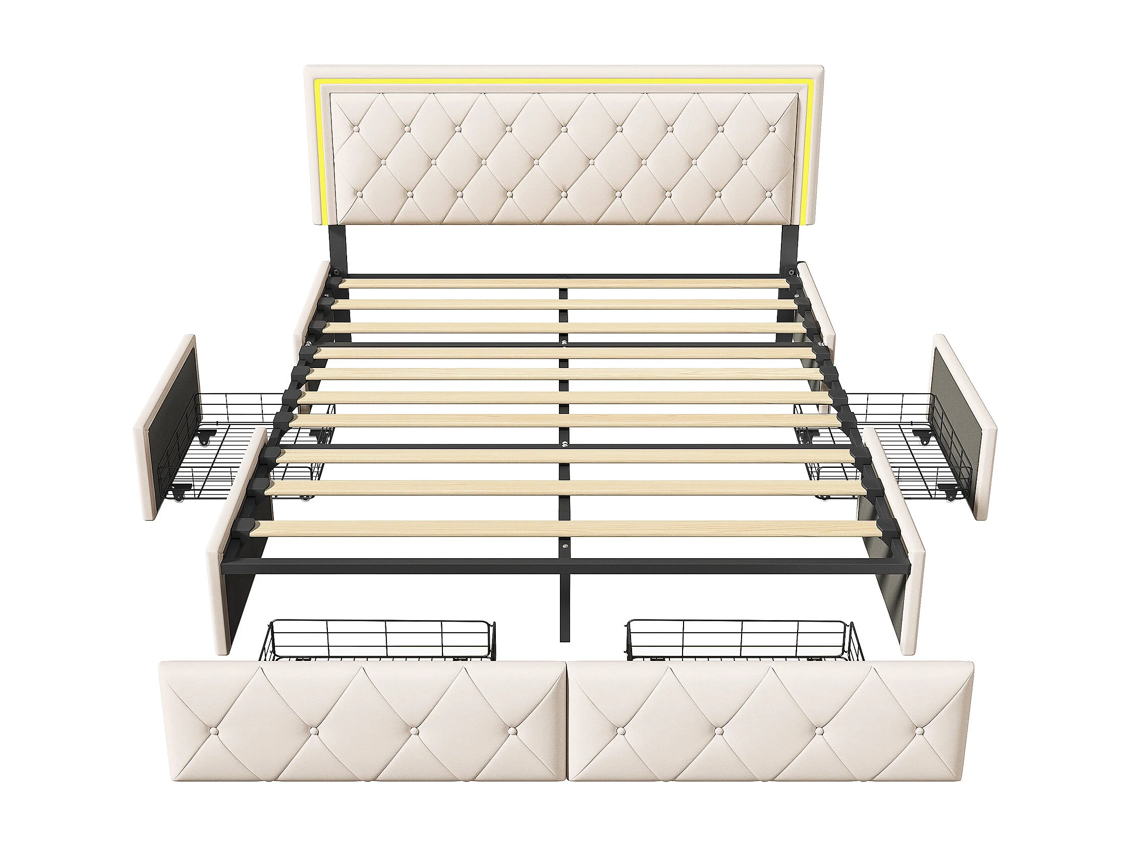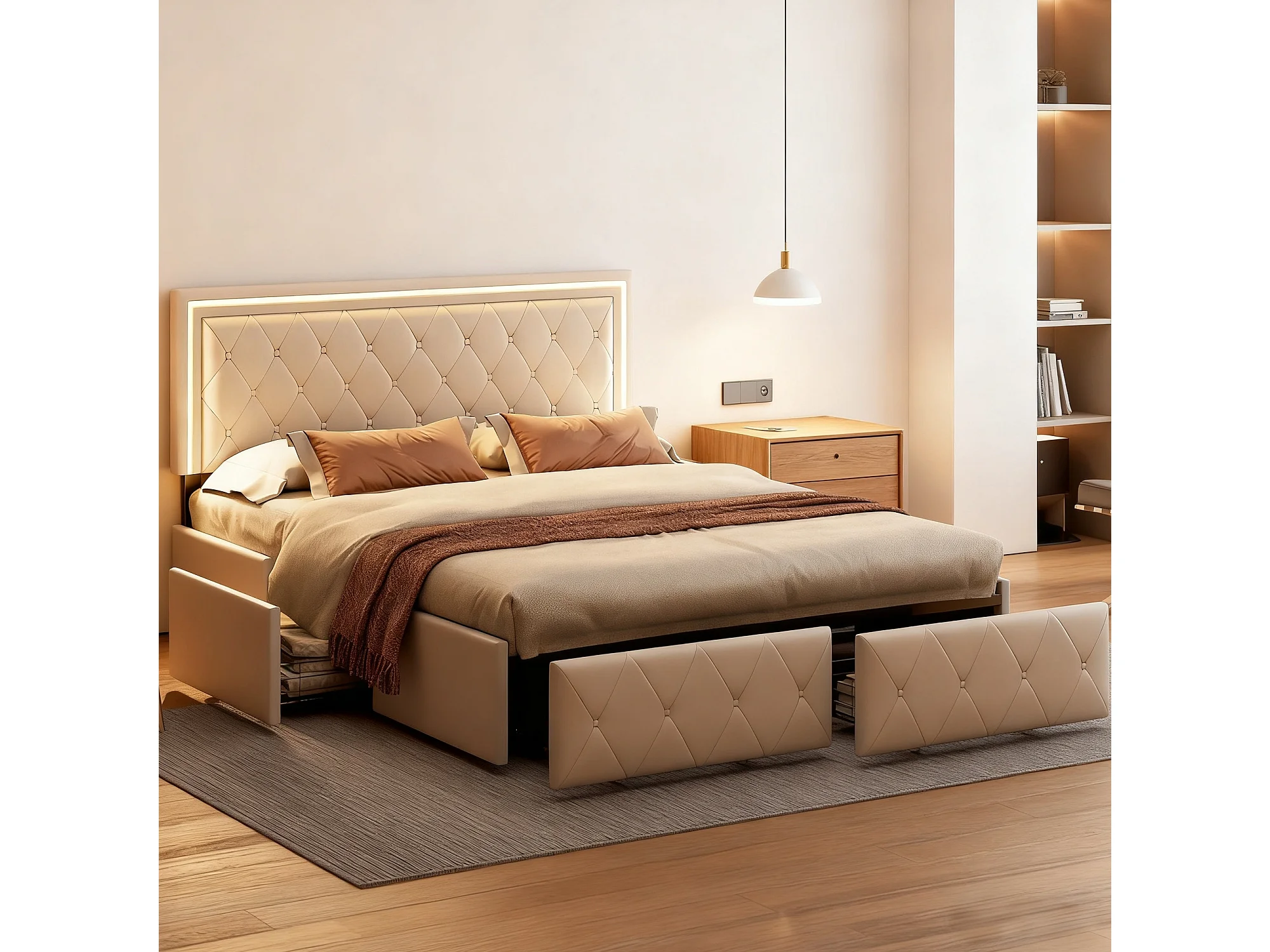Lit 140x200 cm avec sommier à lattes et LED - lit double 140x200 cm avec 4 tiroir - lit capitonné en tissu en PU - matelassés - blanc cassé