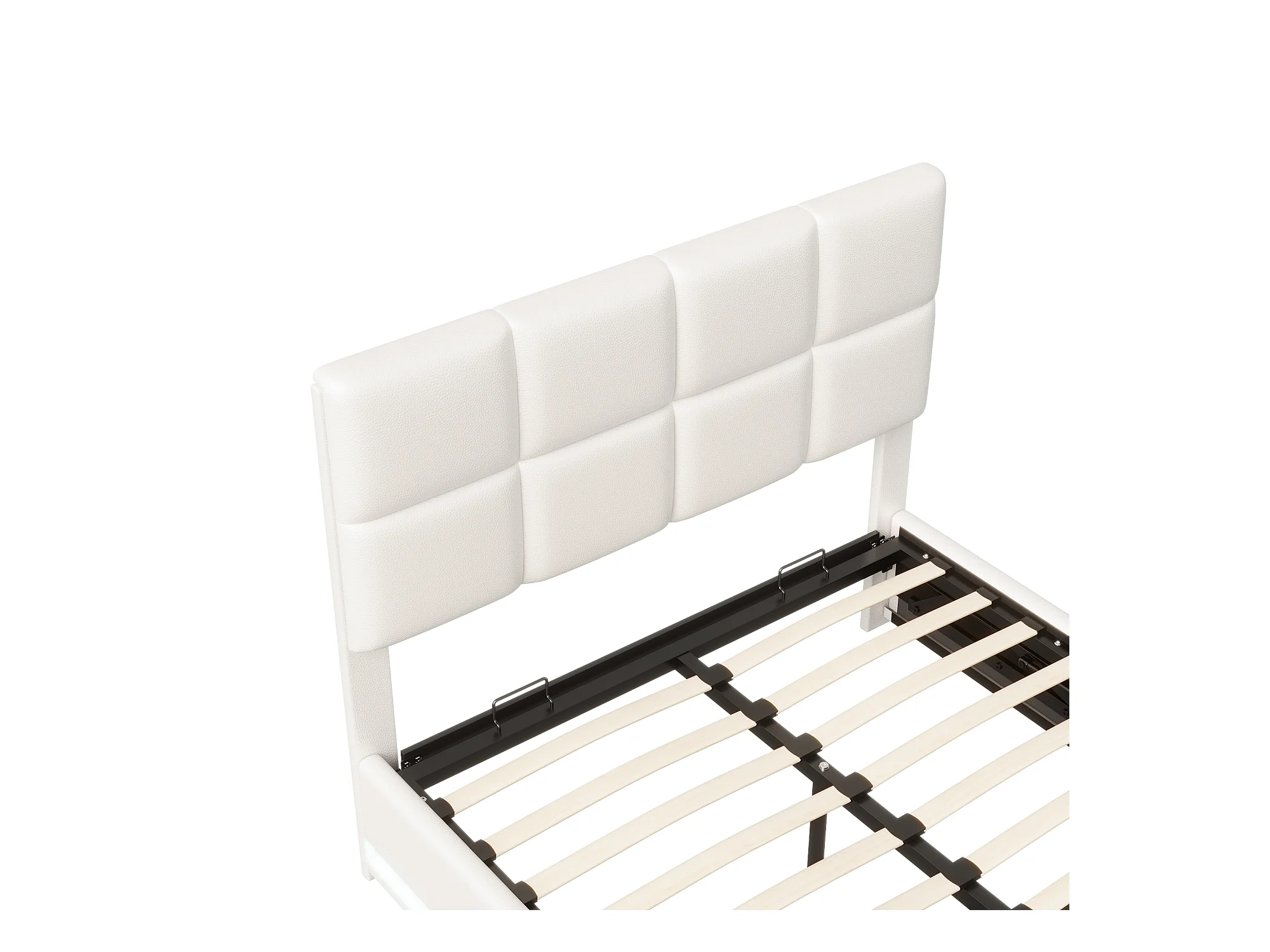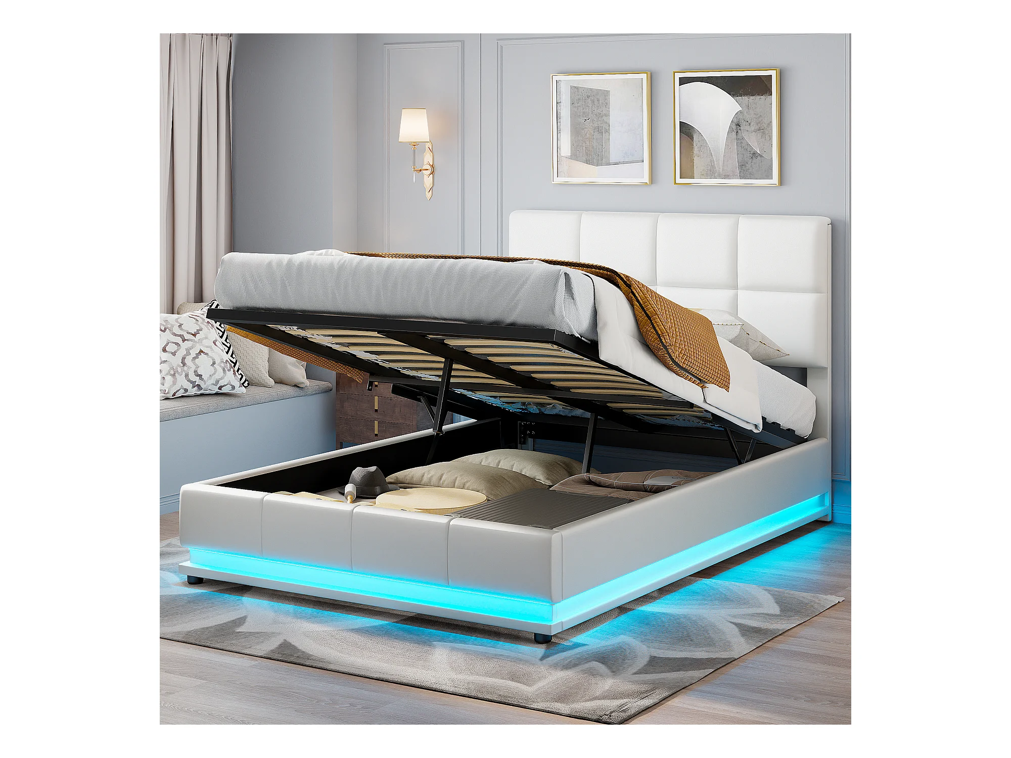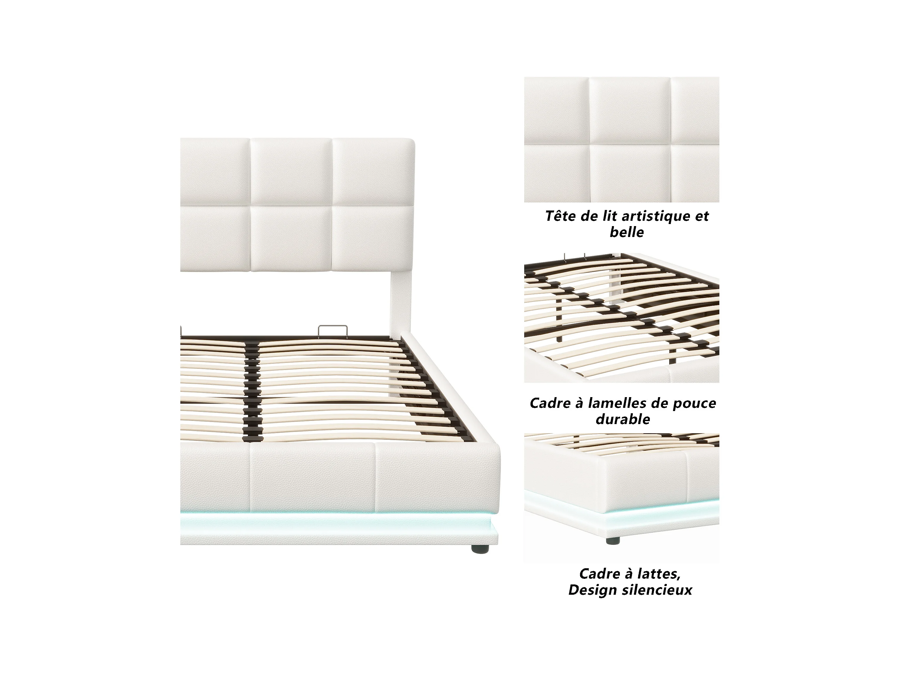 Lit capitonné 140x200 cm avec éclairage LED, lit relevable hydraulique, rangement, PU, ​​blanc