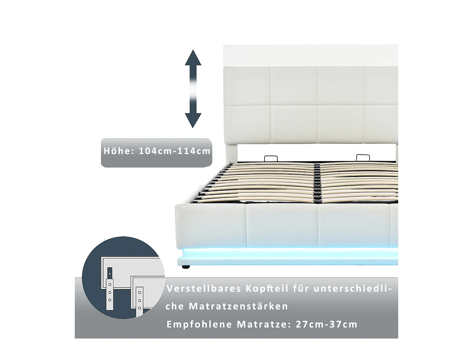 Lit 140x200 Cm Avec LED, Tête Relevable, Sommier Lattes, Rangement, Pu Capitonné, Blanc