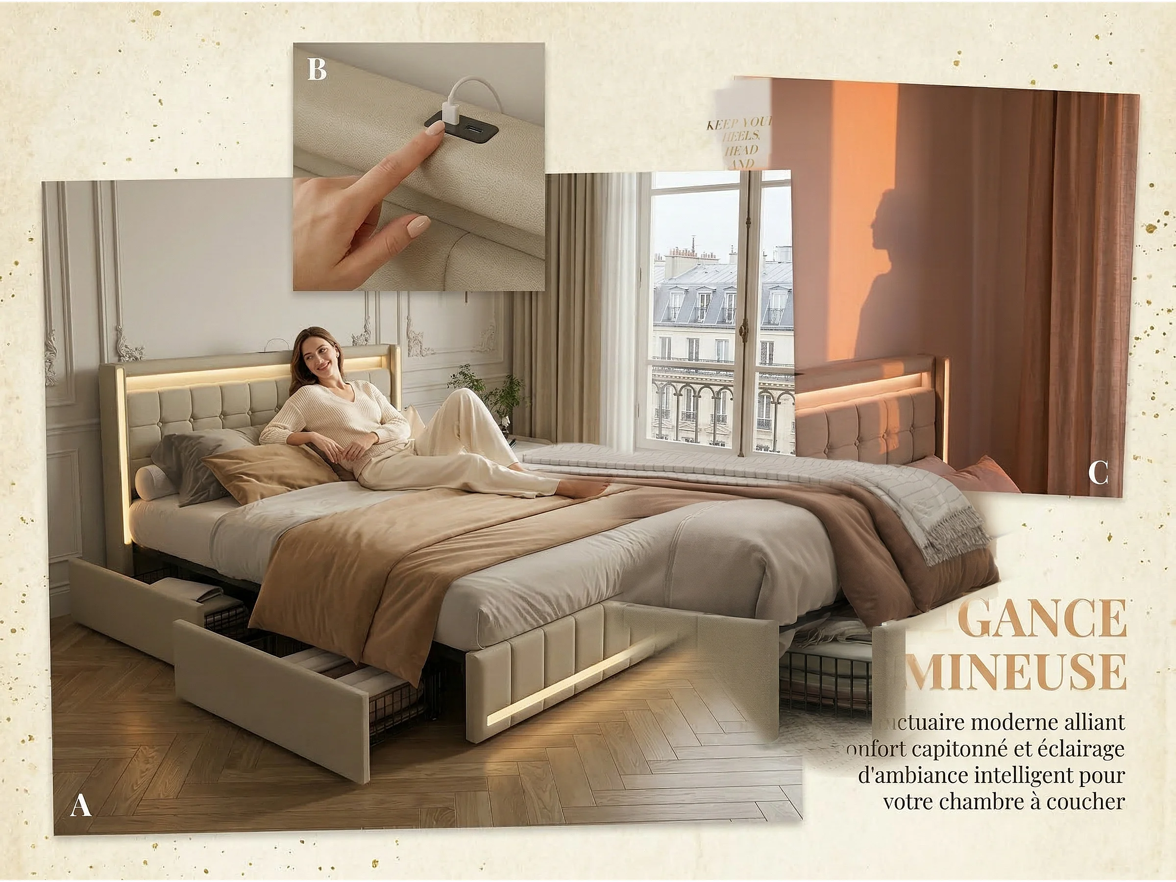 Lit coffre 140x200 cm en tissu lin avec LED, USB et Type-C - tête de lit avec étagères - sommier à lattes - beige