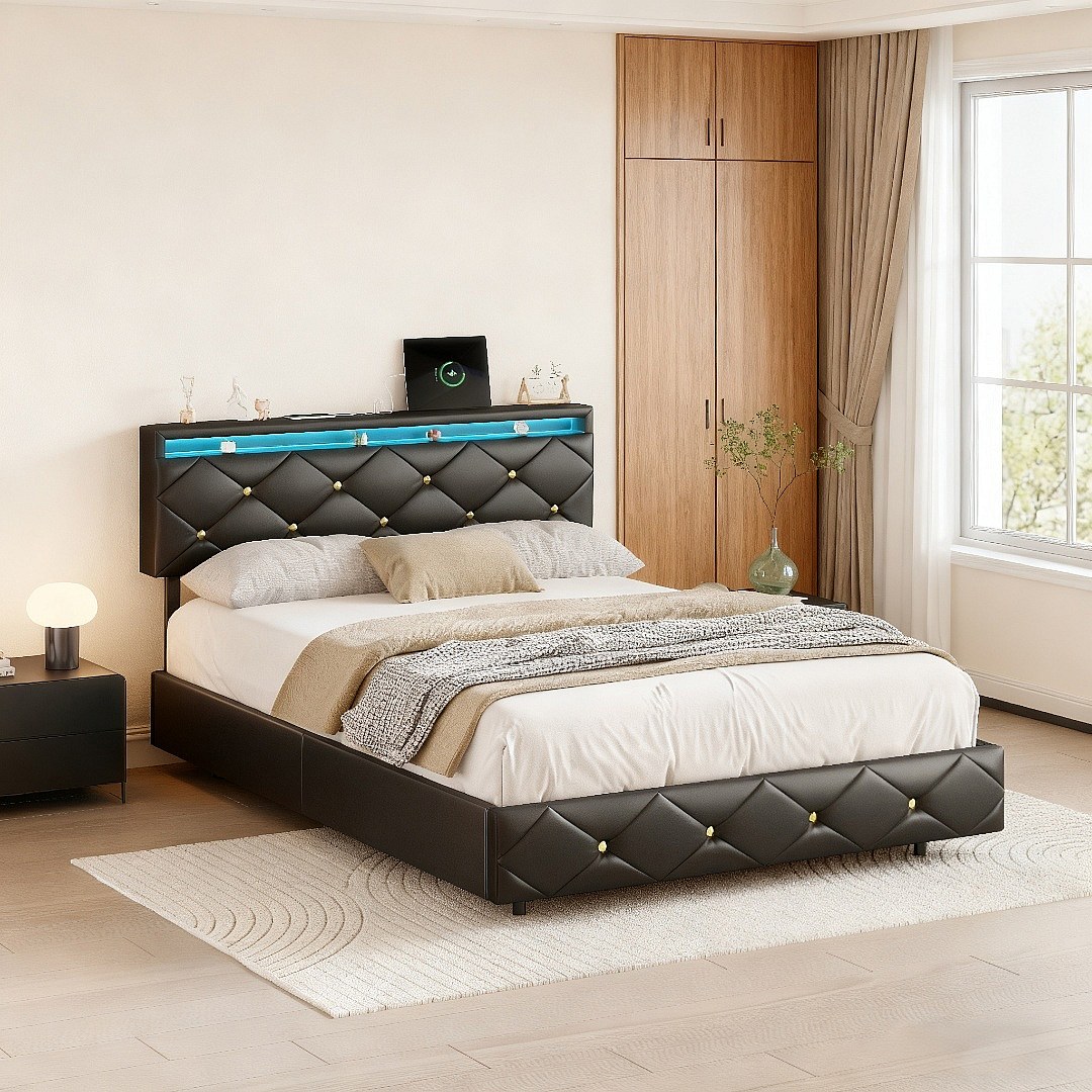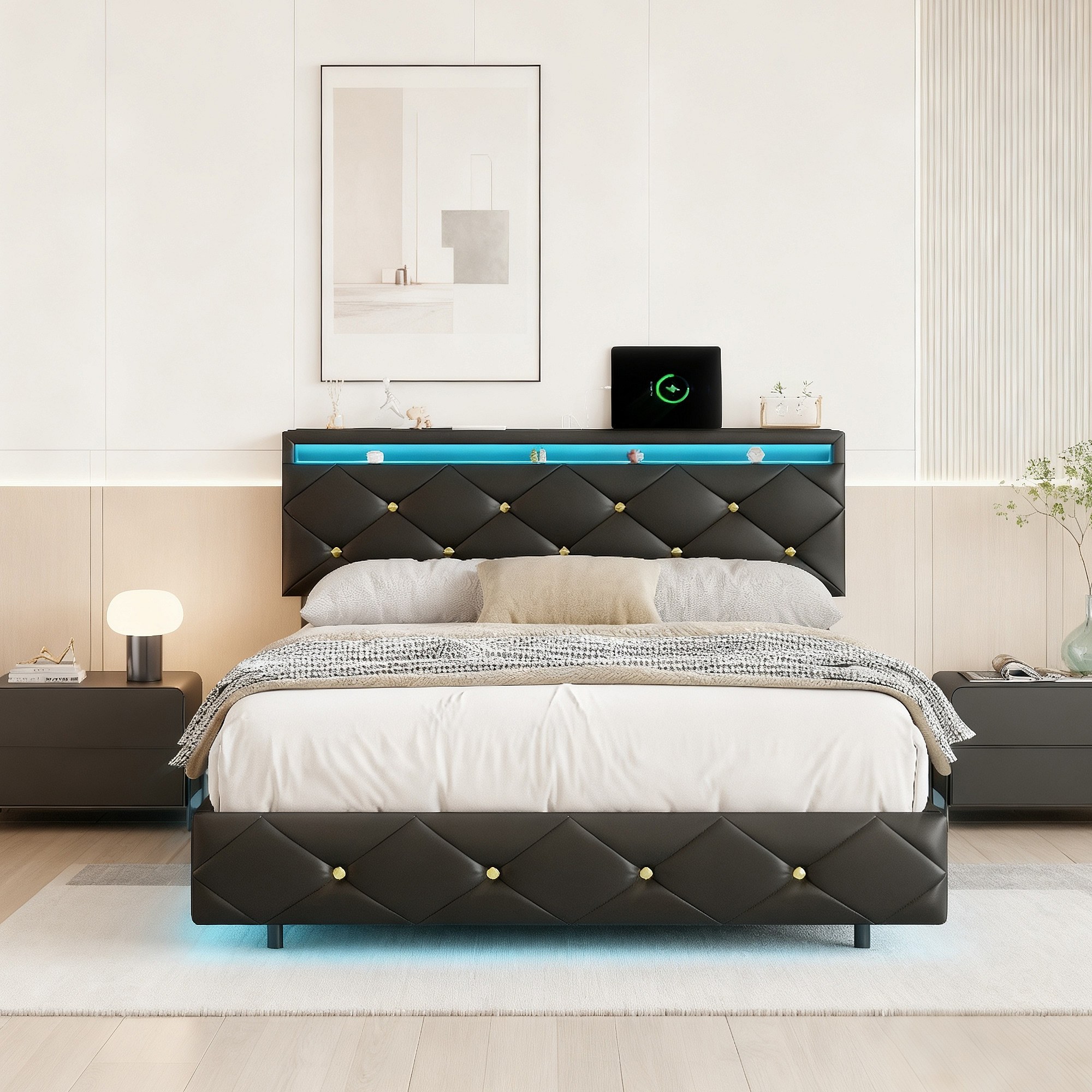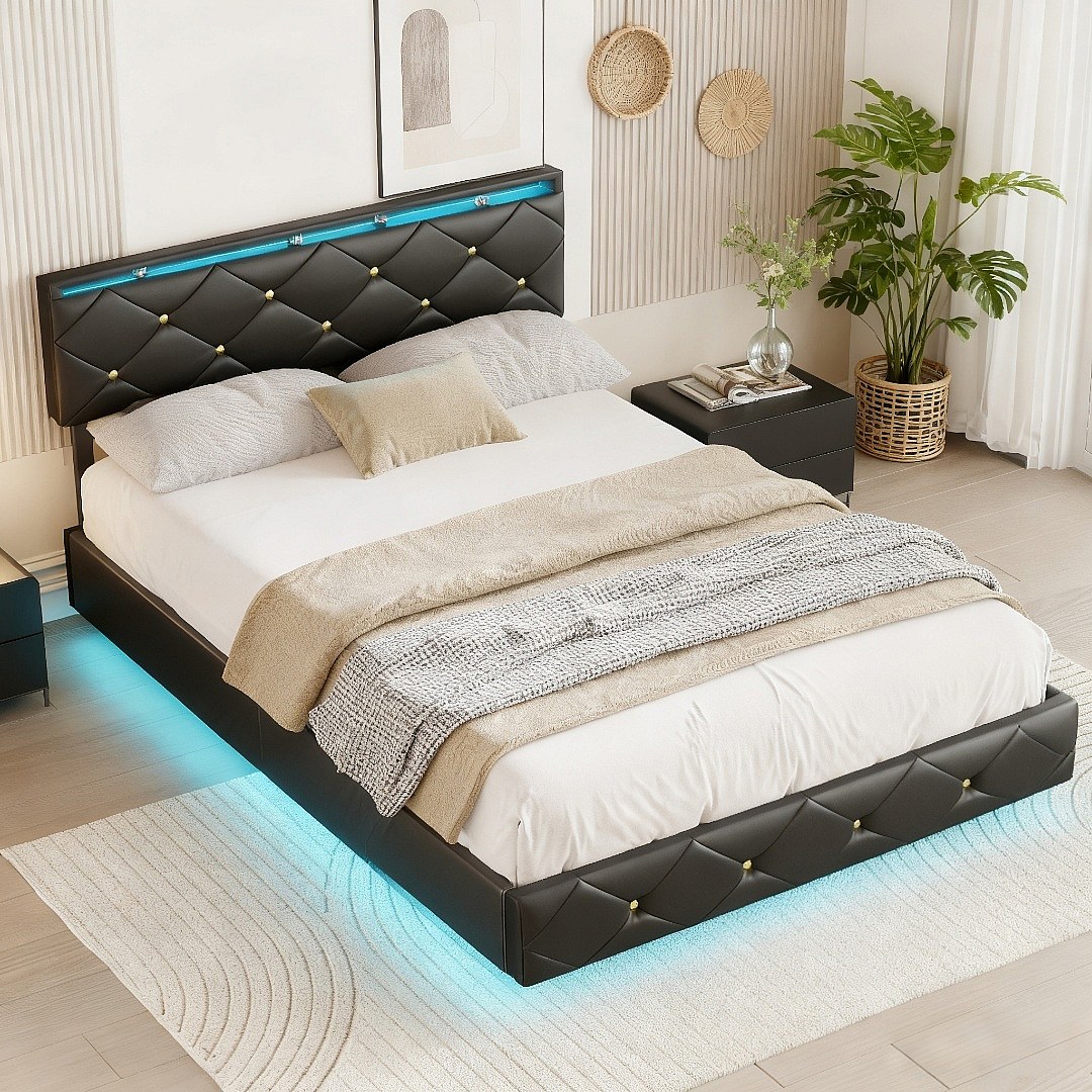 Lit 140x200 cm avec sommier à lattes - NEXU - LED - USB - tissu en PU - cadre de lit flottant 140x200 cm - noir