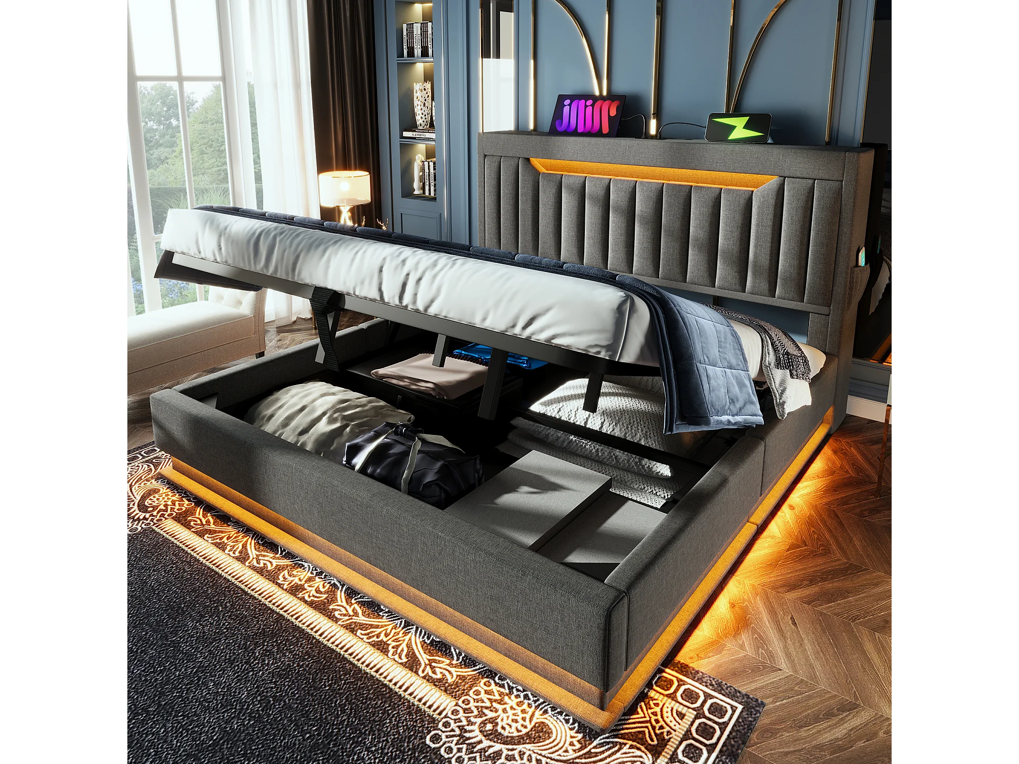 Lit 140x200 cm avec tête de lit de rangement, ports USB et Type-C, éclairage LED, stockage hydraulique, lin gris (218x142x112 cm)