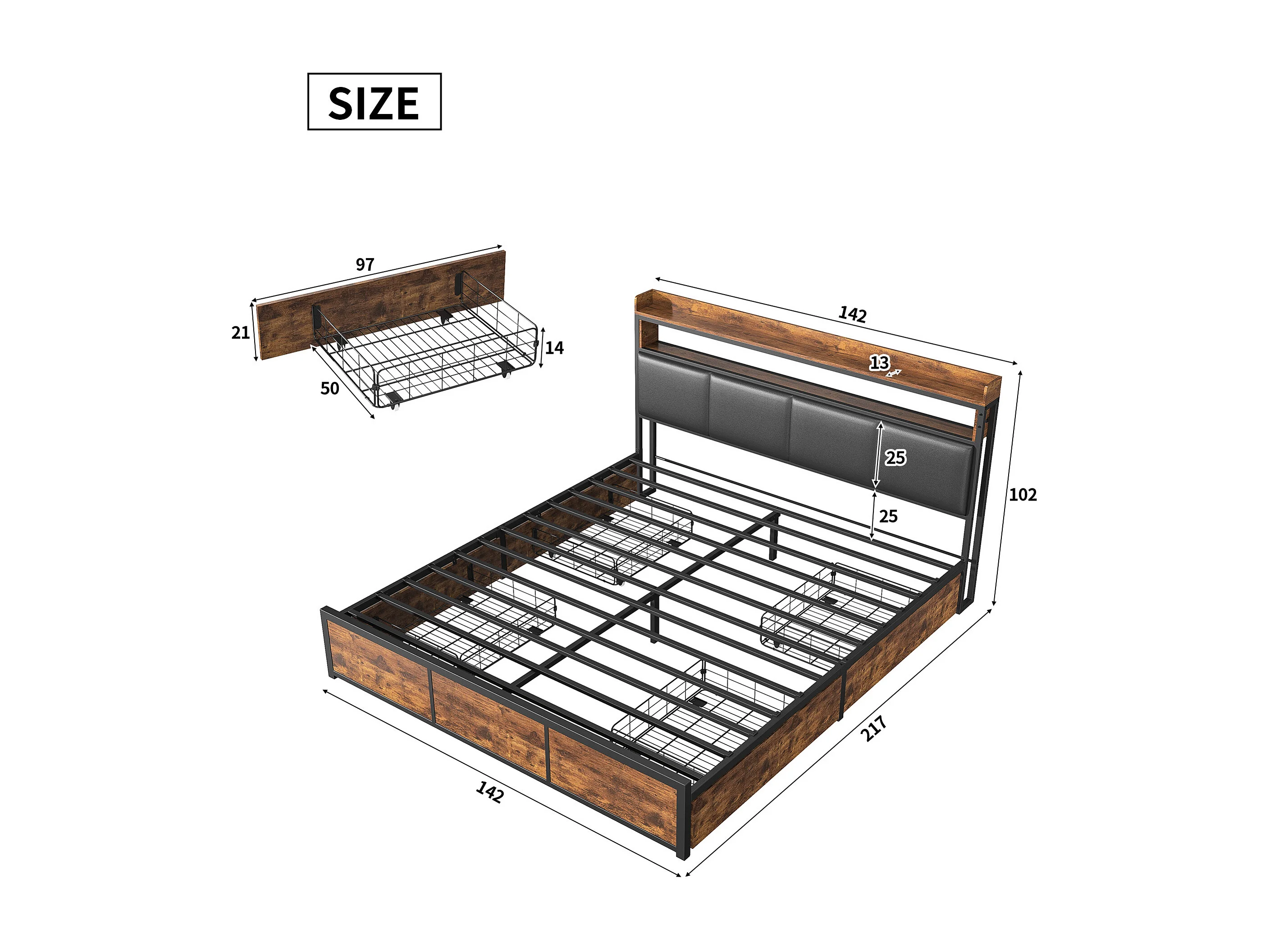 Lit 140x200 cm en métal, Structure de lit, Lit 2 personnes, Noir, Lit Adulte avec 4 tiroirs, Sommier à lattes en métal