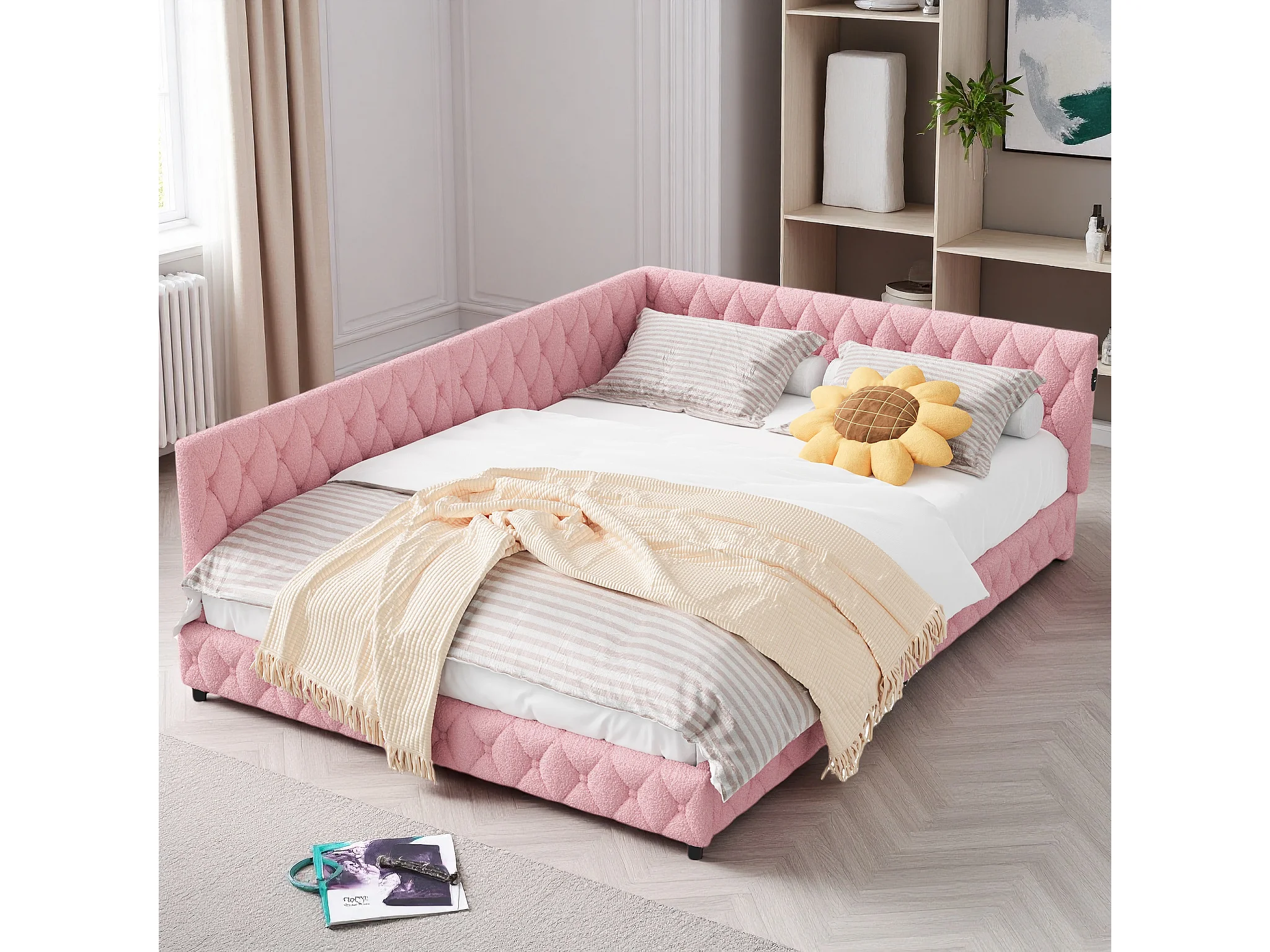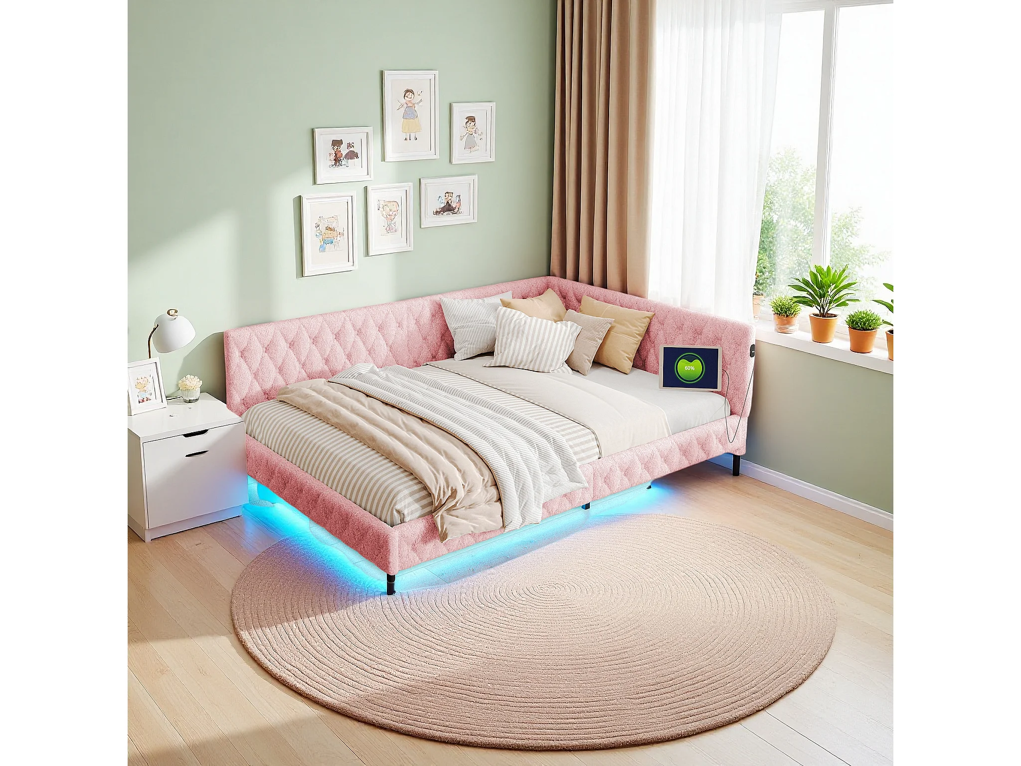 Lit 140x200 cm en tissu doudou rose avec éclairage LED périphérique et ports USB intégrés, design moderne et cosy