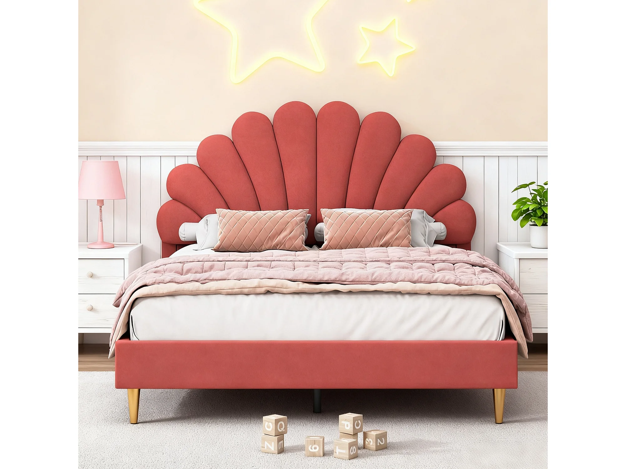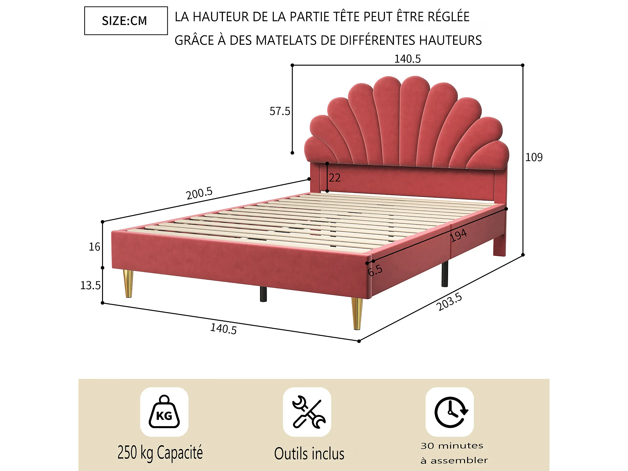 Lit coquillage lit 140 x 200 cm avec sommier à lattes, tête de lit réglable, lit double rembourré 140x200 cm tuiss en velours, rouge