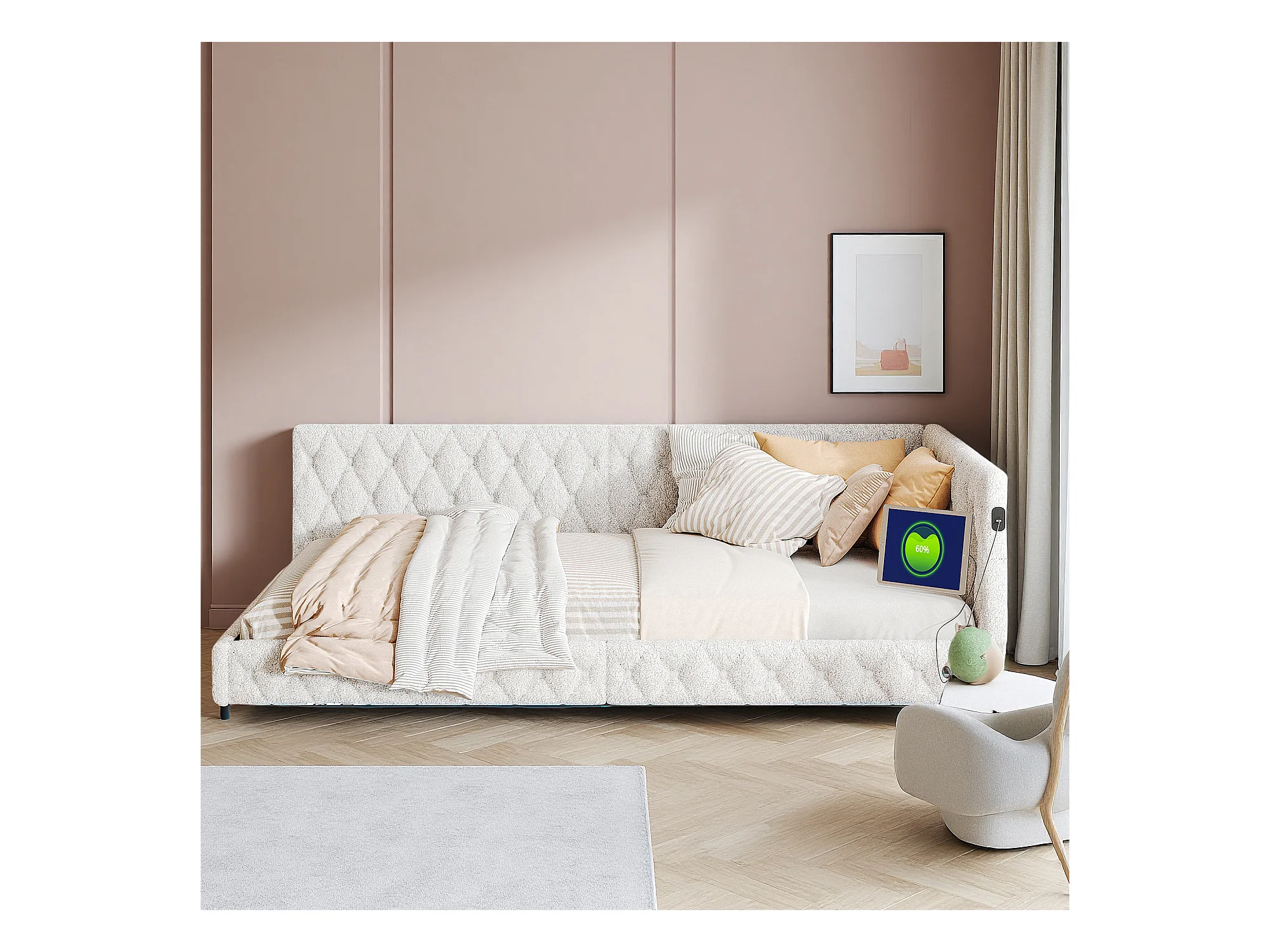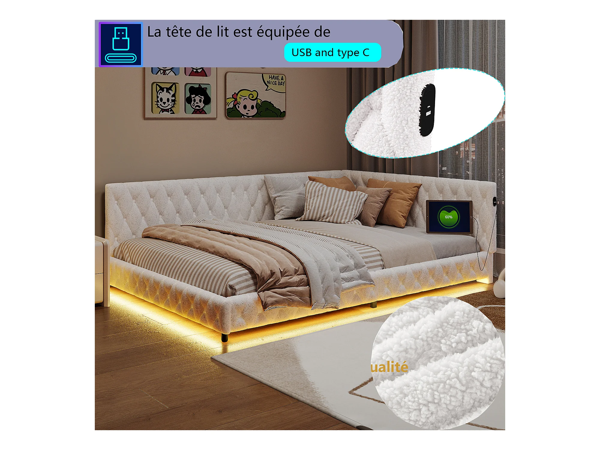 Lit 140x200 cm - NEXU - canapé lit 140x200 cm avec LED et USB - lit double 140x200 cm avec sommier à lattes - tissu en velours - beige