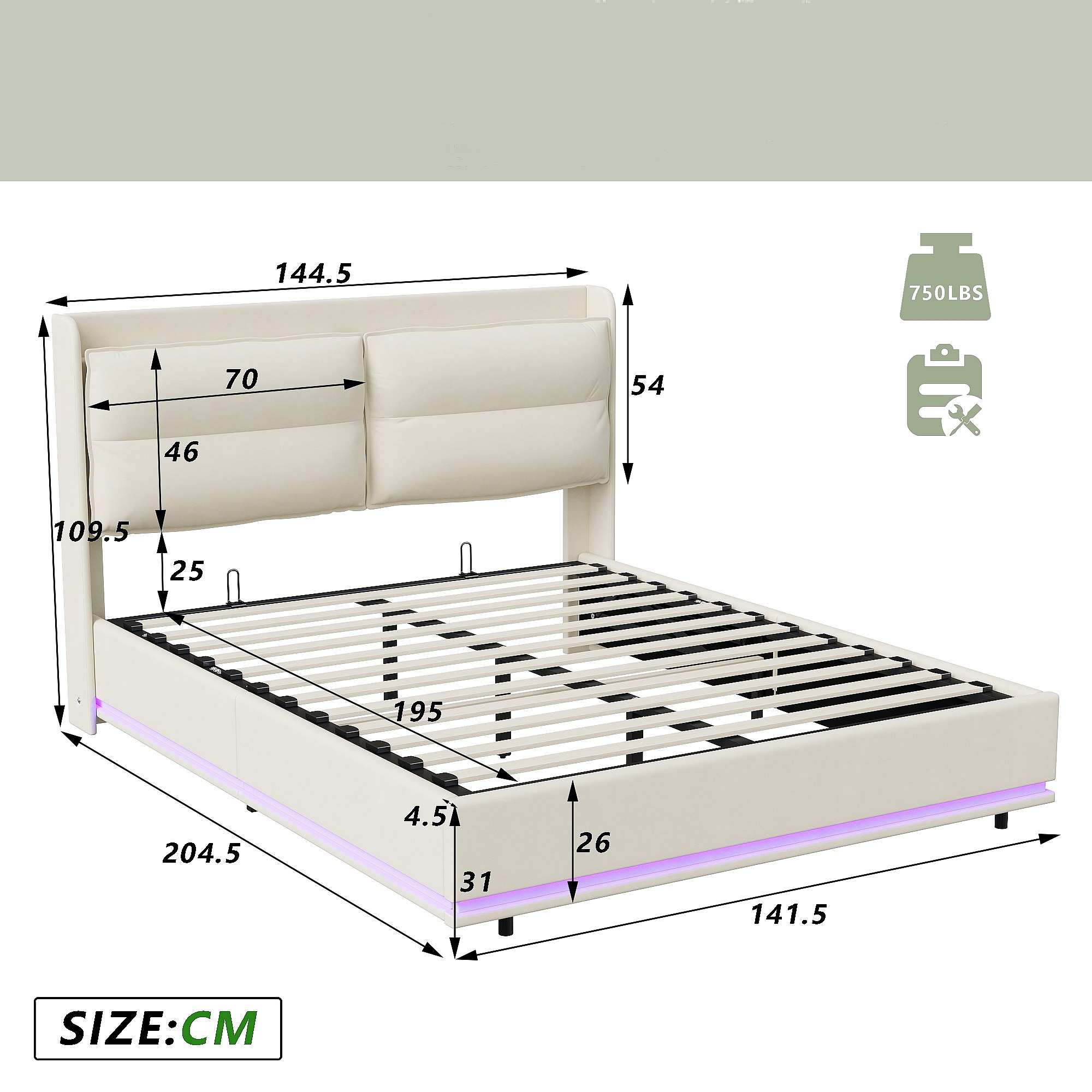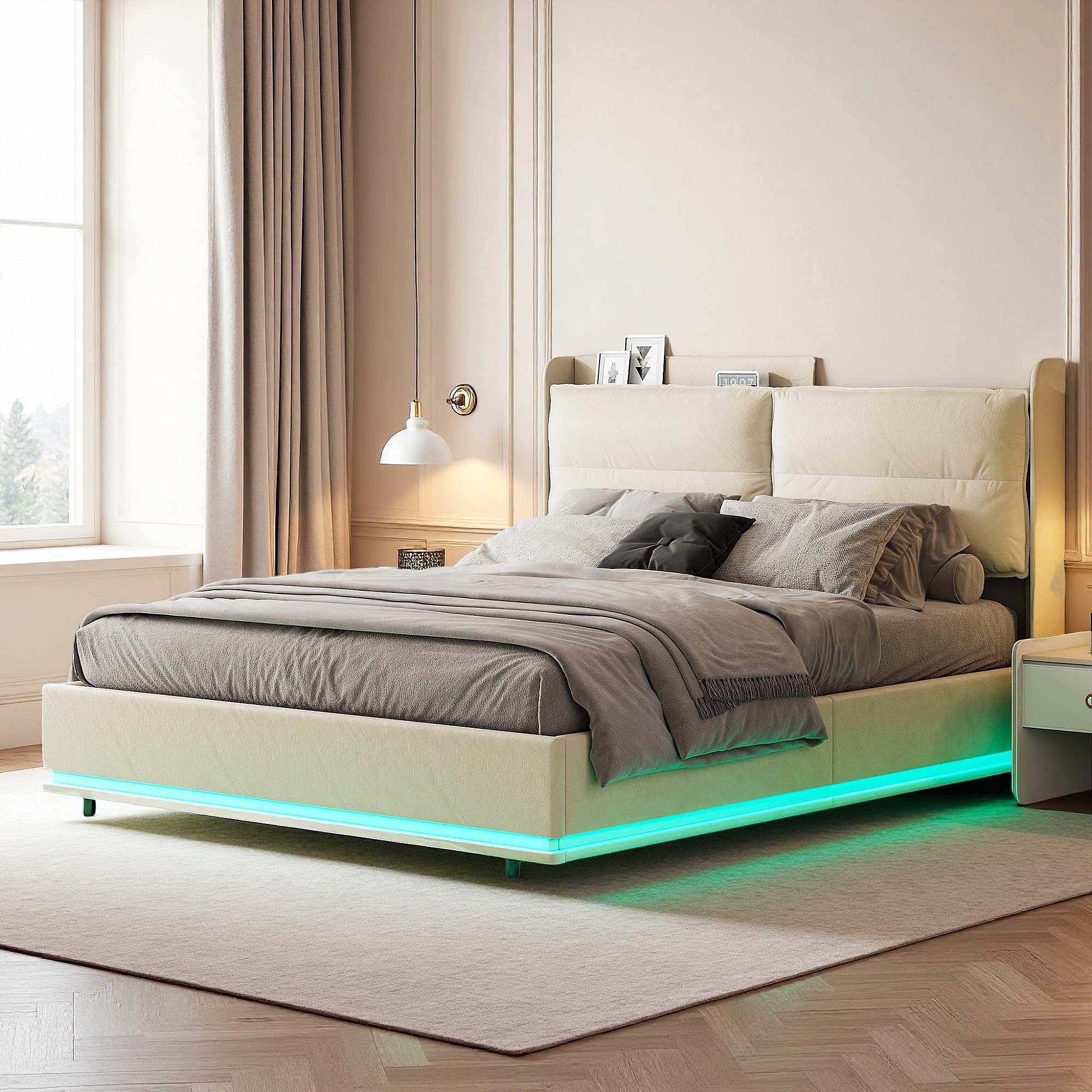 Lit 140x200 cm - NEXU - LED - Chargement sans fil - lit 140x200 cm tissu en Velours - cadre de lit coffre 140x200 cm - blanc cassé