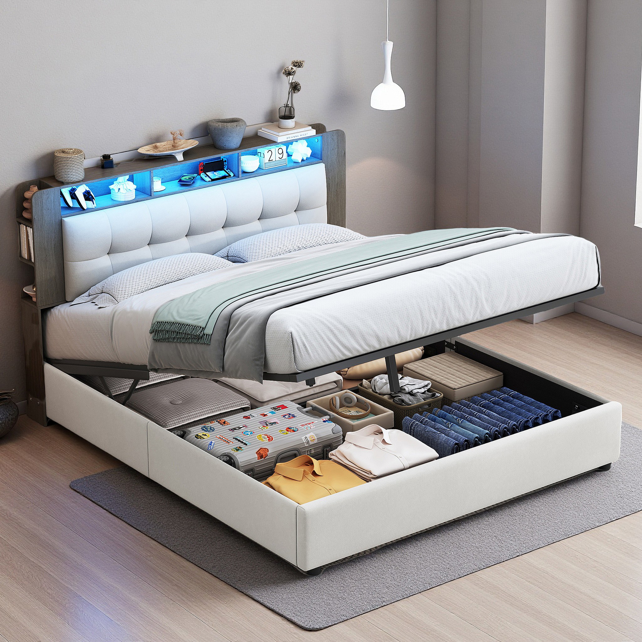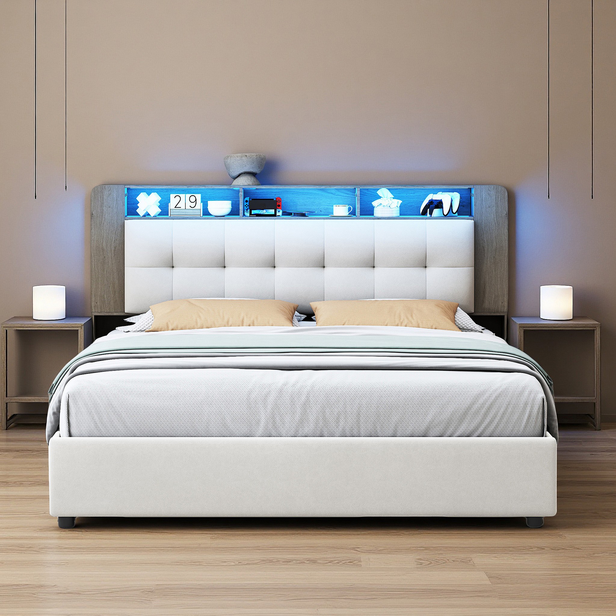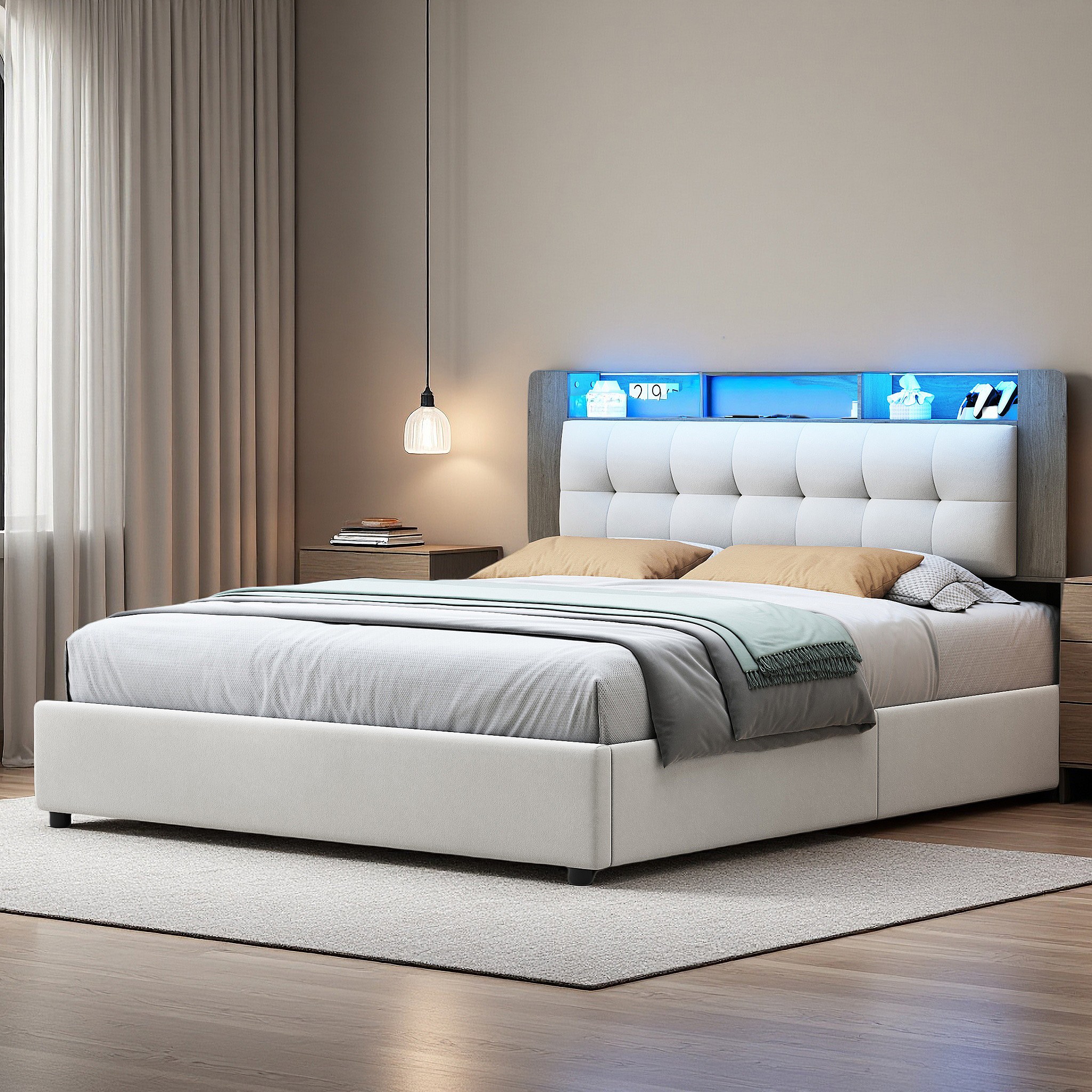Lit 140x200 cm - NEXU - Led - Chargement sans fil - lit 140x200 cm tissu en velours - cadre de lit coffre 140x200 cm - blanc cassé