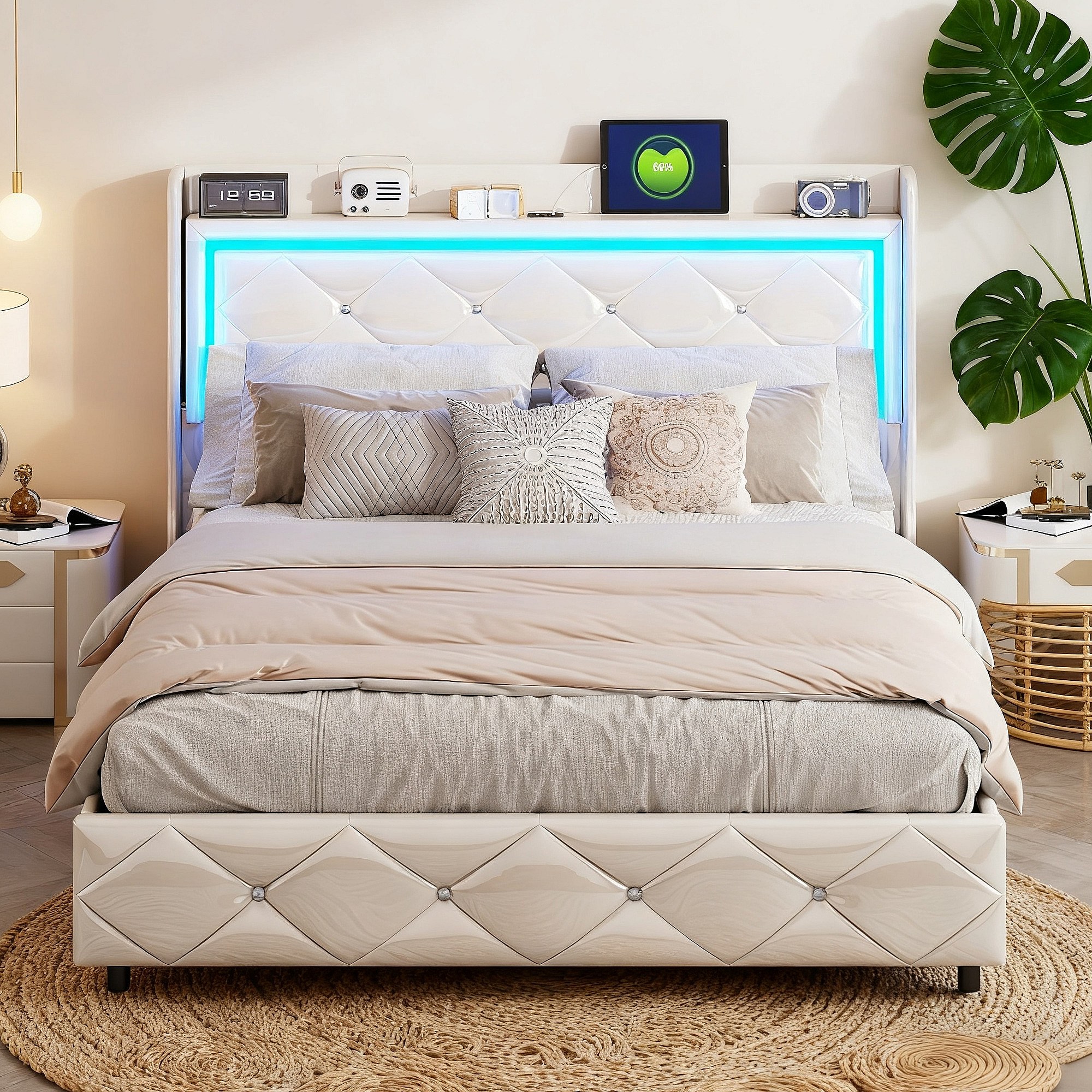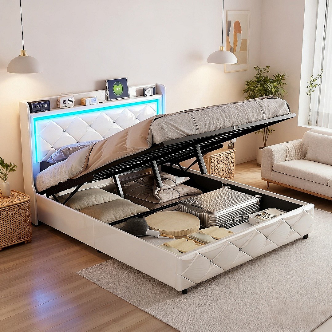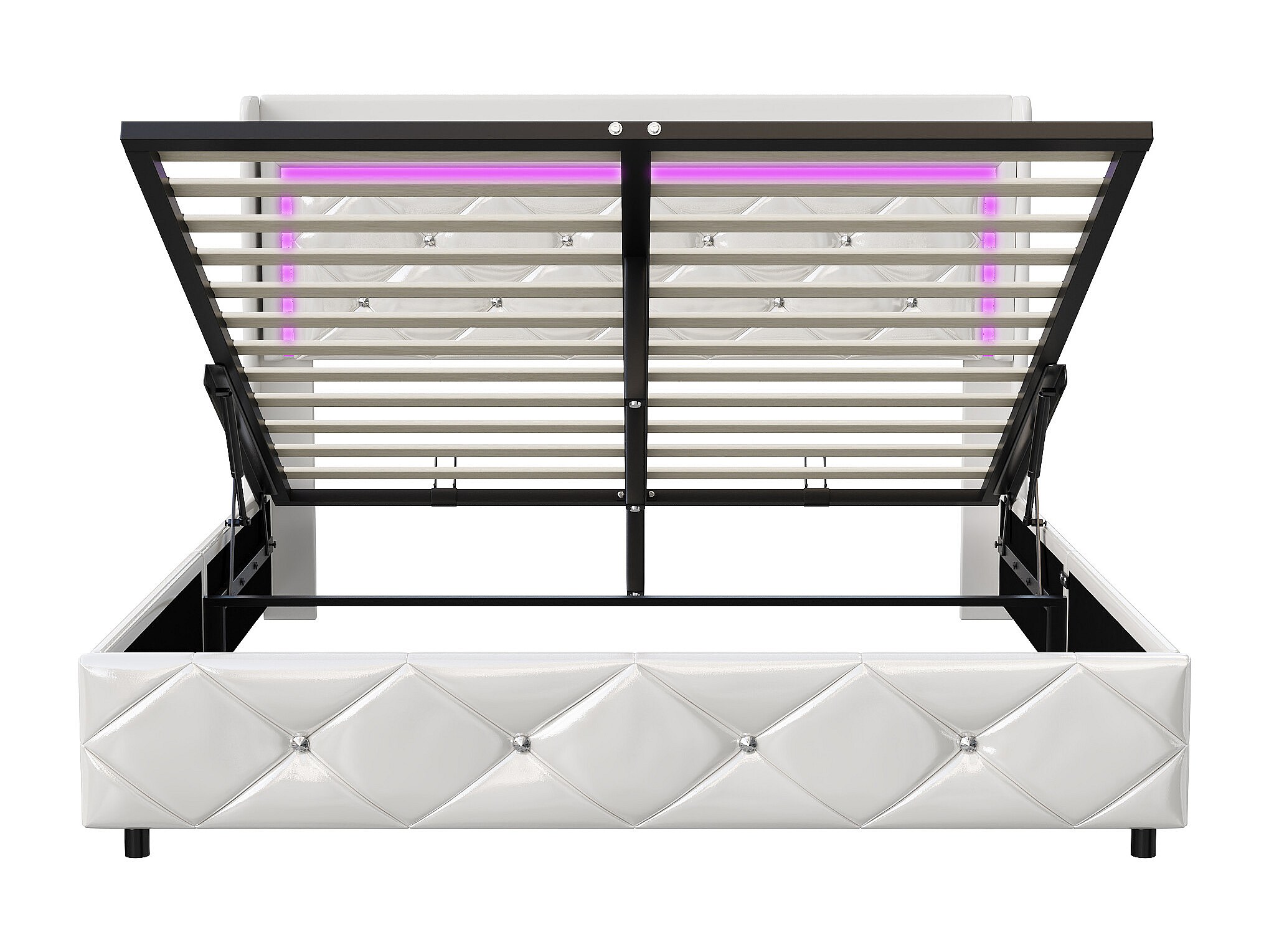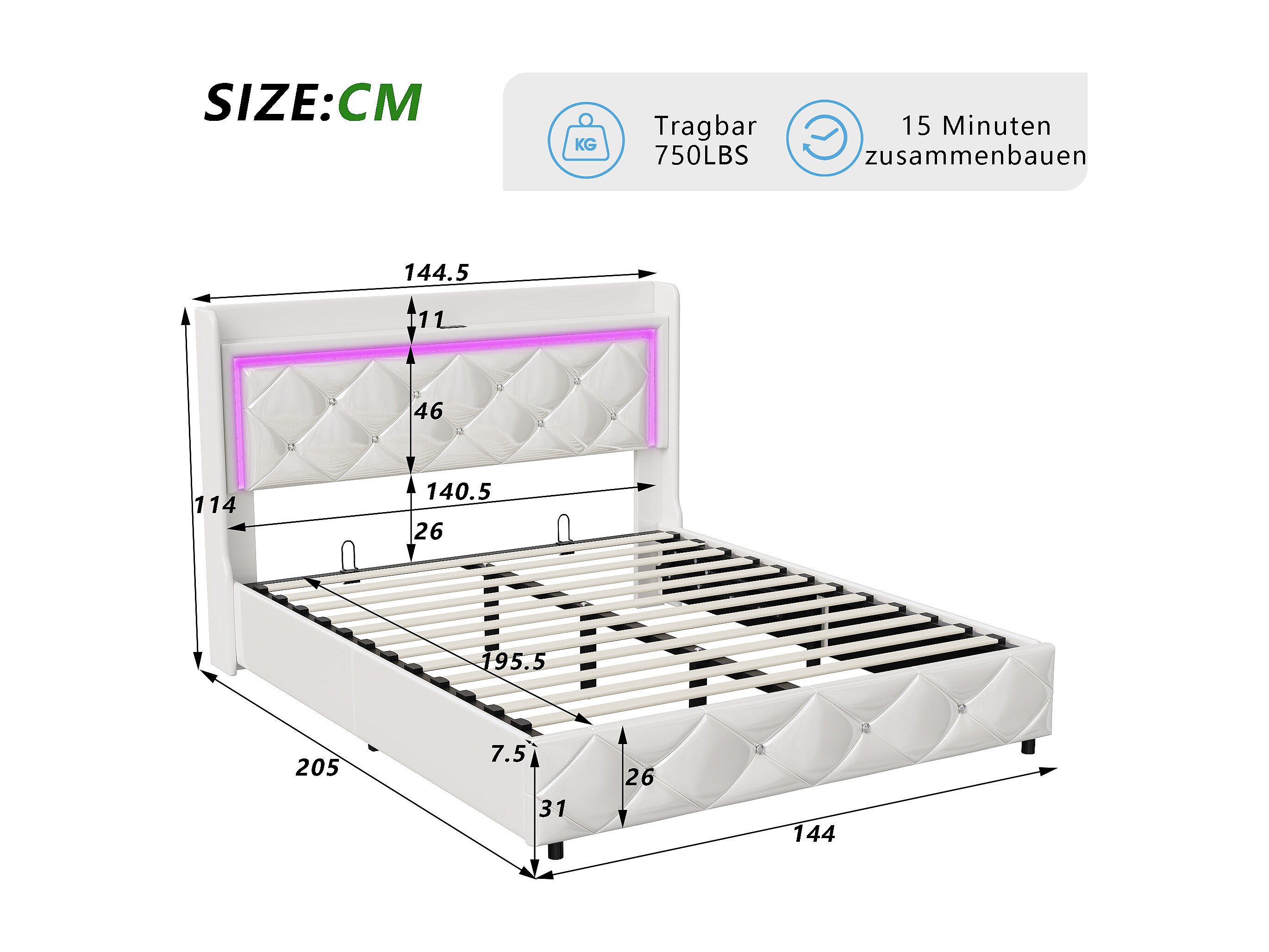 Lit 140x200 cm - NEXU - LED - sommier à lattes - tissu en PU - cadre de lit coffre 140x200 cm - blanc
