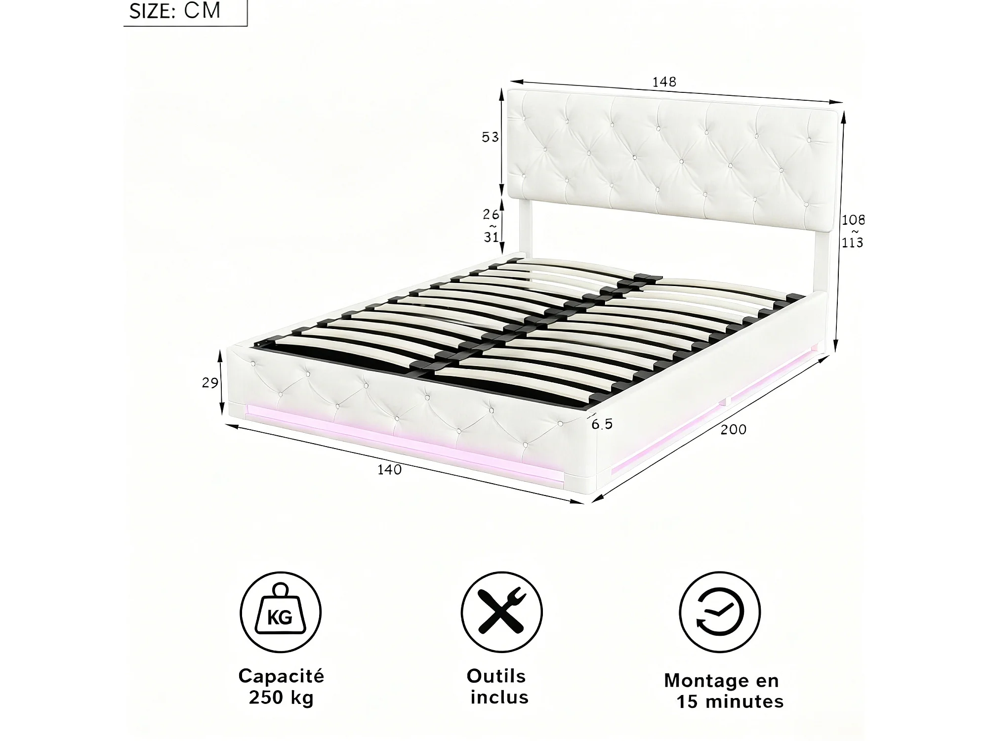 Lit coffre adulte 140x200 cm - sommier à lattes - LED - lit tissu en lin - tête de lit réglable - Lit Capitonné et Boutons - blanc cassé