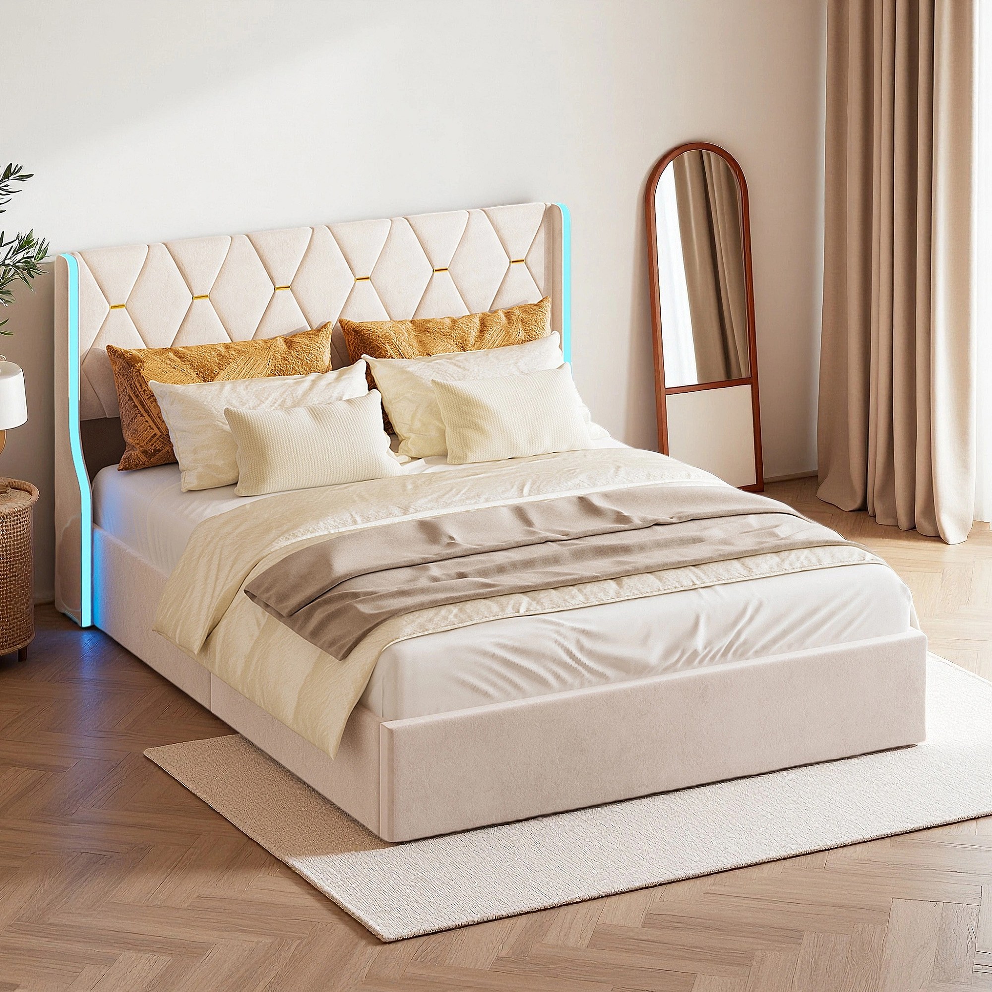 Lit 140x200 cm - NEXU - LED - tissu en velours - cadre de lit coffre 140x200 cm - beige