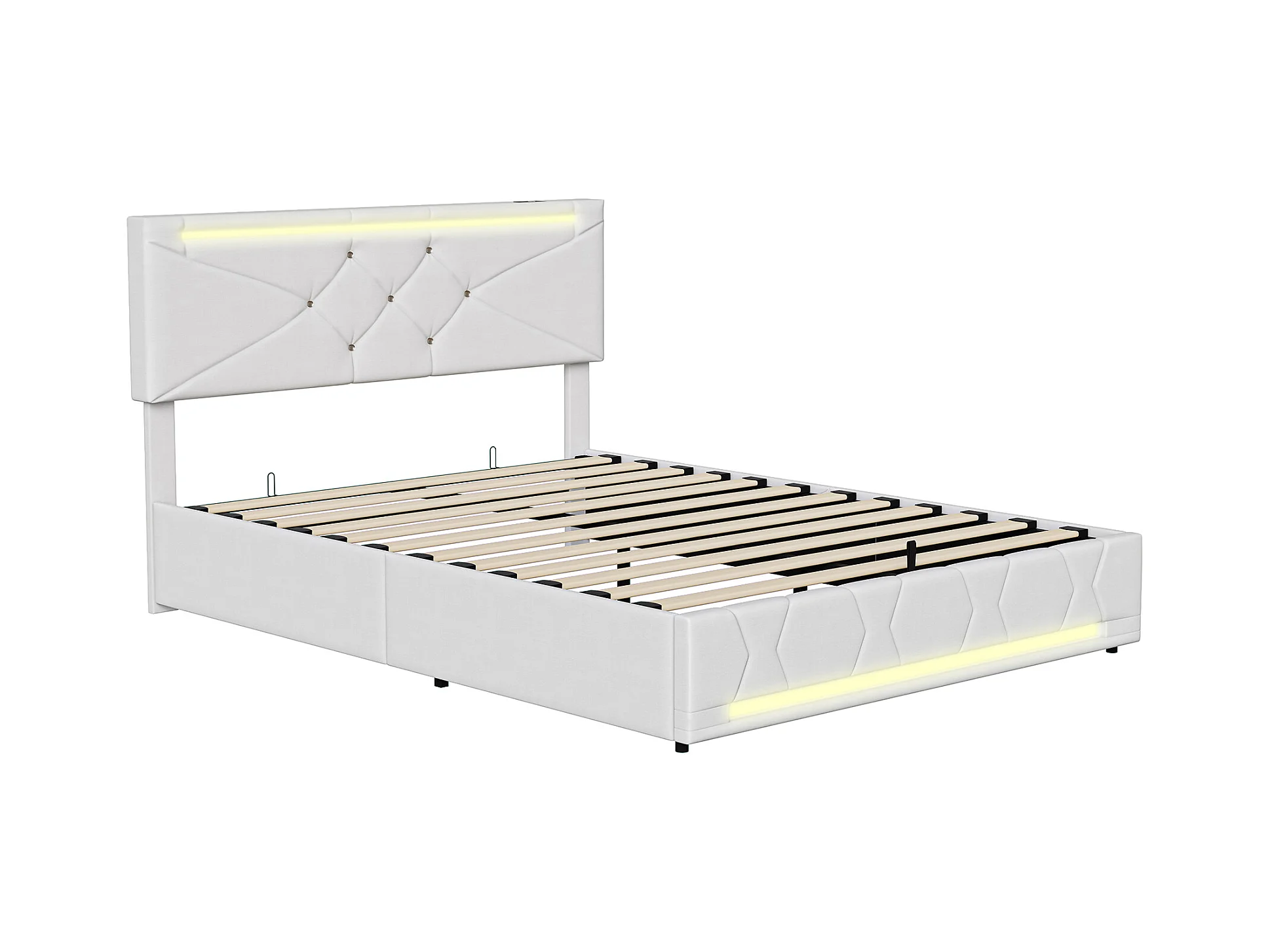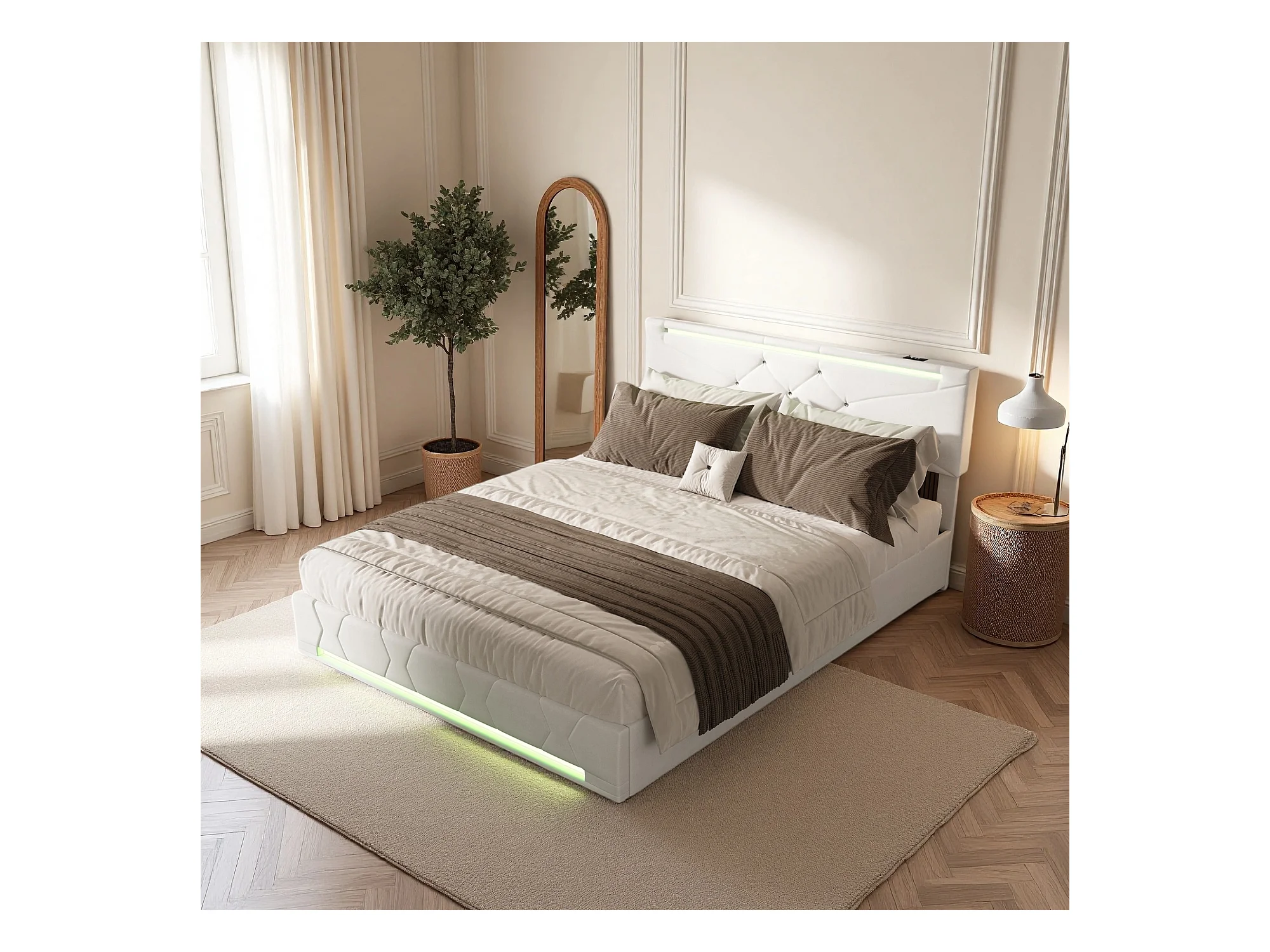 Lit 140x200 cm - NEXU - LED - USB - lit 140x200 cm tissu en Lin -cadre de lit coffre 140x200 cm - beige